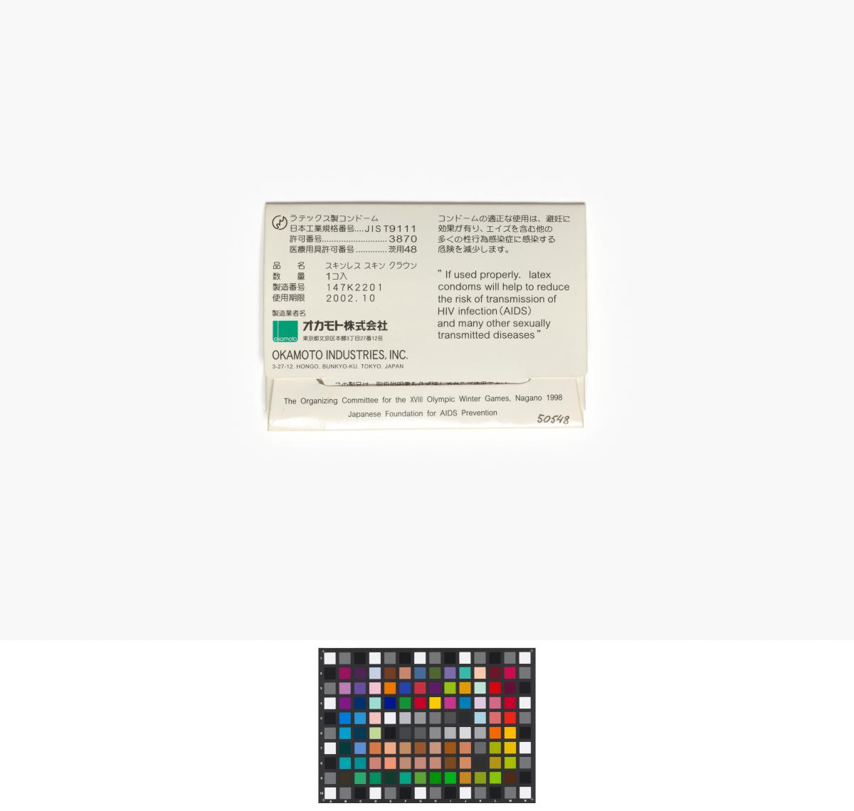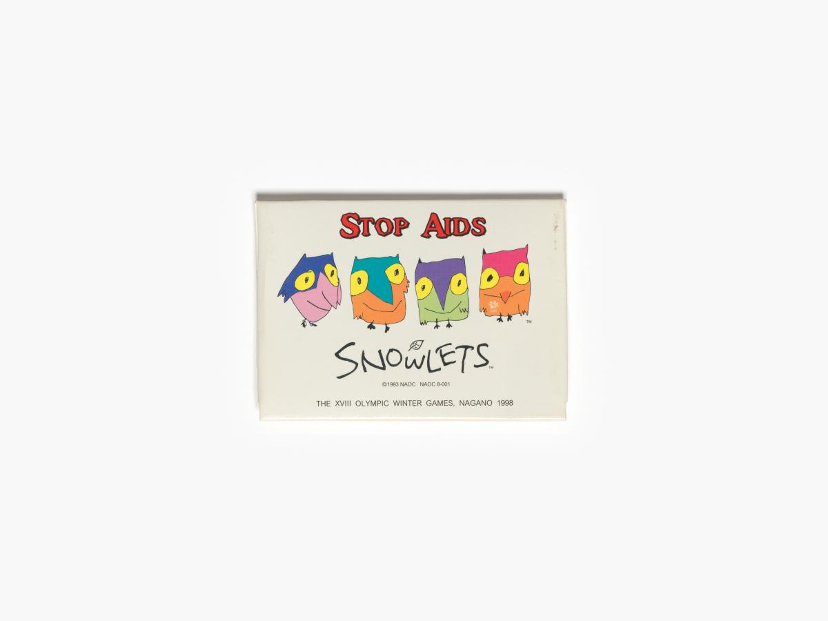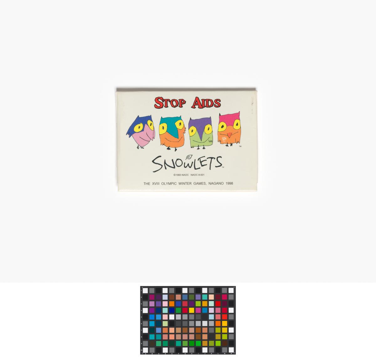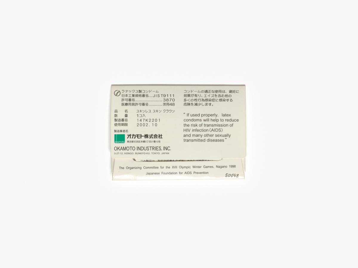 Préservatif "skinless" dans un étui en carton avec les Snowlets et les légendes: "Stop Aids" et "The XVIII Olympic Winter Games Nagano 1998". Mode d'emploi en japonais à l'intérieur de l'étui.