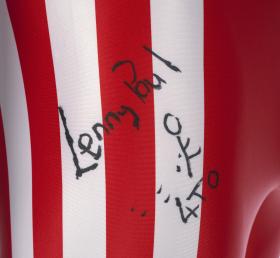 Combinaison rouge. Taille XXL. Combinaison dédicacée "Lenny PAUL" avec un petit bonhomme dessiné et "4 TO" à 2 endroits. Une fois sur la poitrine et une fois sur la cuisse.