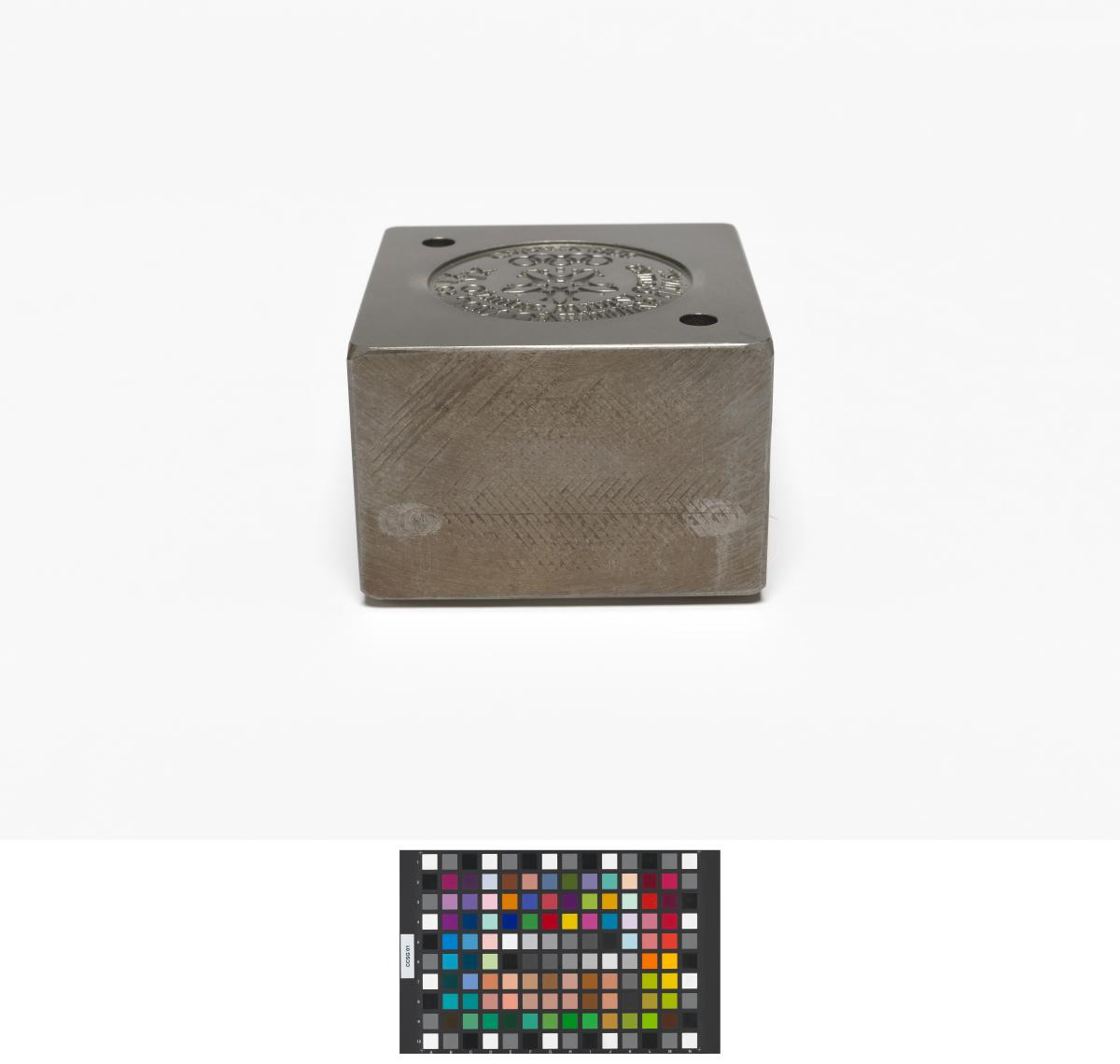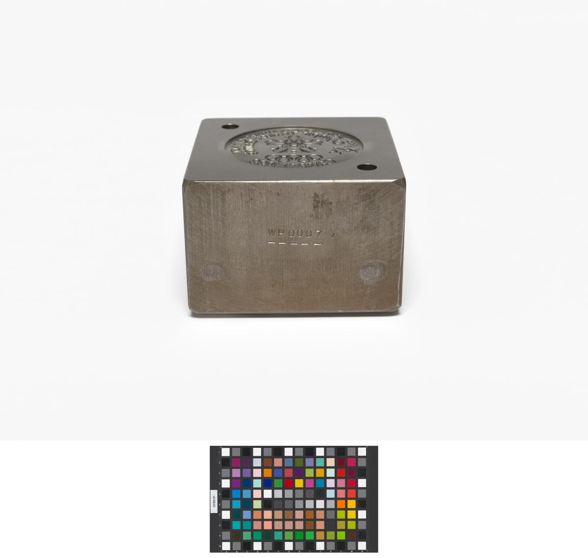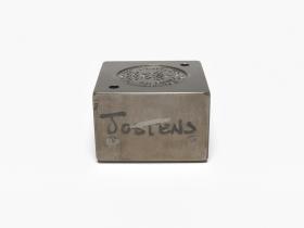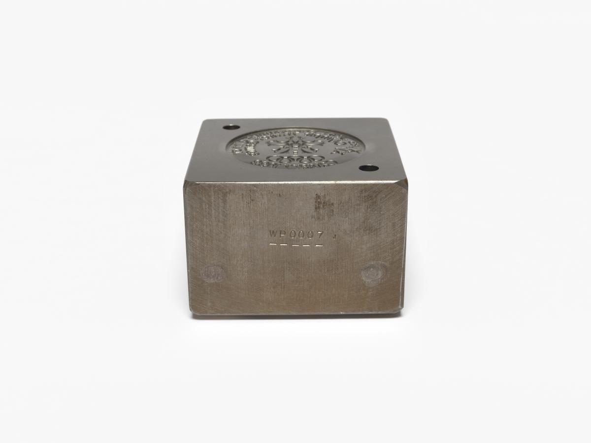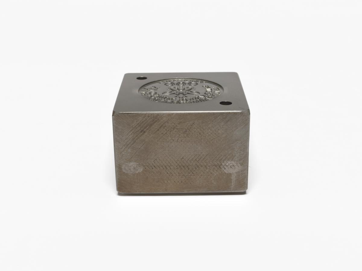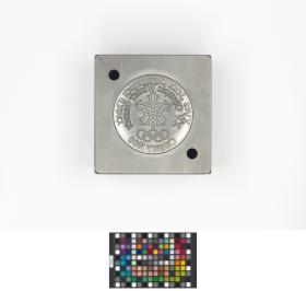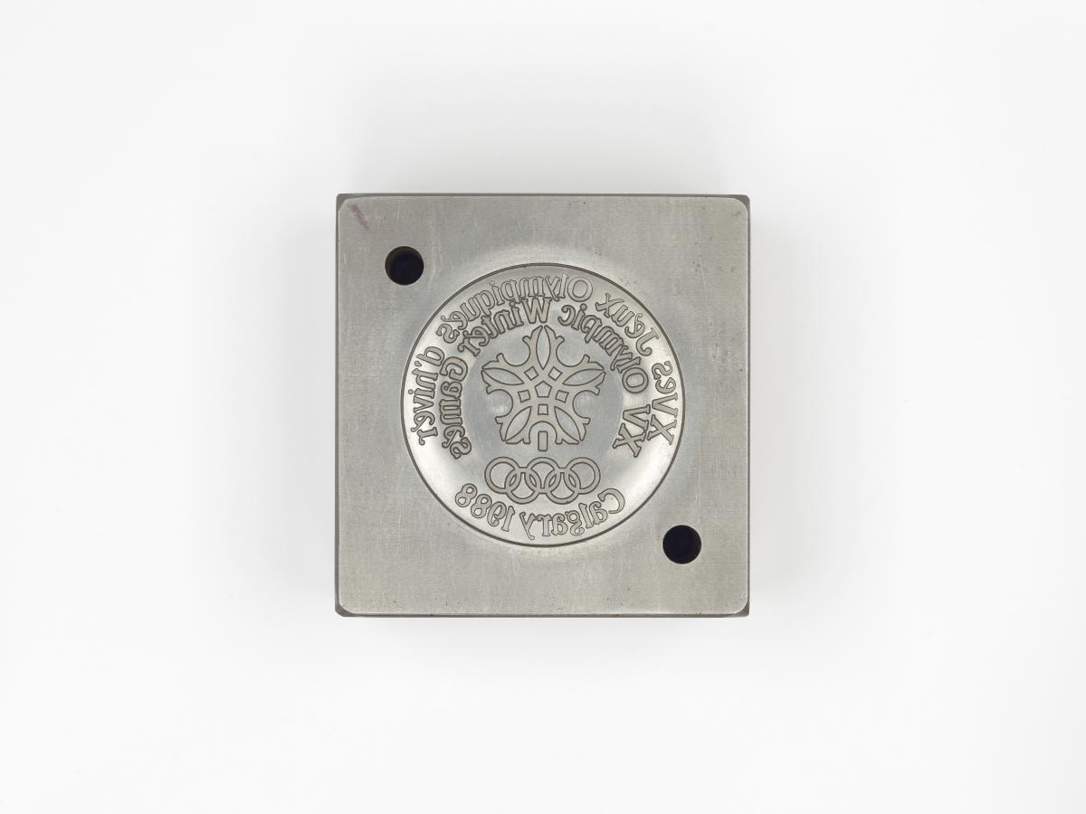 Coin carré avec l'avers de la médaille de vainqueur en creux: emblème des Jeux et légende "XVes Jeux Olympiques d'hiver / XV Olympic Winter Games ; Calgary 1988".