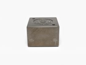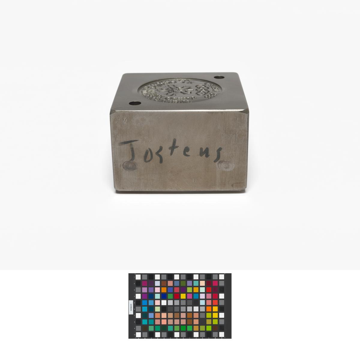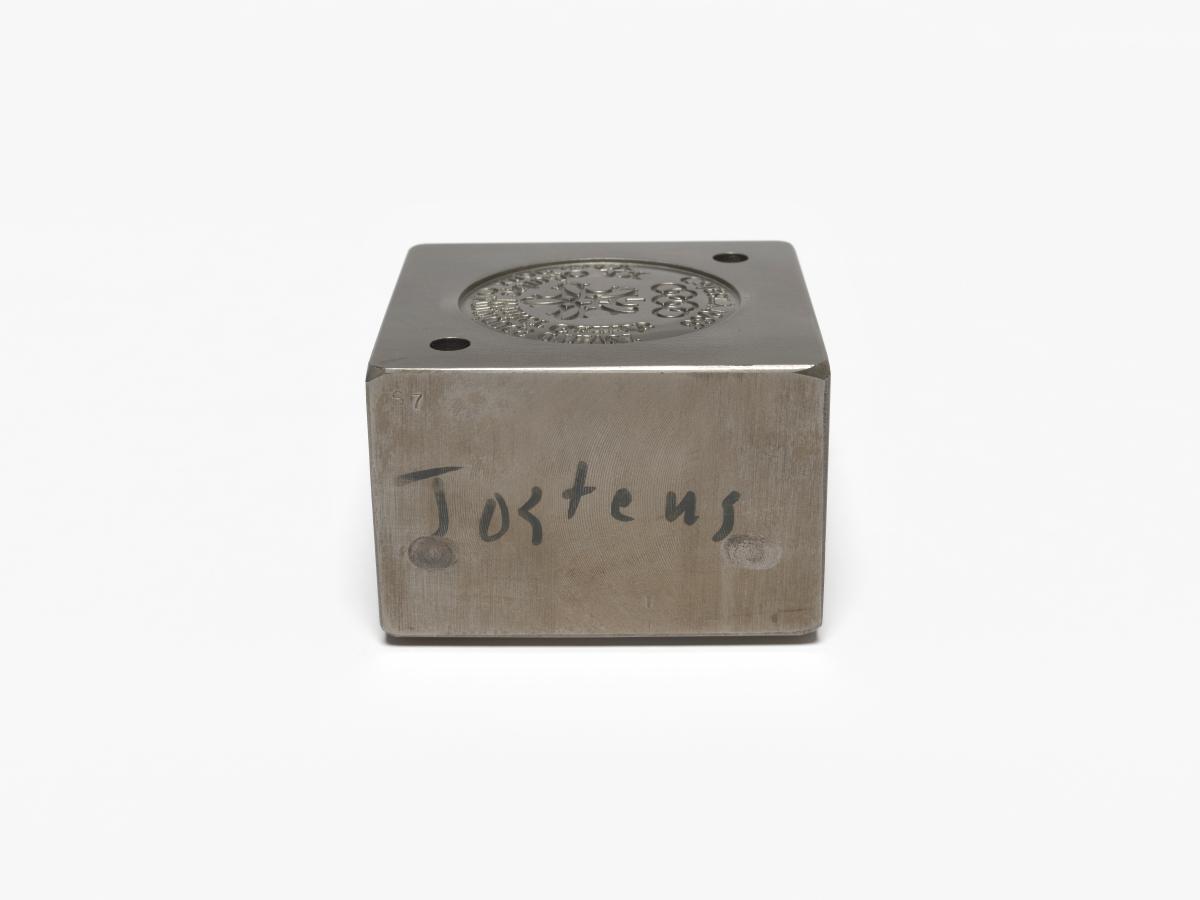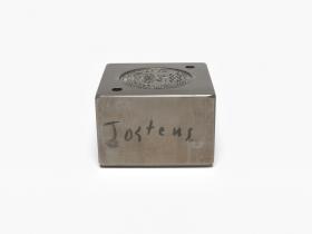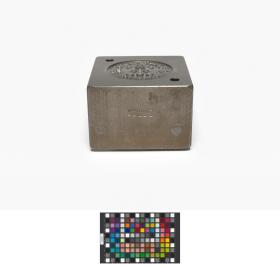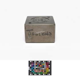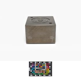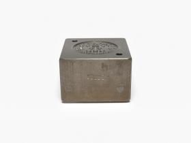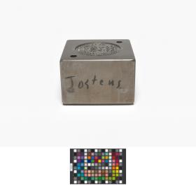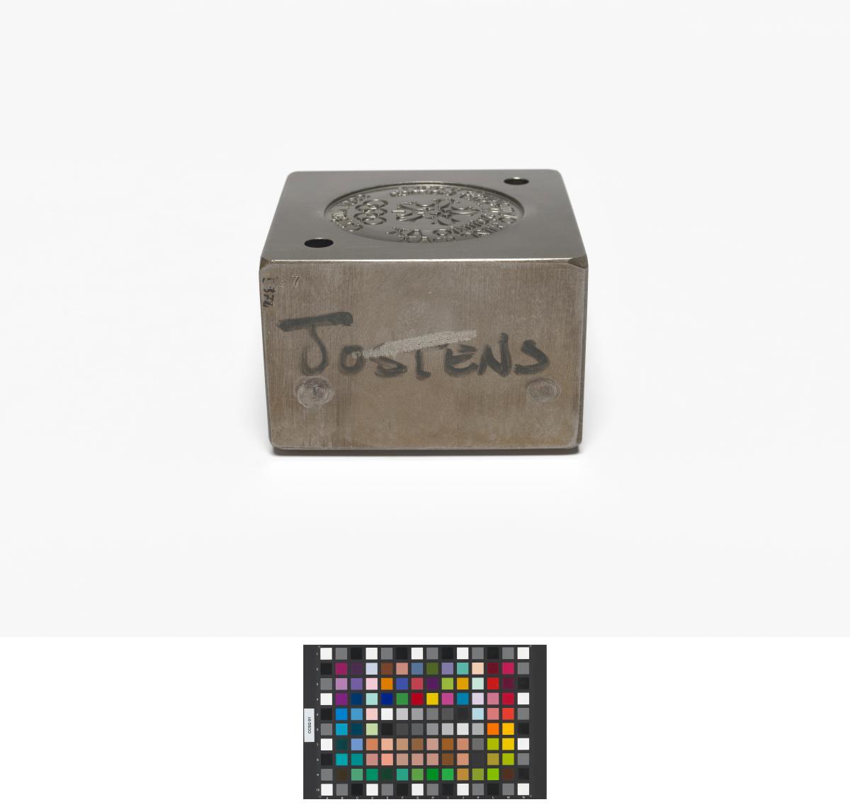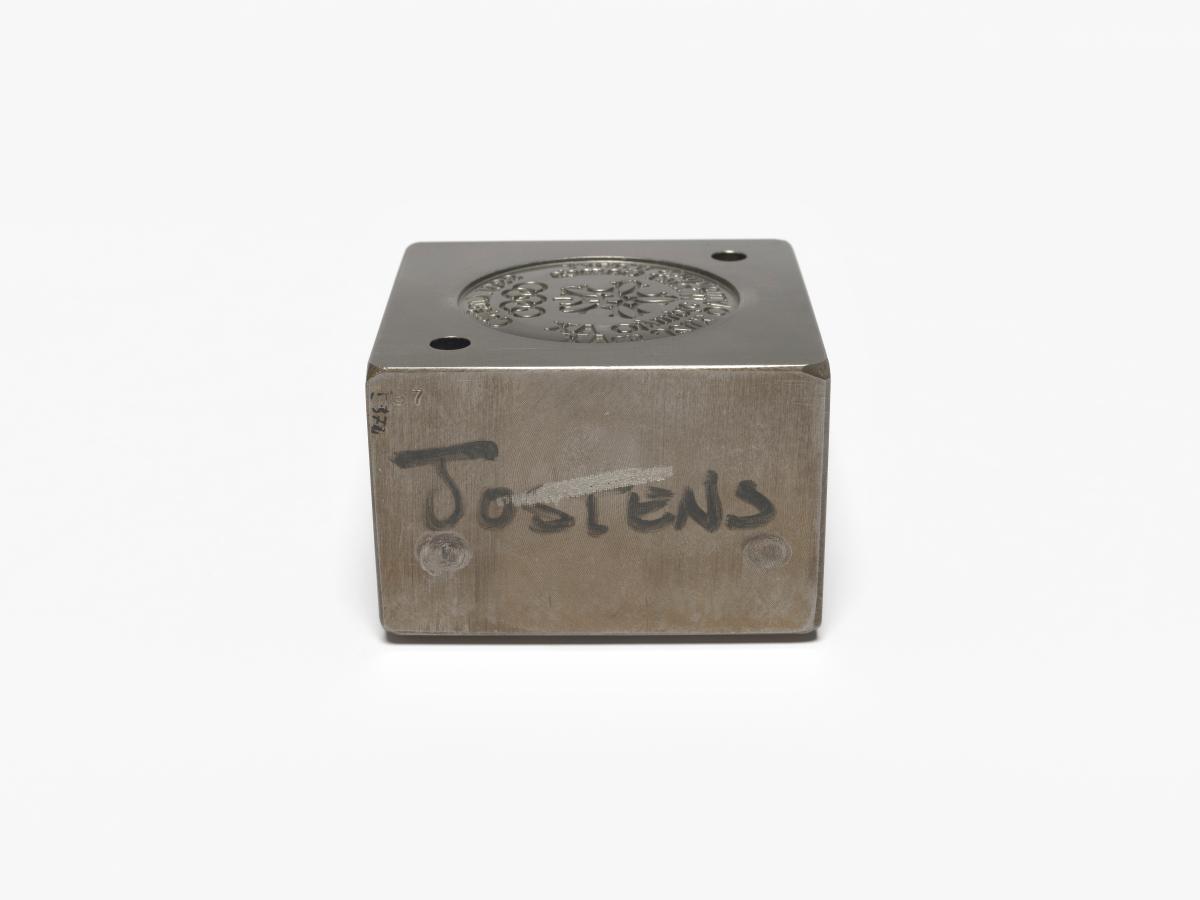 Coin carré avec l'avers de la médaille de vainqueur en creux: emblème des Jeux et légende "XVes Jeux Olympiques d'hiver / XV Olympic Winter Games ; Calgary 1988".