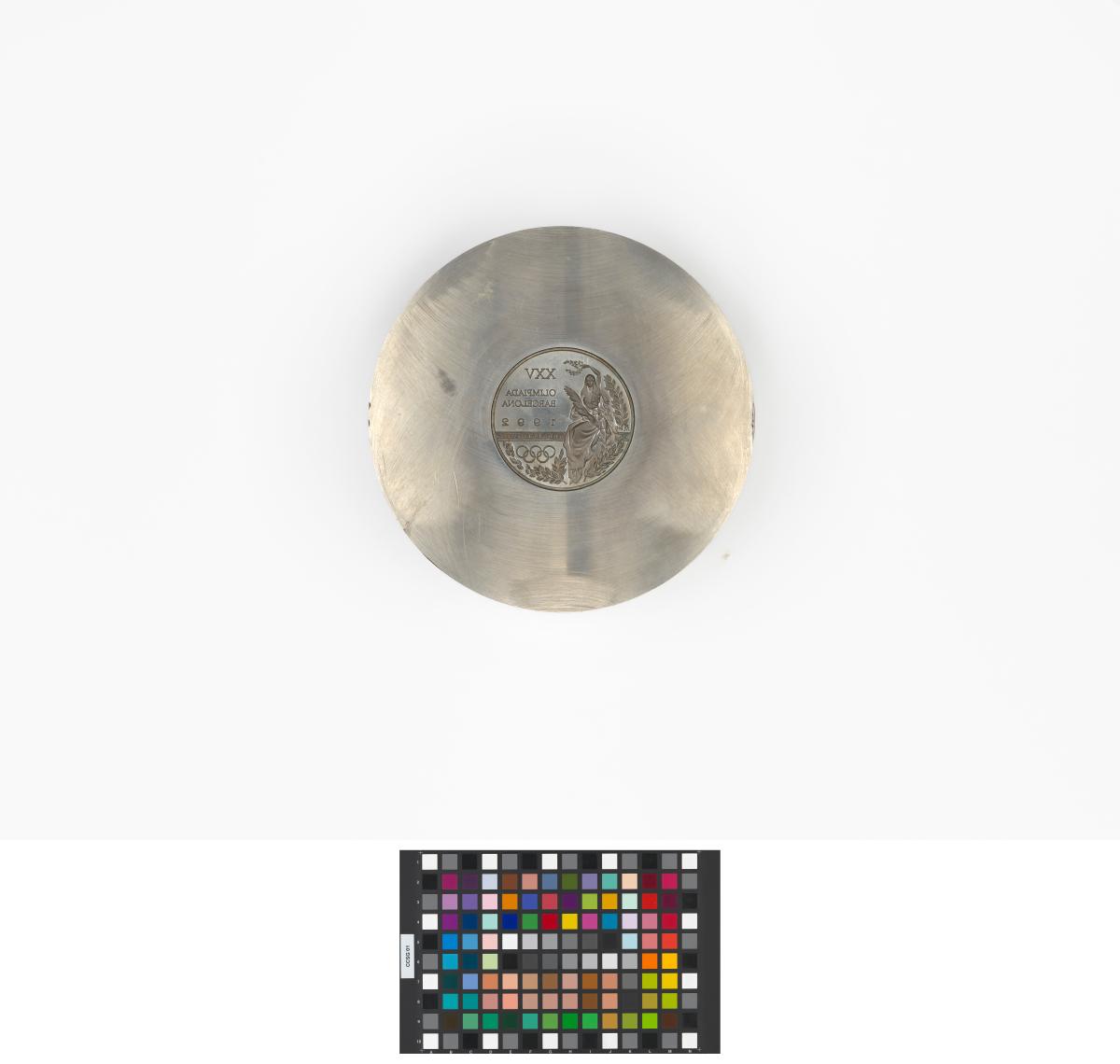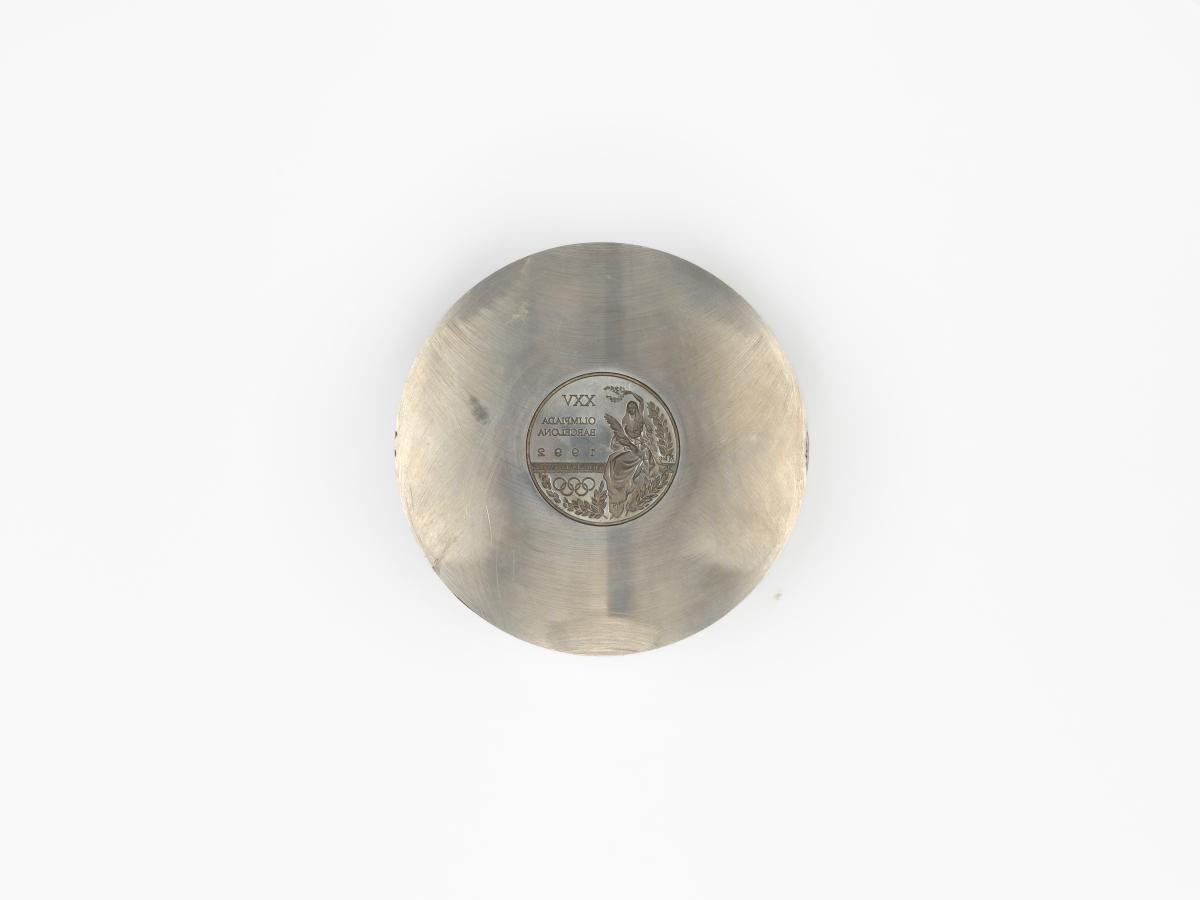 Avers de la médaille de vainqueur en creux: déesse de la victoire tenant une couronne de laurier. Légende: "XXV / OLYMPIADA / BARCELONA / 1992"