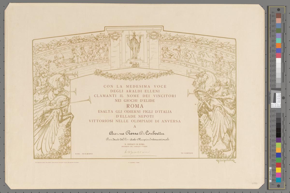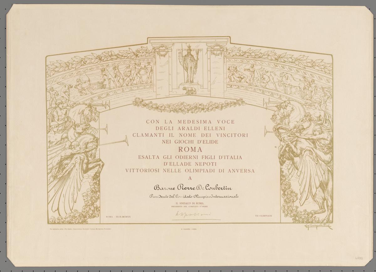 De chaque côté, des cavaliers soufflent dans des trompettes. Au centre on trouve Athèna tenant Nike dans une main et la louve romaine à ses pieds. Sur les côtés dans une frise, des athlètes antiques pratiquent différents sports. Légende: "Con la medesima voce degli araldi elleni clamanti il nome dei vincitori nei giochi d'elide, Roma esalta gli odierni figli d'Italia d'ellade nepoti vittoriosi nelle olimpiadi di Anversa a Barone Pierre de Coubertin Presidente del Comitato Olimpico Internazionale". Signé par le syndic de Rome.