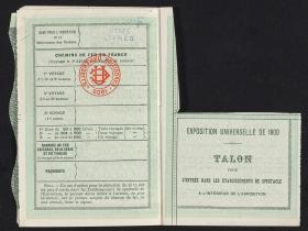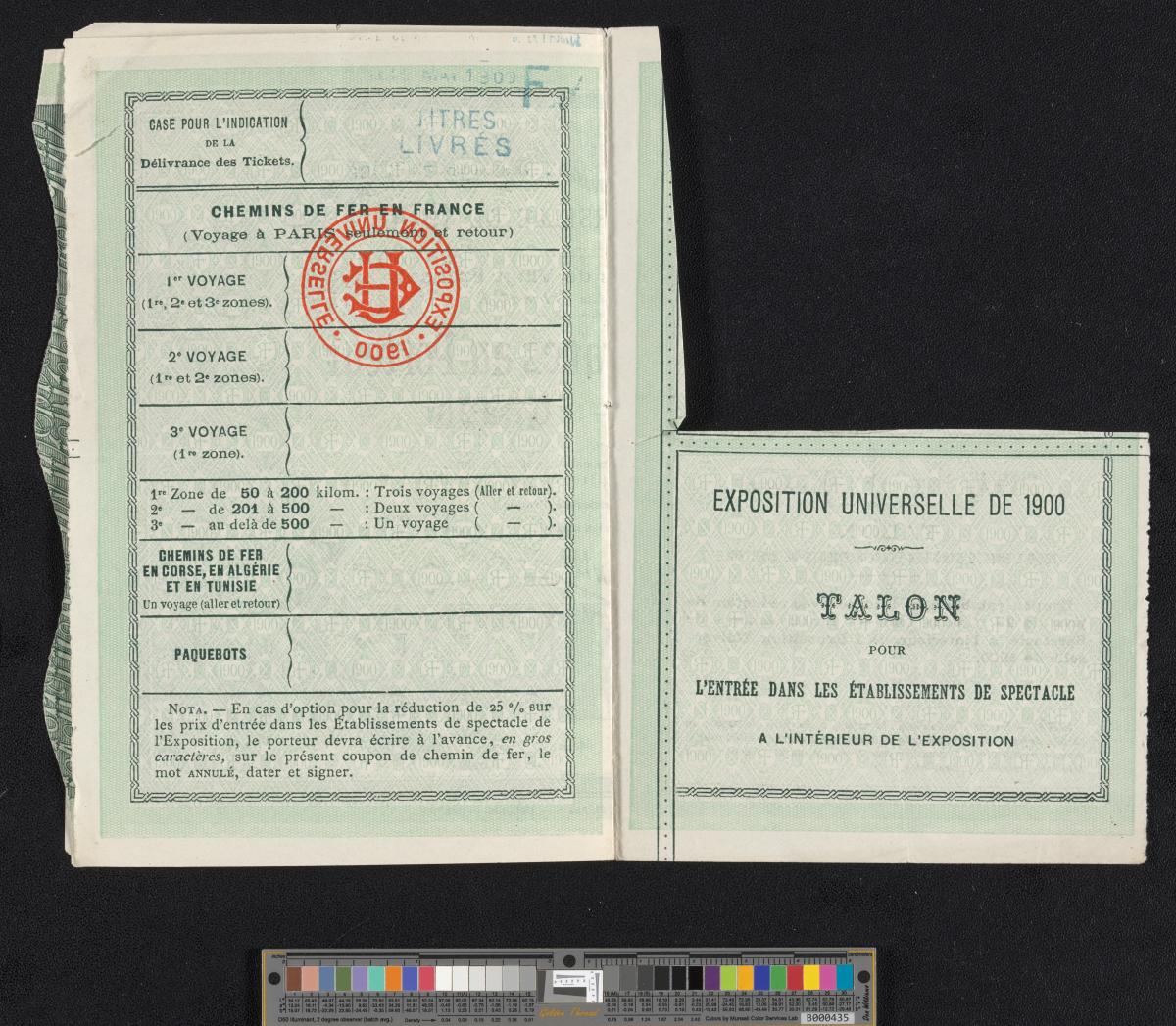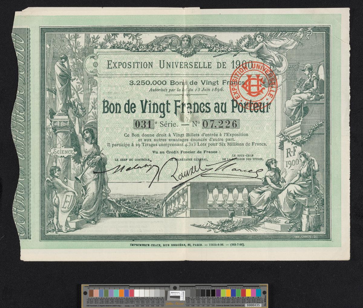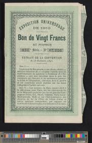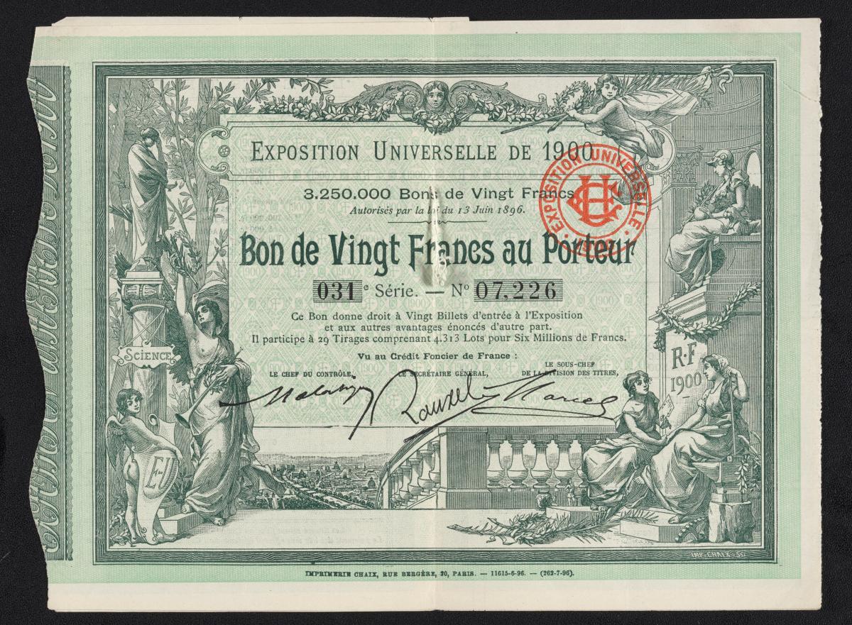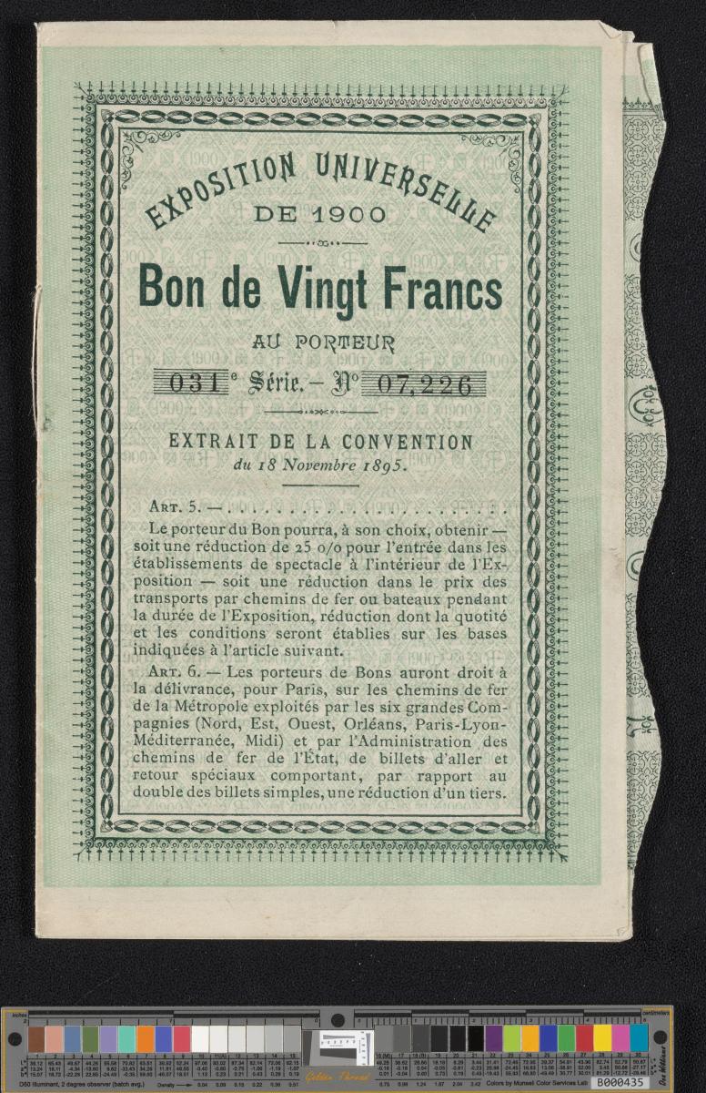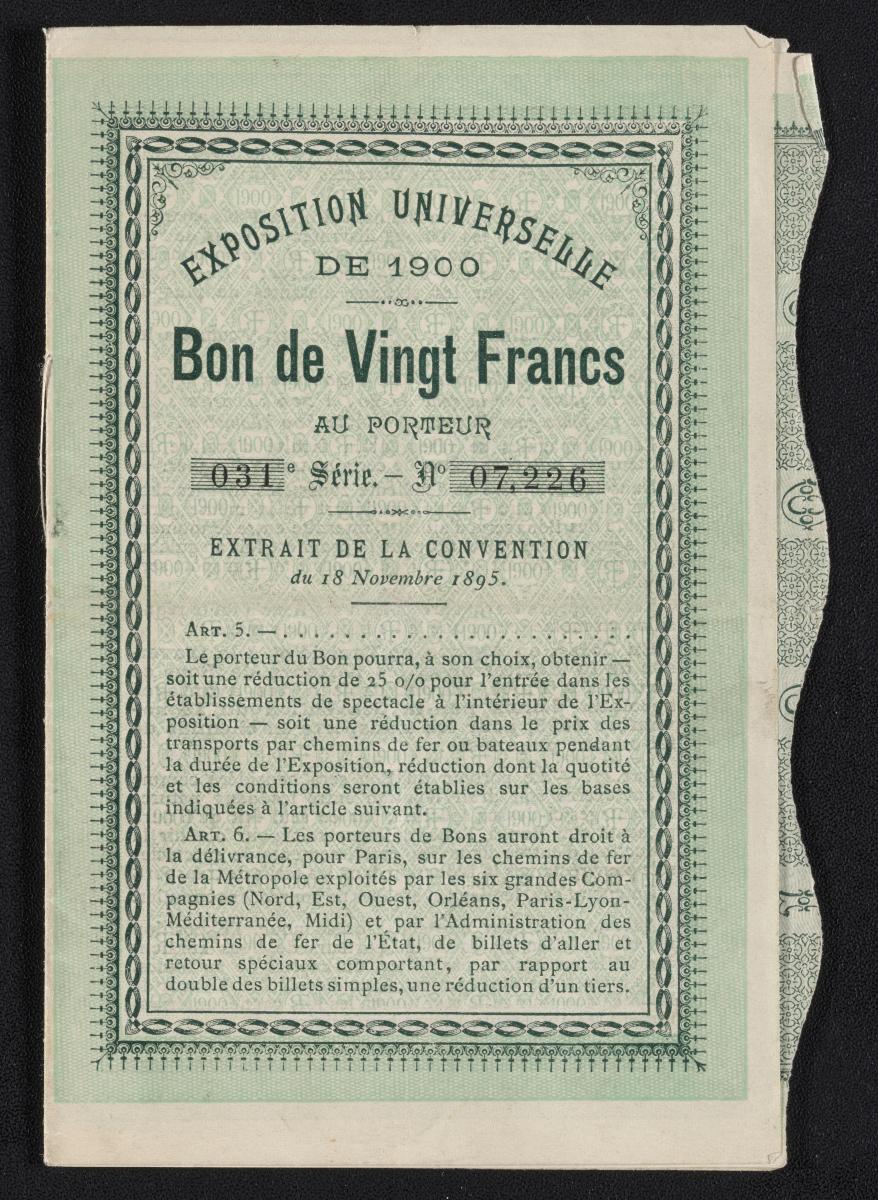 Paris 1900, bon de 20 francs au porteur, permettant une réduction soit de 25% pour une entrée à l'Exposition Universelle ou pour les transports.