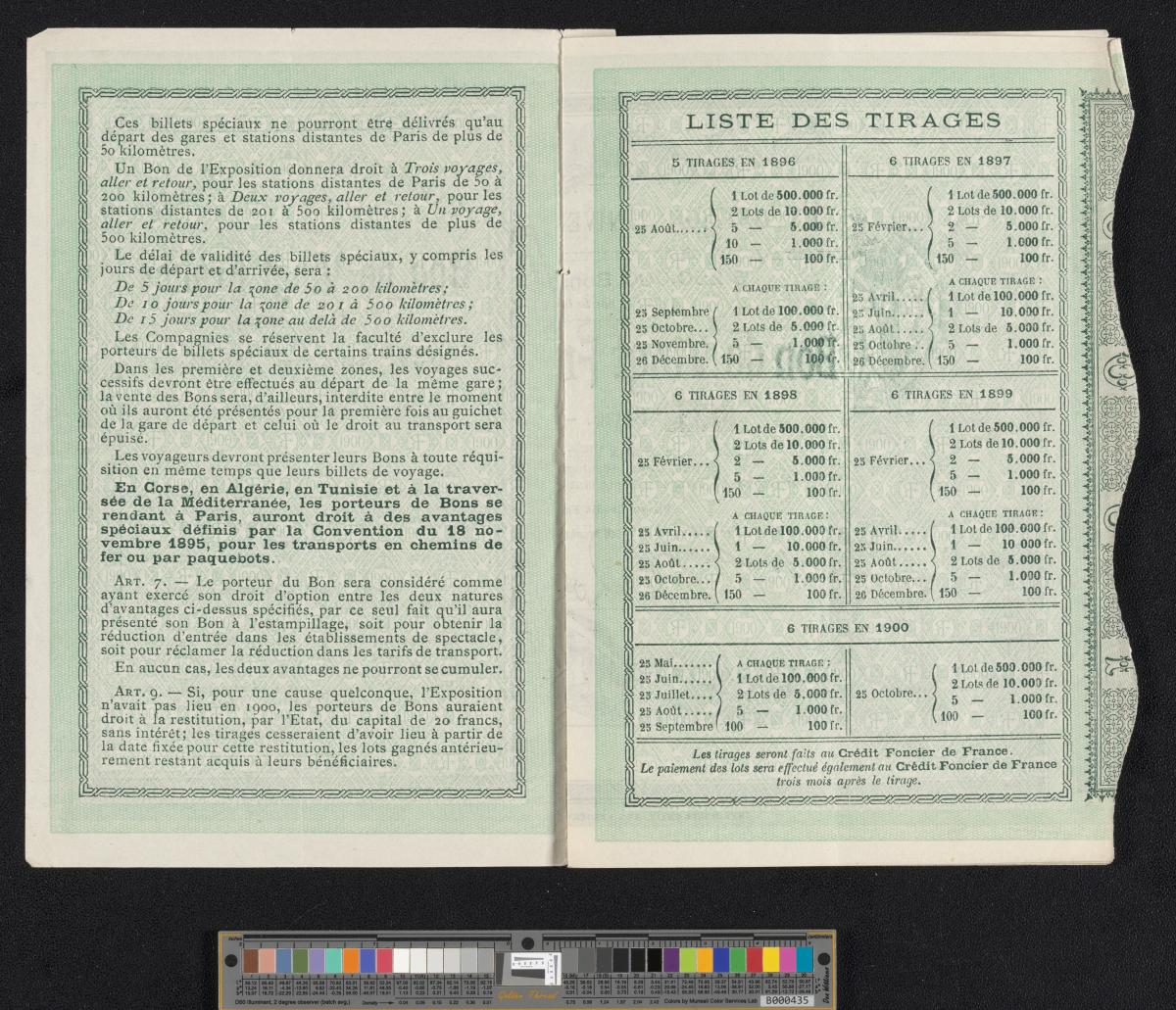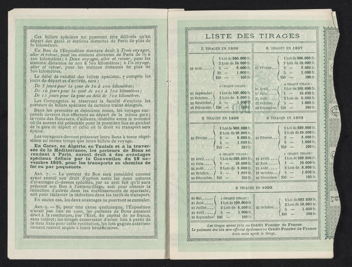 Livret de 4 pages avec textes en français du règlement, de la liste des tirages, du bon avec le sceau officiel de l'Exposition et avec une illustration, de la liste des transports et de 2 talons d'entrée.