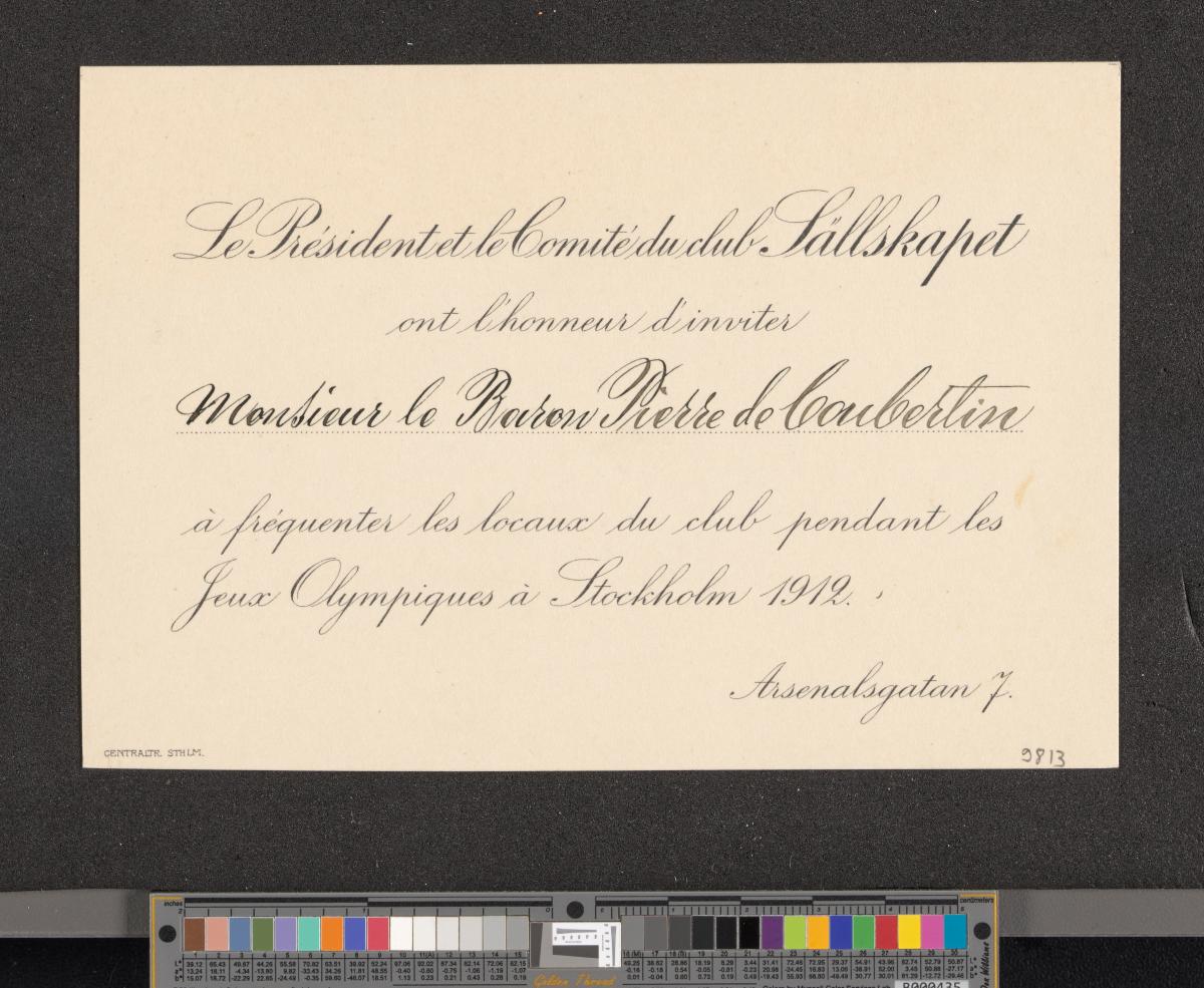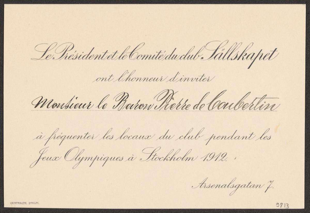 Carte d'invitation avec texte: "Le Président et le Comité du club Sällskapet / ont l'honneur d'inviter / Monsieur le Baron Pierre de Coubertin / à fréquenter les locaux du club pendant les / Jeux Olympiques à Stockholm 1912.".