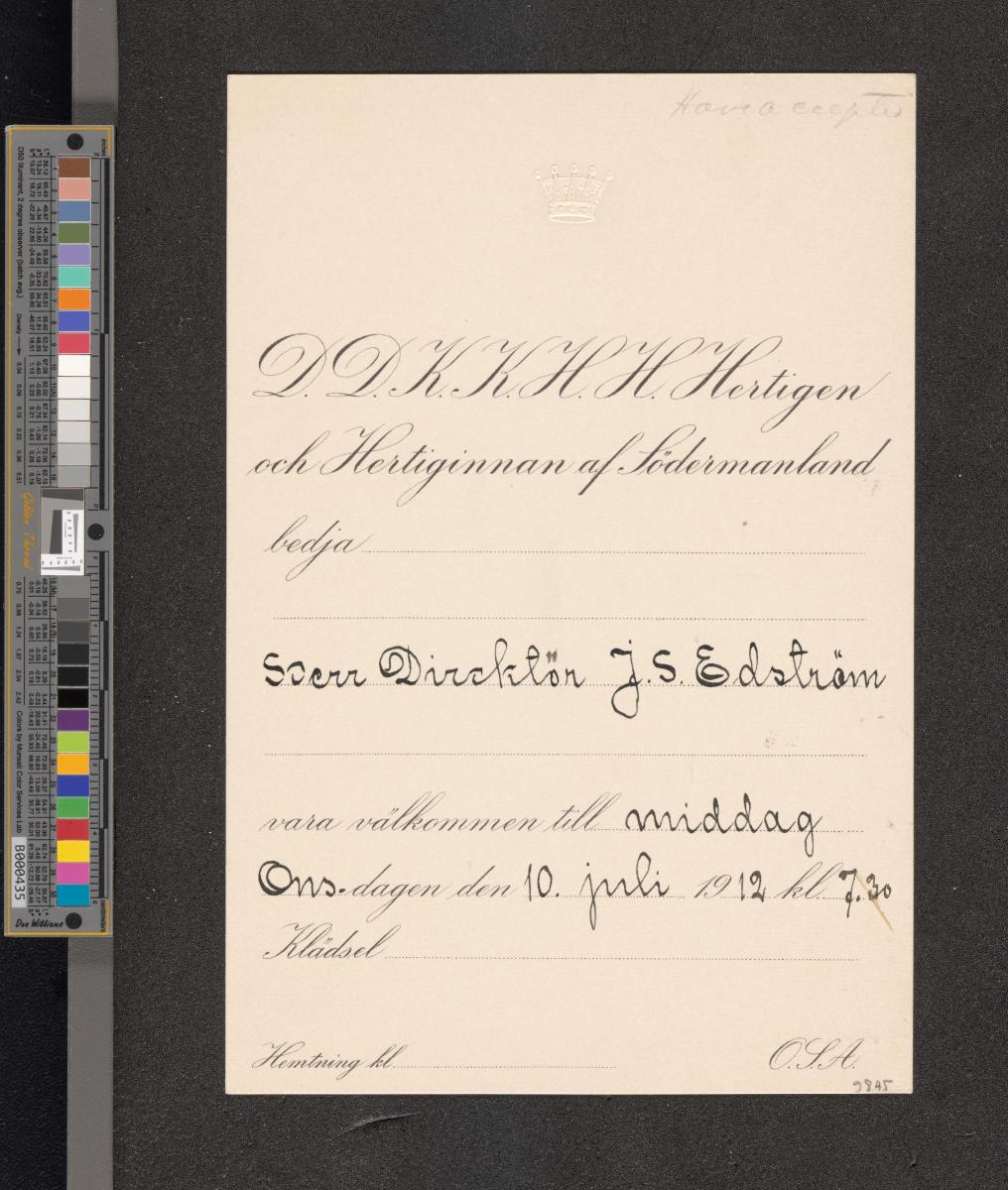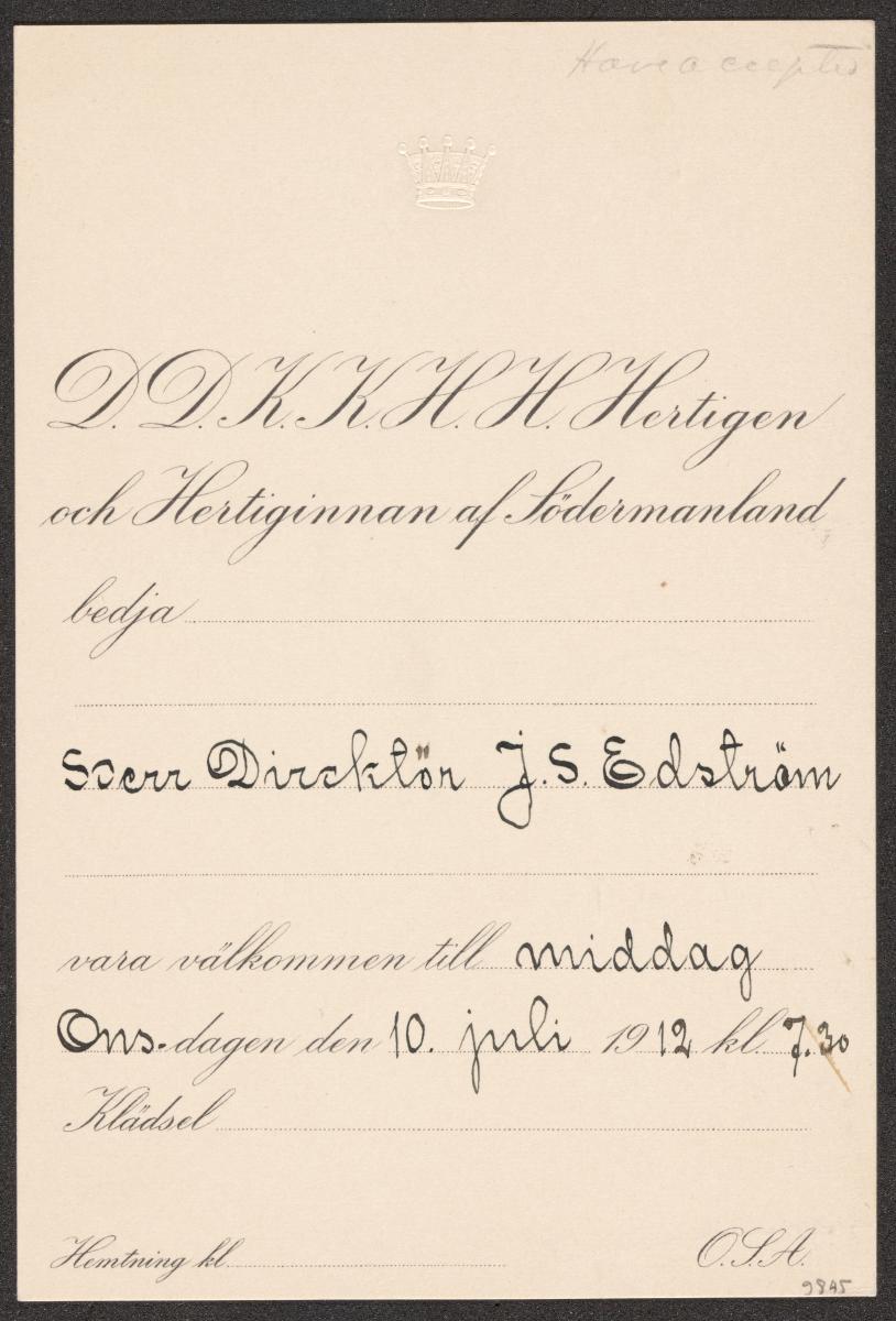 Carte rectangulaire avec une couronne gaufrée en entête, texte: "D.D.K.K.H.H.Hertigen / och Hertiginnan af Södermanland / bedja / Soerr Direktör J.S.Edström / vara välkommen till middag / Ons.dagen den 10. juli 1912 kl 7.30".