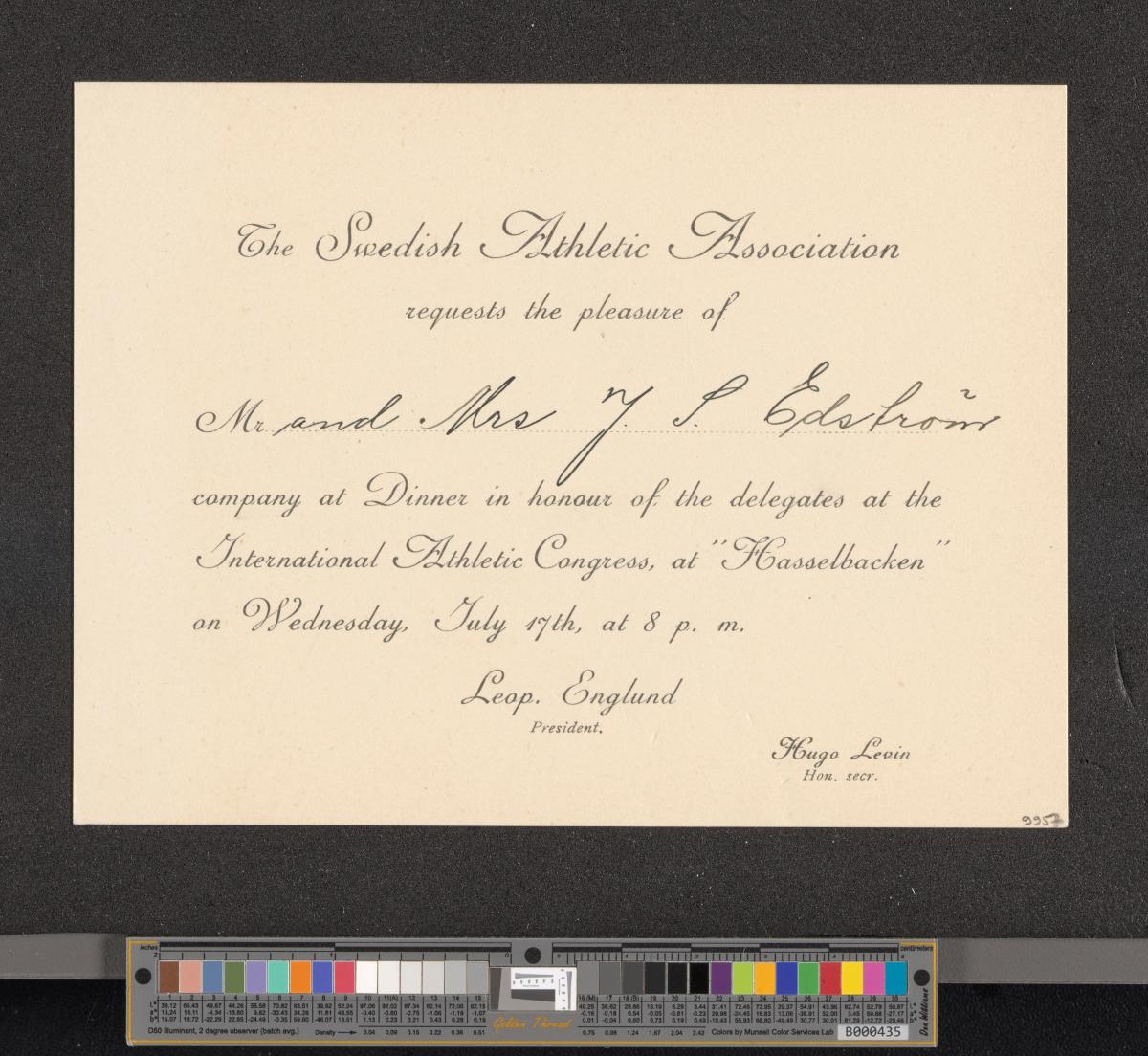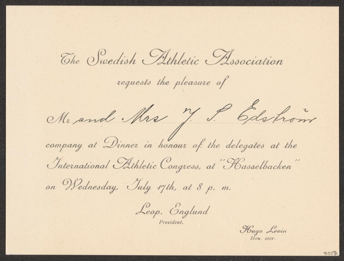 Carte d'invitation rectangulaire, texte: "The Swedish Athletic Association / requests the pleasure of / Mr and Mrs J. S. Edström / company at Dinner in honour of the delegates at the / International Athletic Congress at -Hasselbacken- / on Wednesday, July 17th, at 8 p. m.".