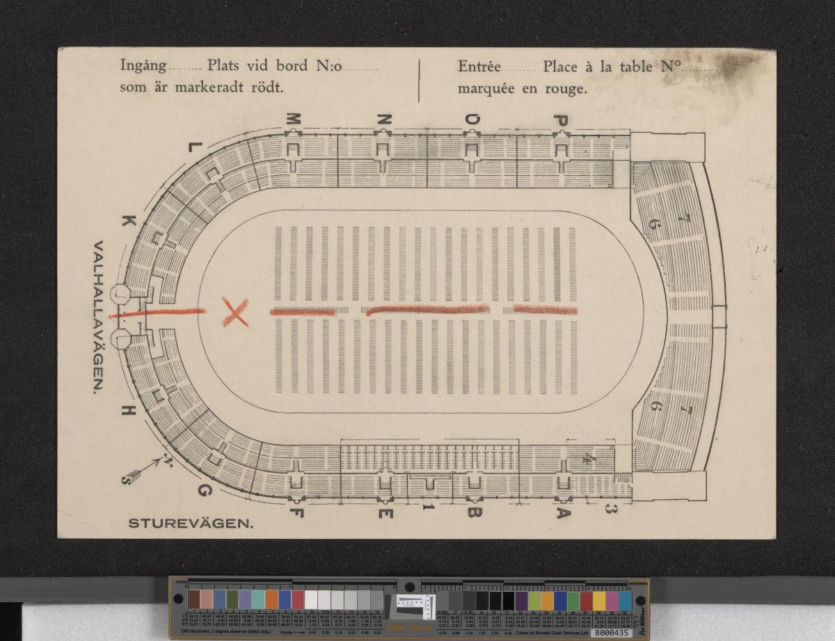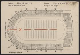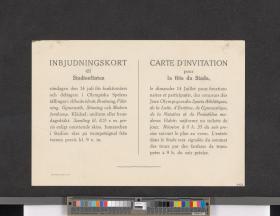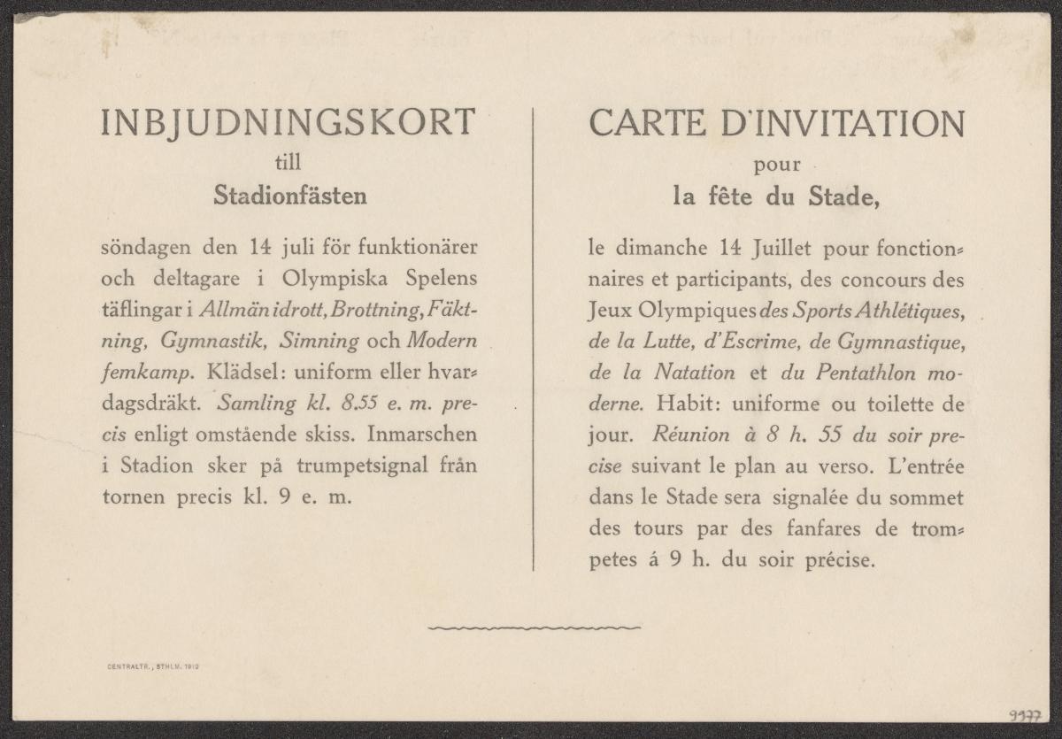 Carton rectangulaire avec le texte en suédois et français et le plan du stade au dos. Texte: "CARTE D'INVITATION / pour / la fête du Stade, / le dimanche 14 juillet pour fonction- / naires et participants, des concours des / Jeux Olympiques des Sports Athlétiques, de la Lutte, d'Escrime, de Gymnastique, / de la Natation et du Pentathlon mo- / derne. Habit: uniforme ou toilette de / jour. Réunion à 8 h. 55 du soir pre- / cise suivant le plan au verso. L'entrée / dans le Stade sera signalée du sommet / des tours par des fanfares de trom- / petes à 9 h. du soir précise.".
