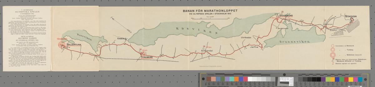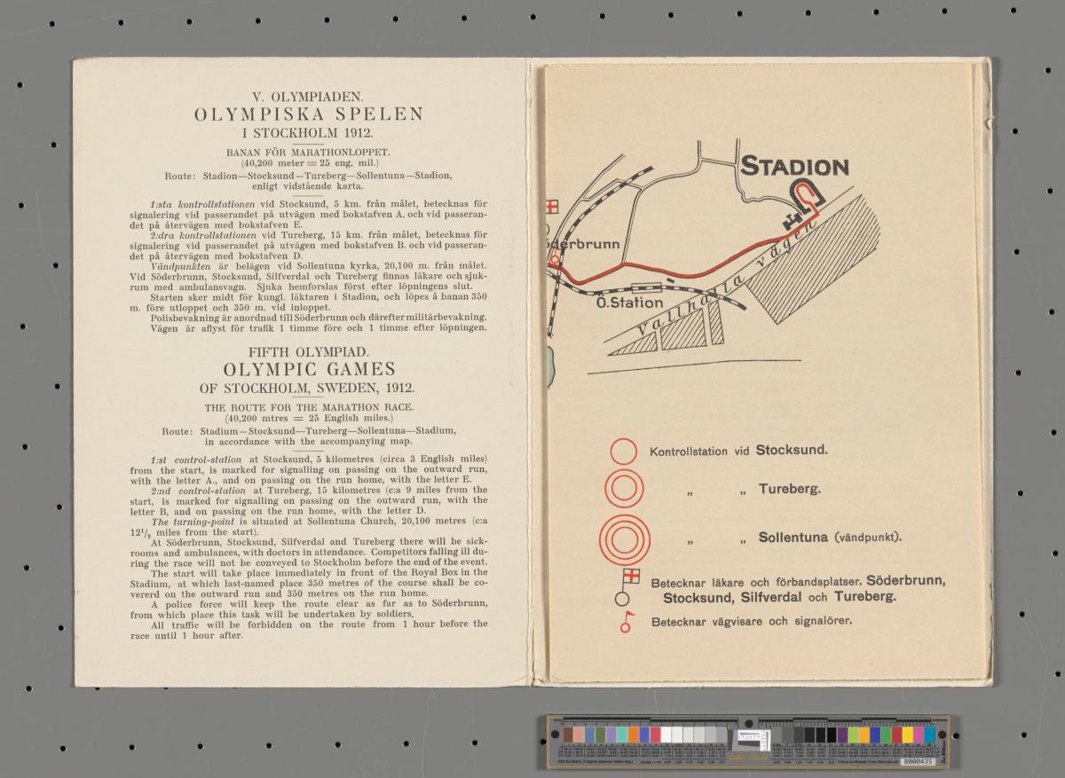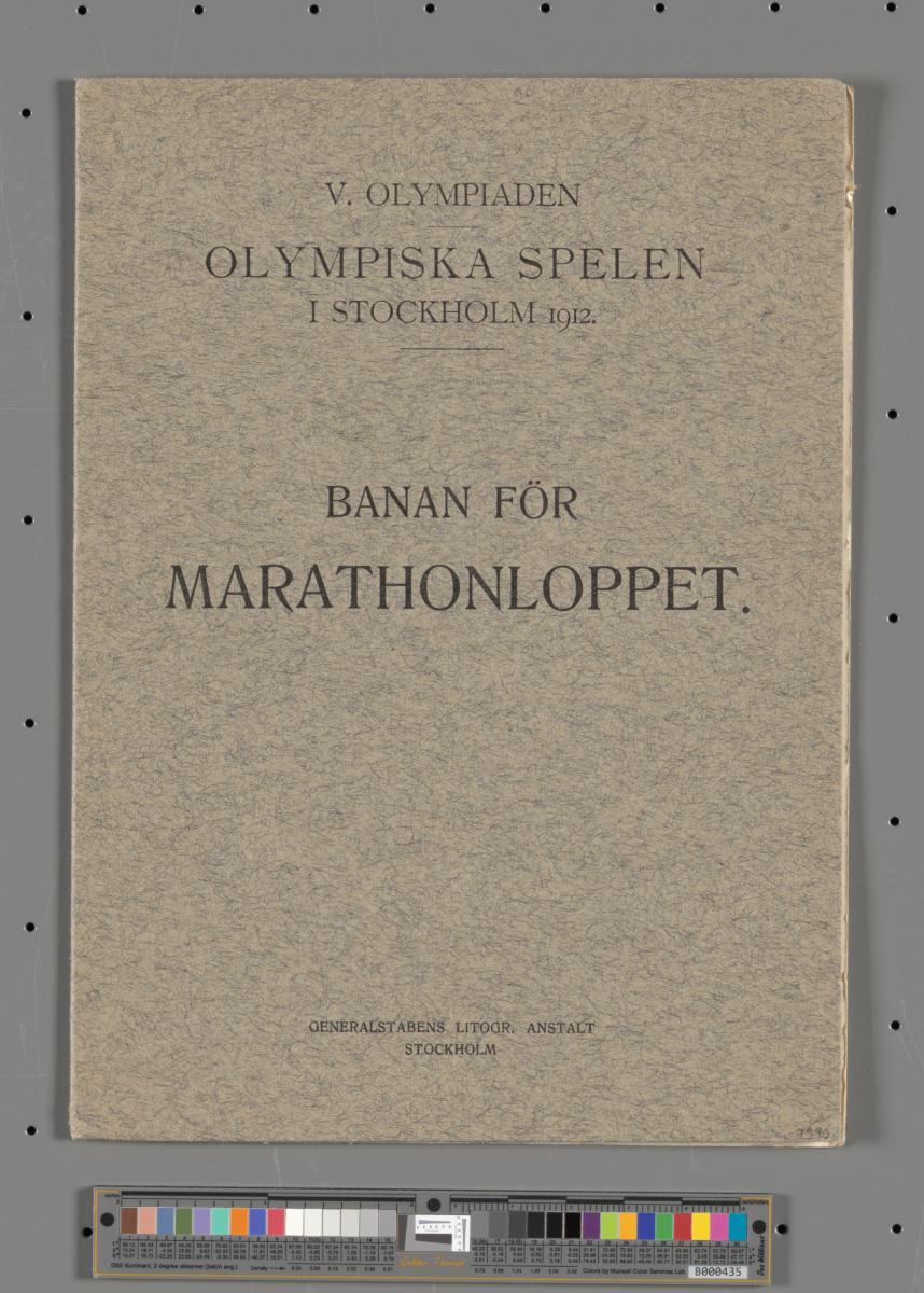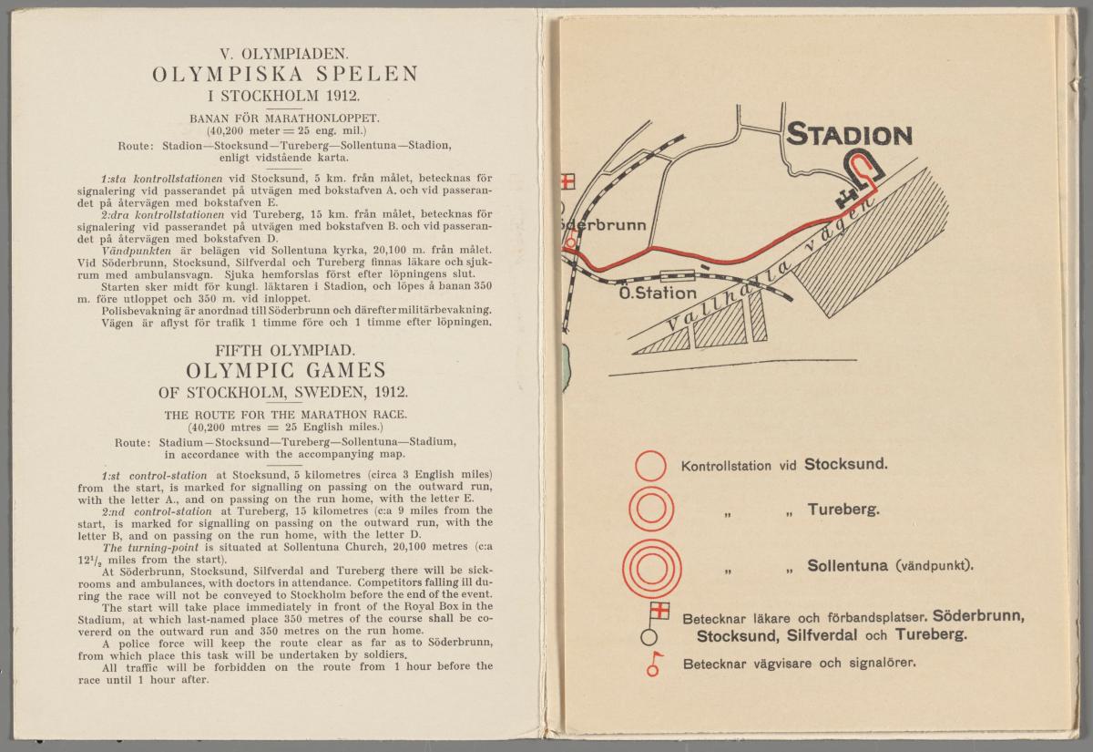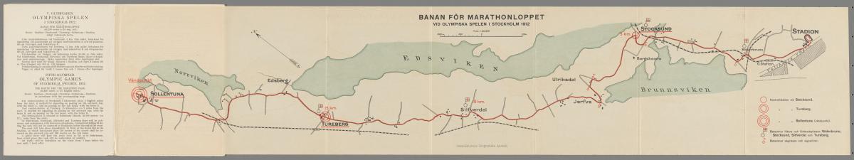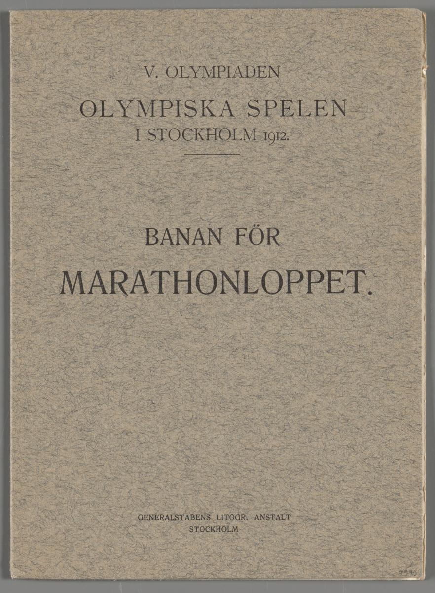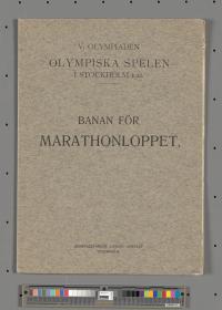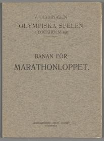 Dépliant avec le règlement du marathon en quatre langues et le dessin du parcours. Texte de la couverture: "V. OLYMPIADEN / OLYMPISKA SPELEN / I STOCKHOLM 1912. / BANAN FÖR / MARATHONLOPPET.".