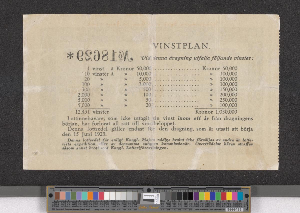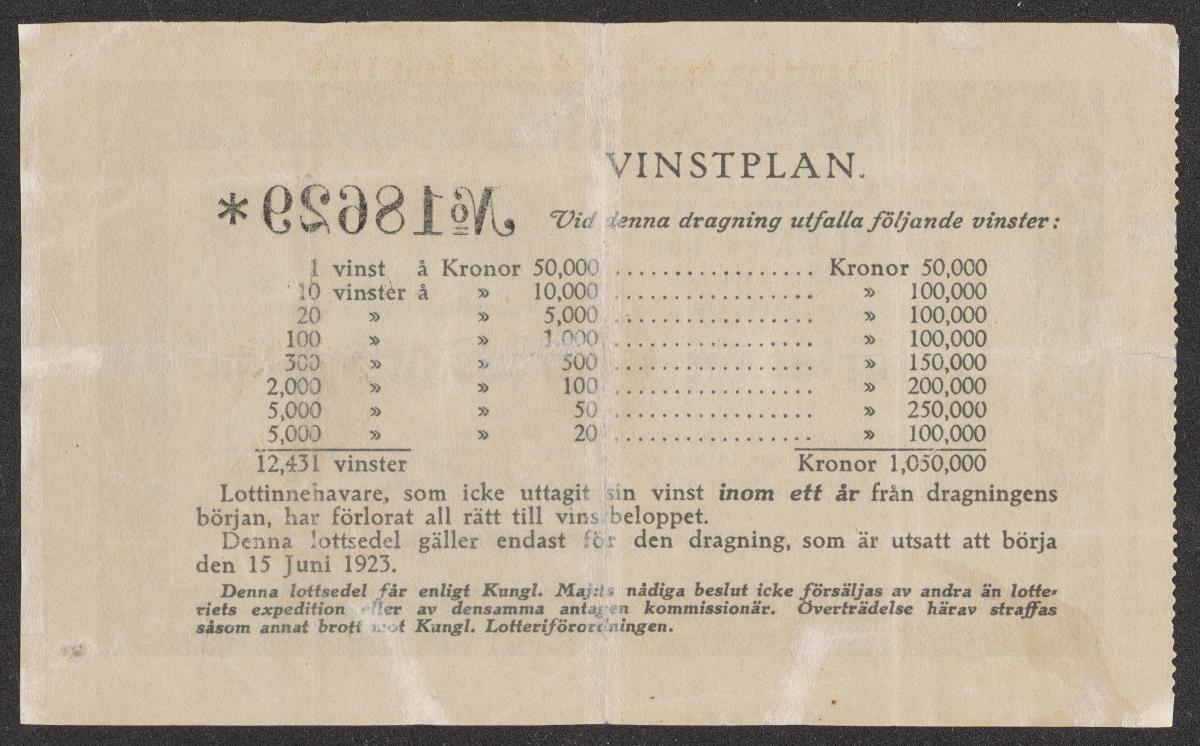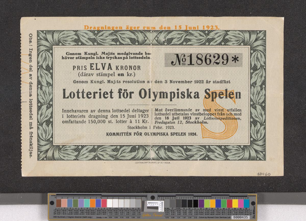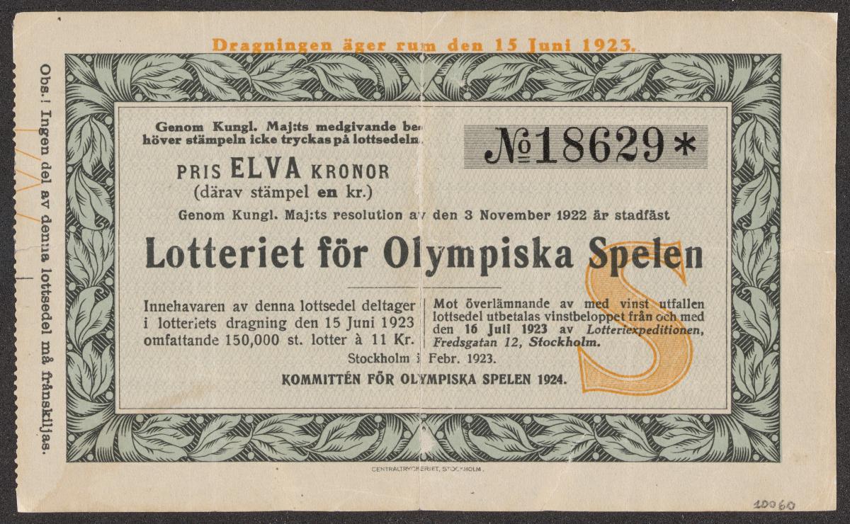 Billet de loterie de la valeur de onze couronnes suédoises afin de lever des fonds pour la délégation suédoise aux Jeux olympiques de Paris 1924.