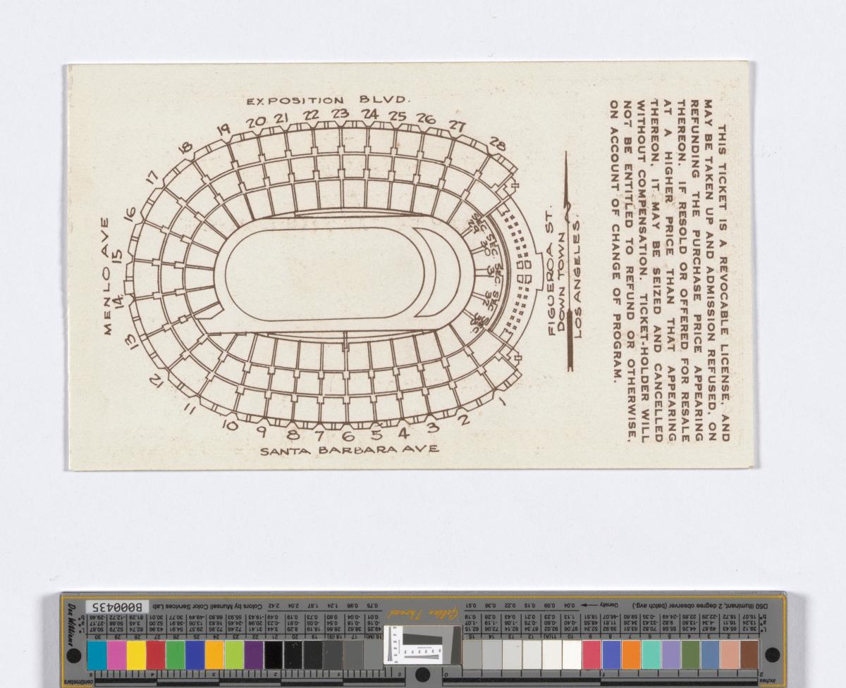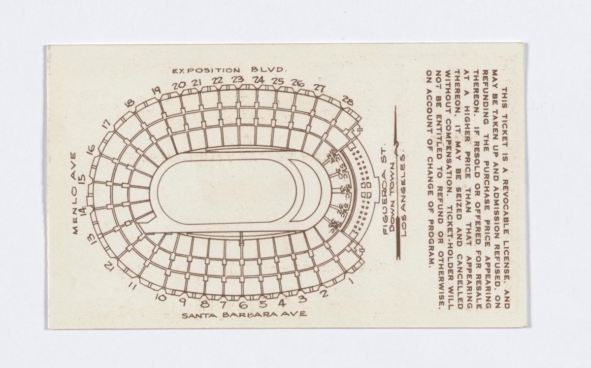 Billet d'entrée, avec l'emblème des Jeux et le plan du stade au dos. Coupon détaché. Texte: "Xth OLYMPIAD / LOS ANGELES 1932 / LACROSSE / OLYMPIC STADIUM".