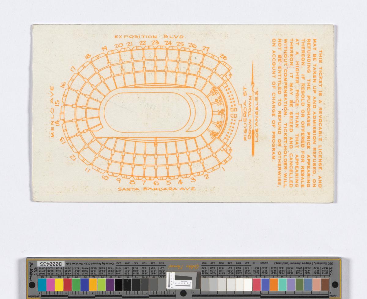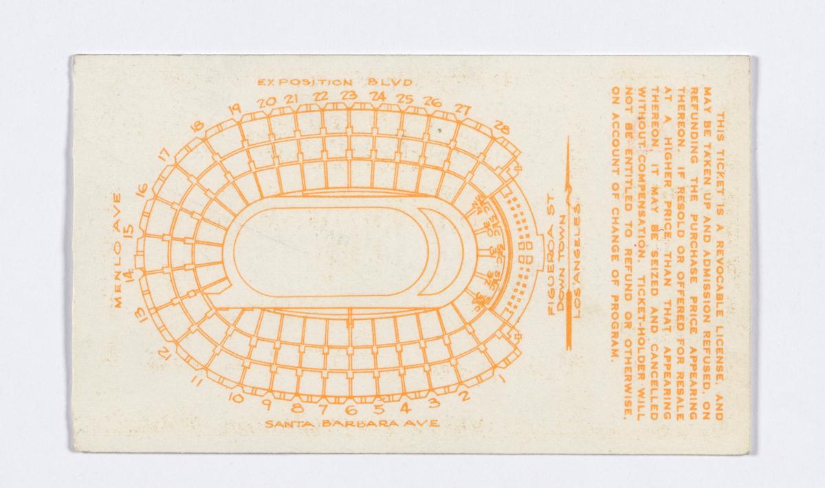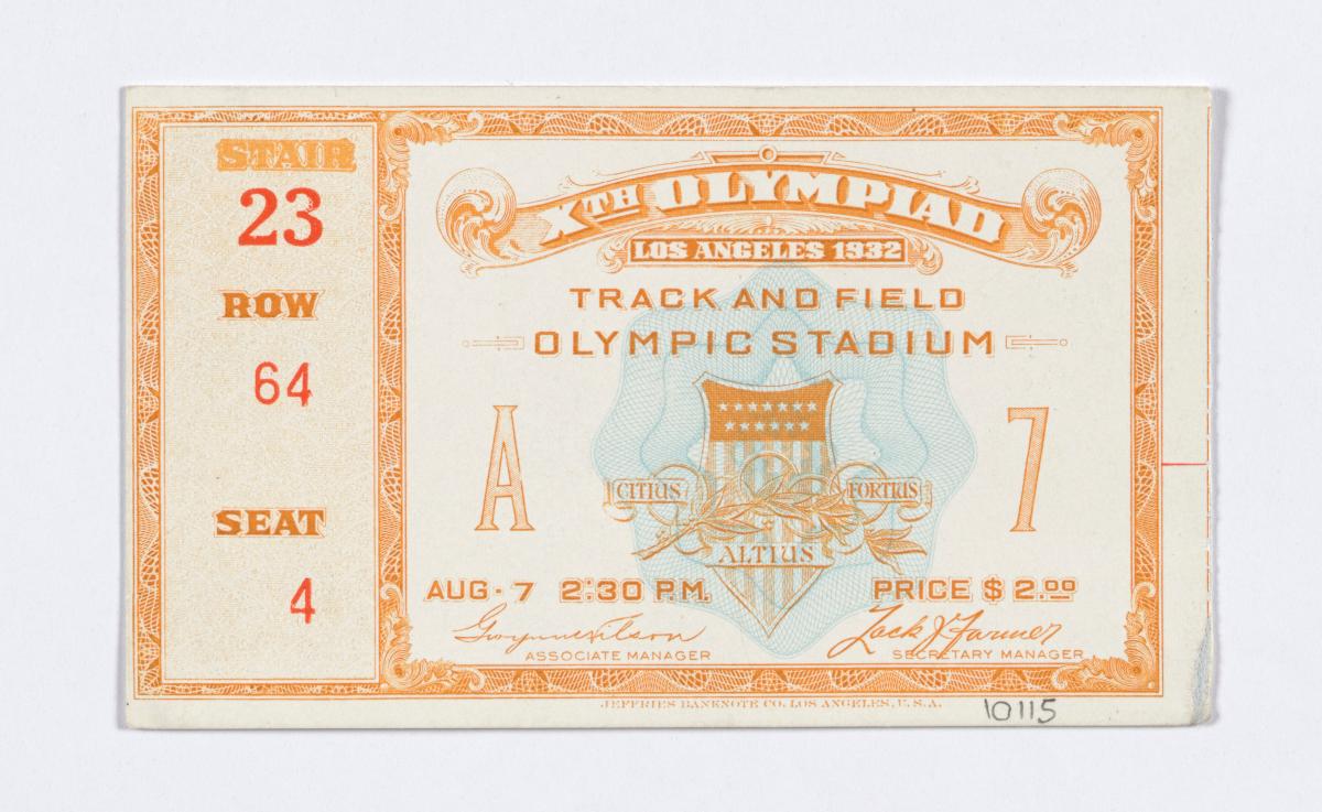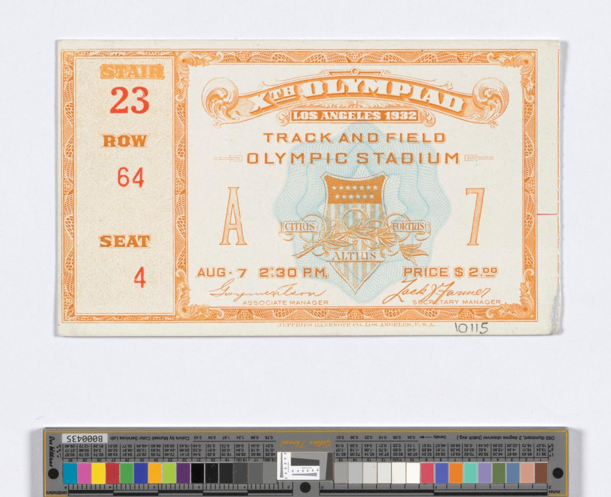 Billet d'entrée avec l'emblème des Jeux et le plan du stade au dos. Coupon détaché. Texte: "Xth OLYMPIAD / LOS ANGELES 1932 / TRACK AND FIELD / OLYMPIC STADIUM".