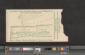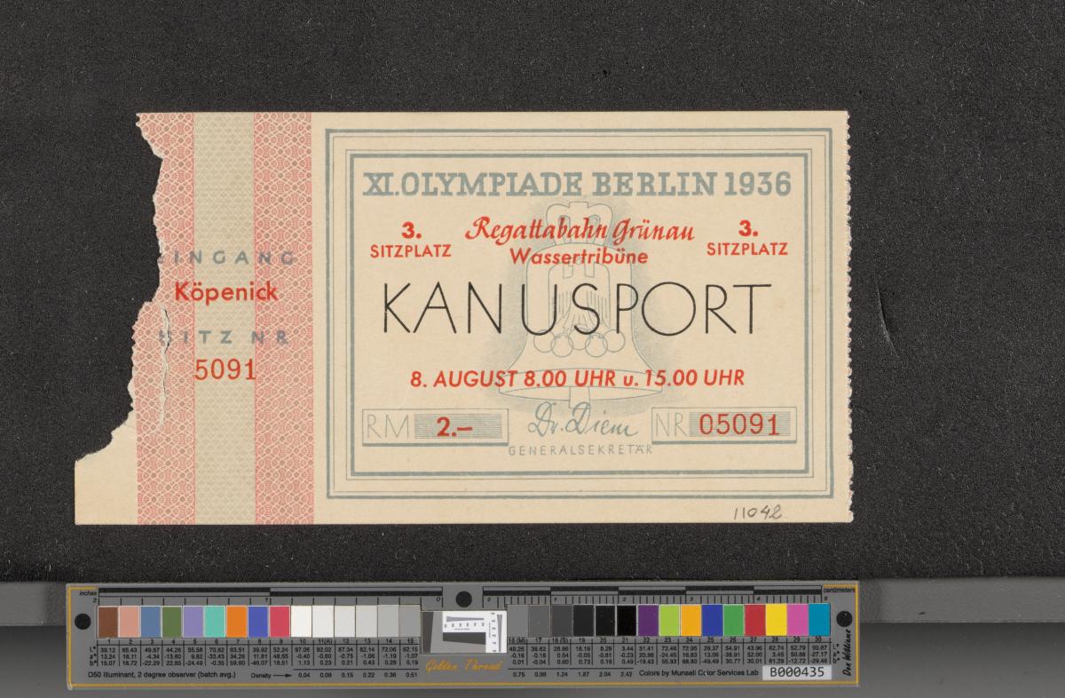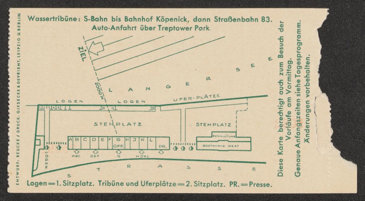 Billet d'entrée avec l'emblème des Jeux en arrière-fond, texte: "XI. OLYMPIADE BERLIN 1936 / Regattabahn Grünau / Wassertribüne / Sitzplatz / KANUSPORT / 8. AUGUST 8.00 UHR u. 15.00 UHR". Plan du site au dos. Coupon détaché.