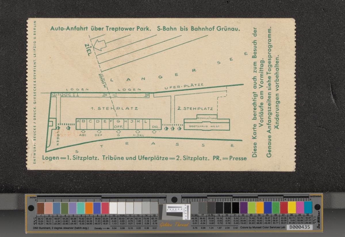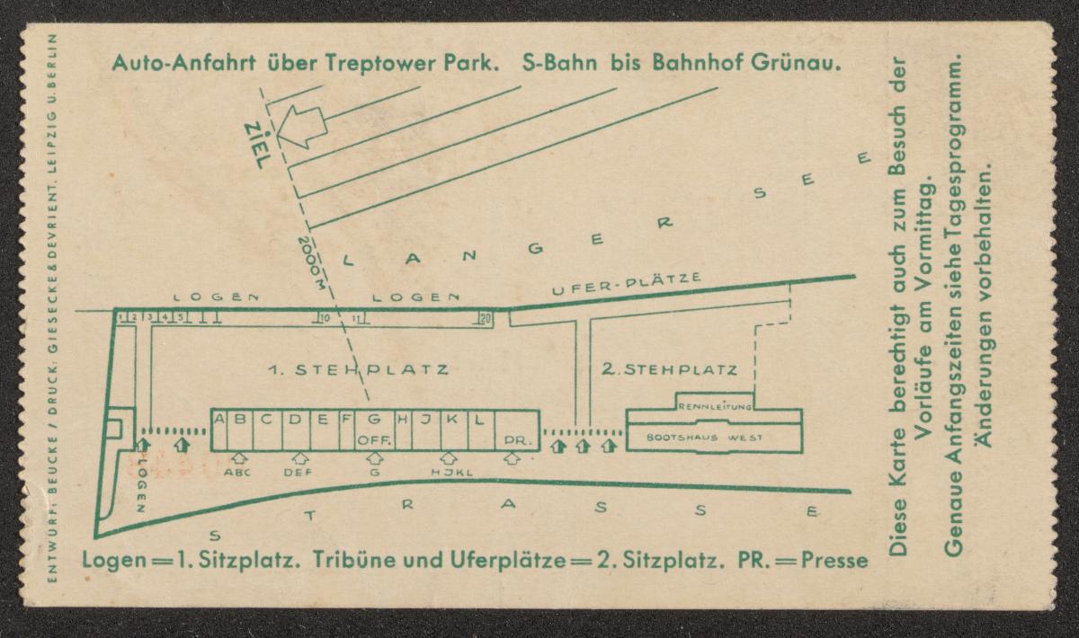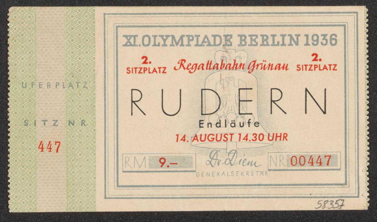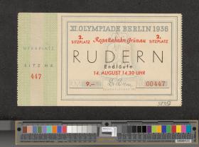 Billet d'entrée avec l'emblème des Jeux en arrière-fond, texte: "XI. OLYMPIADE BERLIN 1936 / Regattabahn Grünau / 2. / Sitzplatz / RUDERN / Endläufe / 14. AUGUST 14.30 UHR". Plan du site au dos. Coupon détaché.