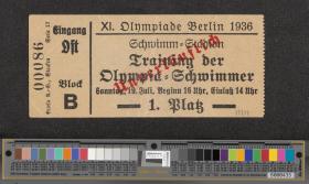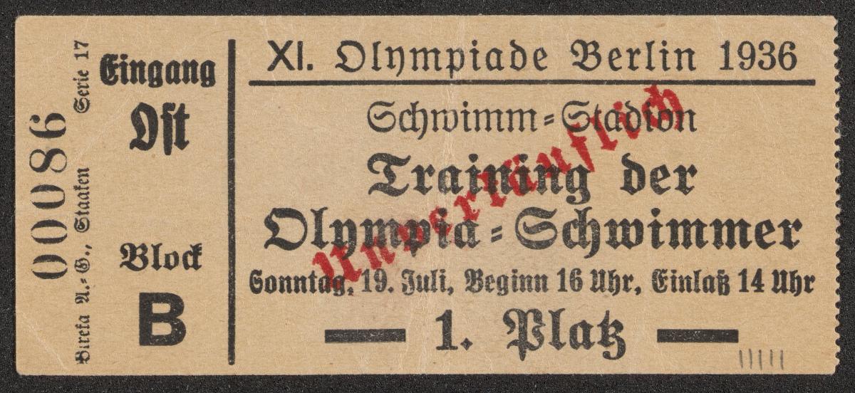 Billet d'entrée, texte: "XI. Olmypiade Berlin 1936 / Schwimm-Stadion / Training der / Olympia-Schwimmer / Sonntag, 19. Juli, Beginn 16 Uhr, Einlad 14 Uhr". En travers du billet se trouve un texte non déchiffré d'un tampon.