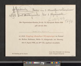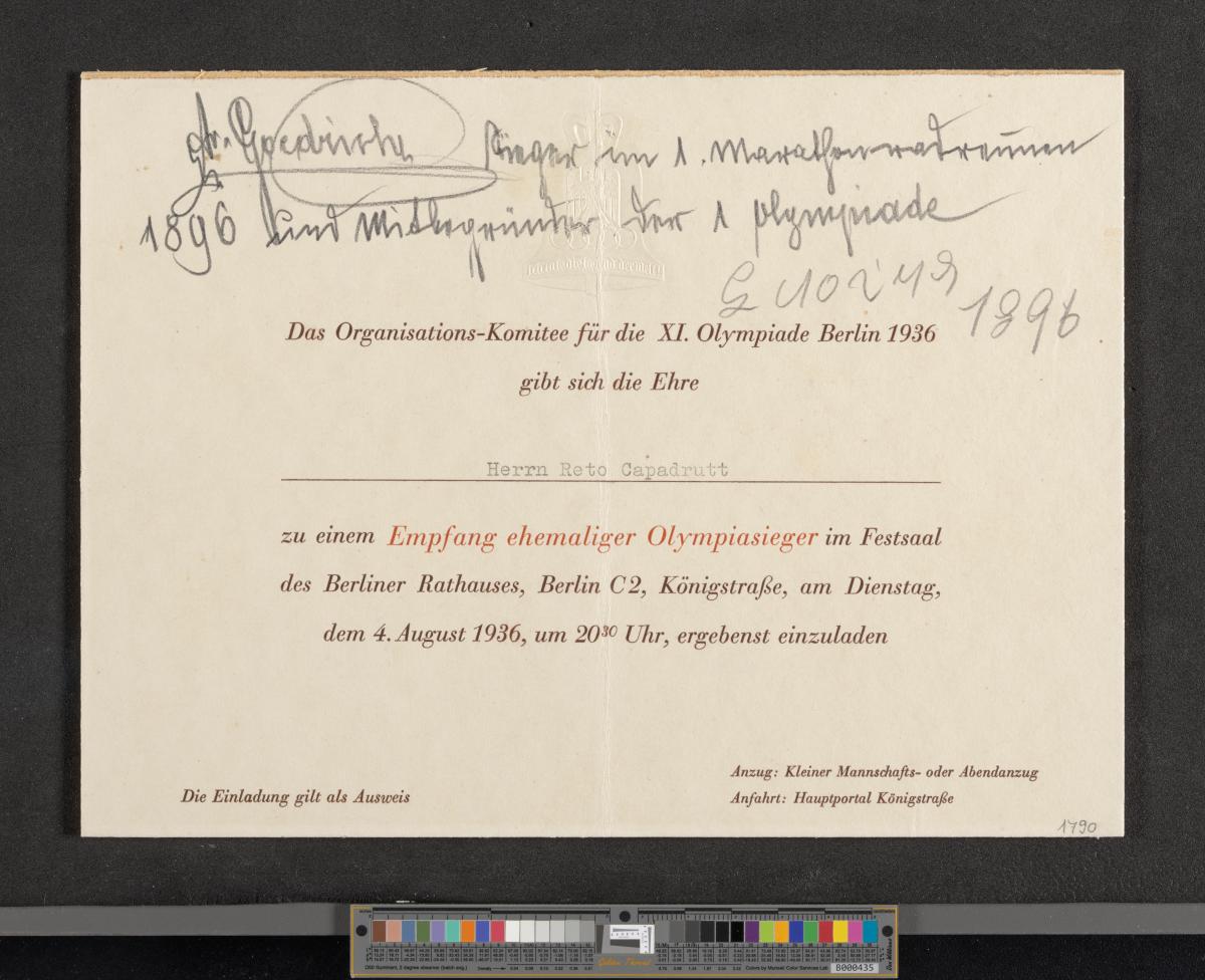 Texte de l'invitation: "Das Organisations-Komitee für die XI. Olympiade Berlin 1936 / gibt sich die Ehre / Herrn Reto Capadrutt / zu einen Empfang ehemaliger Olympiasieger im Festsaal / des Berliner Rathauses, Berlin C2, Königstrasse, am Dienstag, / dem 4. August 1936, um 20.30 Uhr, ergbenst einzuladen". Inscriptions manuscrites.