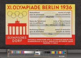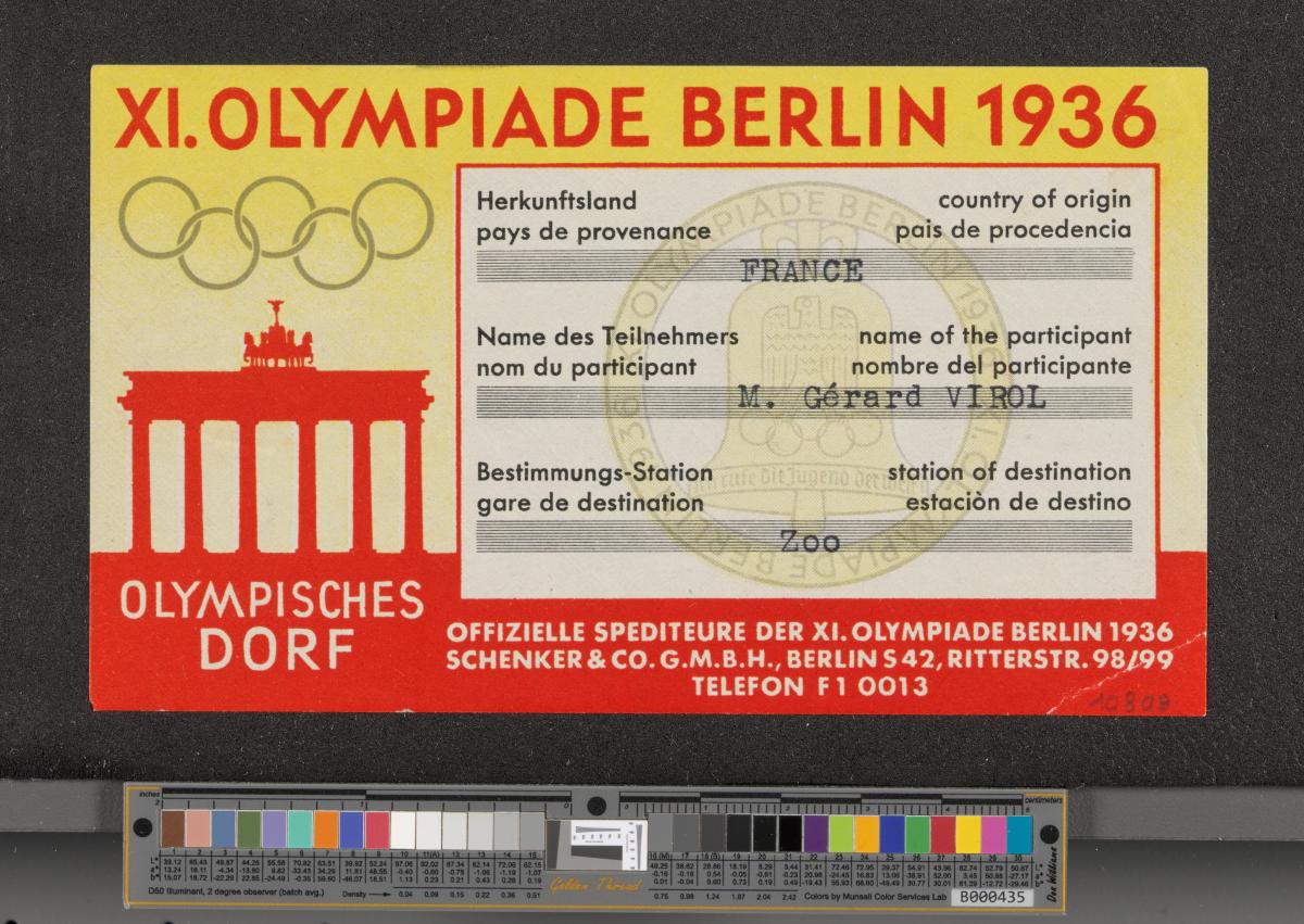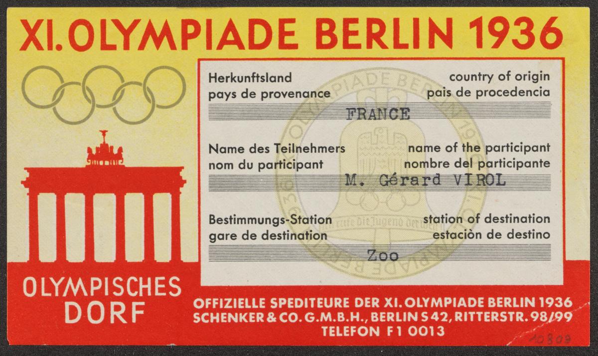 Berlin 1936, étiquette pour les envois du participant M. Gérard Virol (FRA).