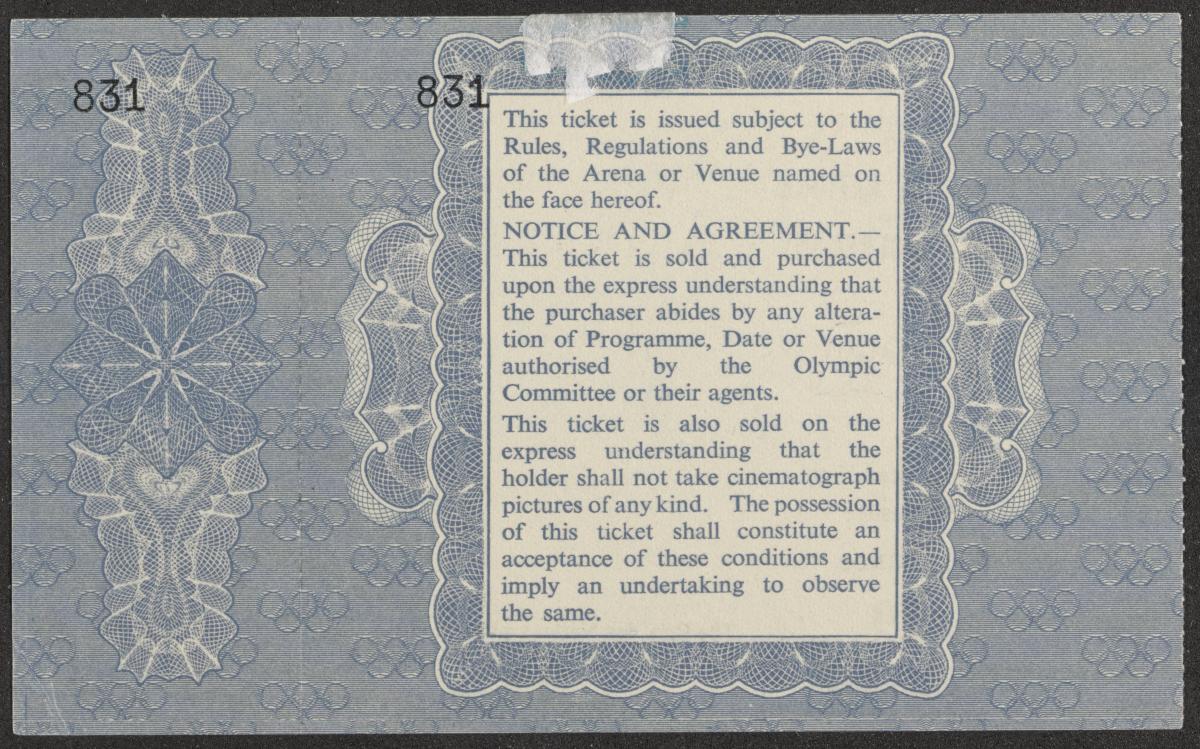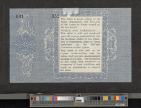 BIllet avec l'emblème des Jeux et le pictogramme de la Cérémonie de clôture, réglement au dos. Talon détachable. Ce billet donnait droit d'assister au Prix des Nations d'équitation qui précédait la Cérémonie.