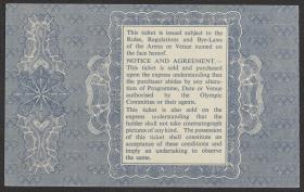 BIllet l'emblème des Jeux, le pictogramme du plongeon, la date et la localiastion du siège. Termes et conditions au dos. Talon détaché.