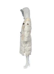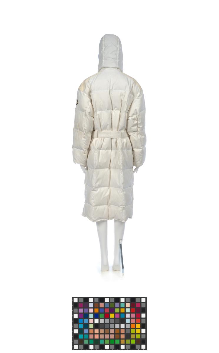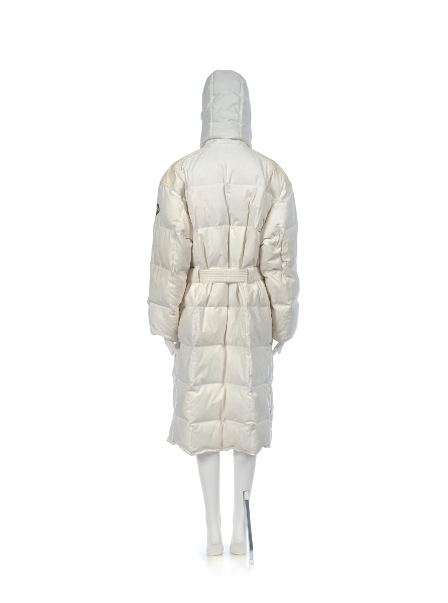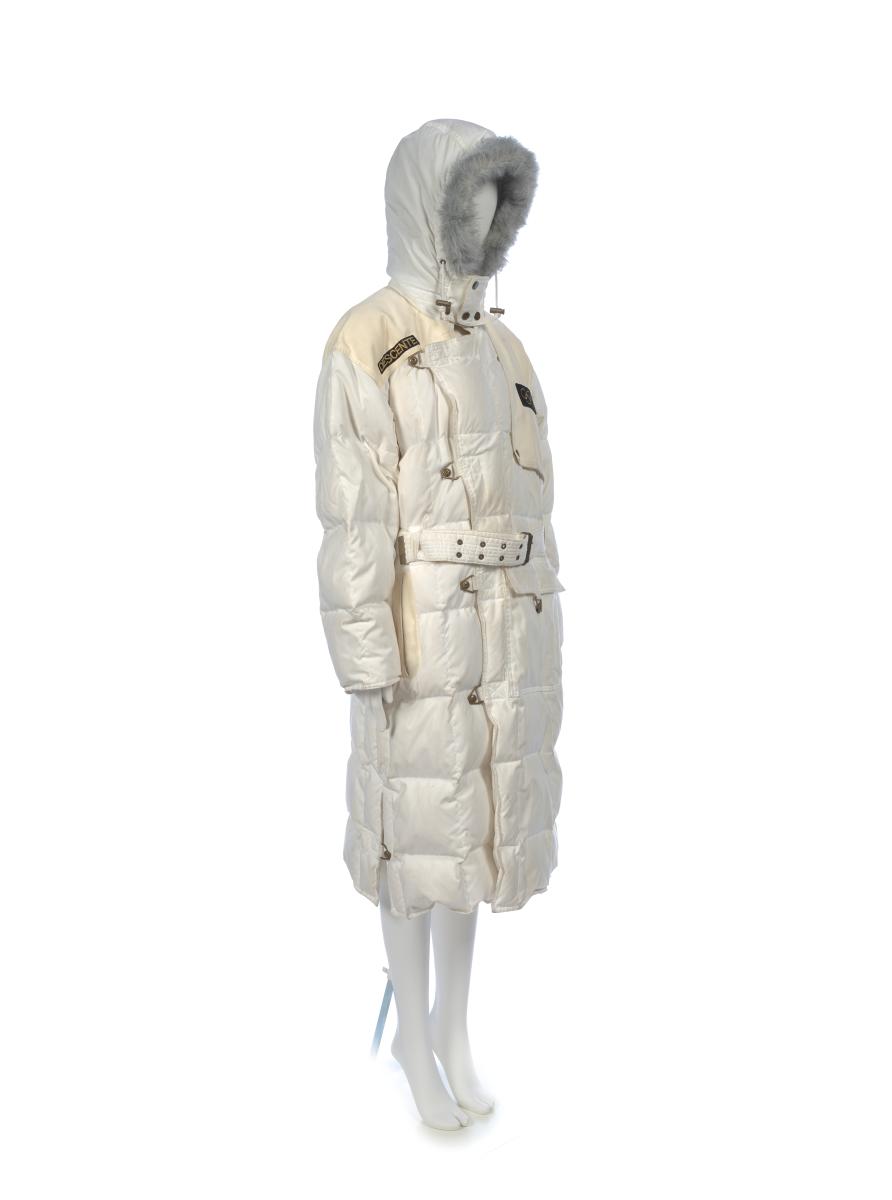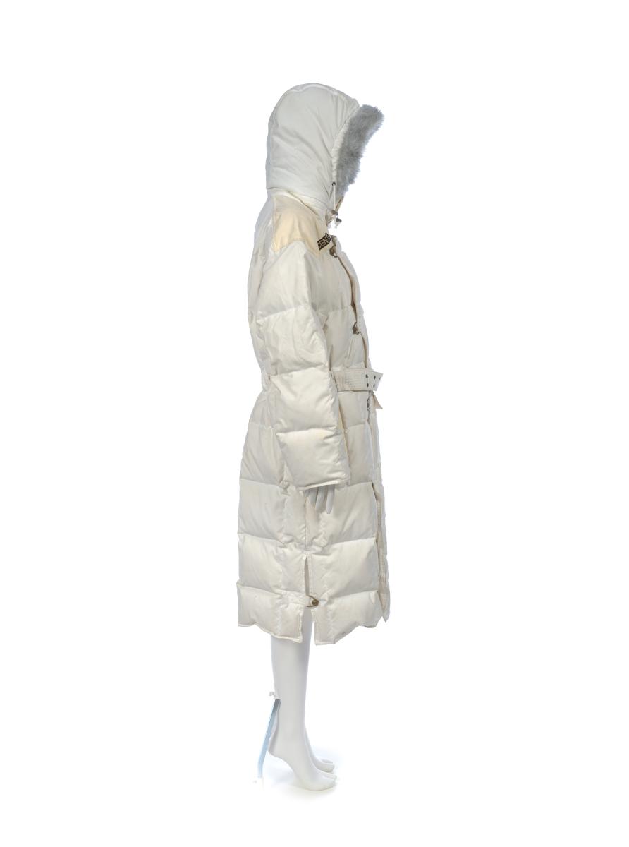Long manteau blanc avec capuchon bordé de fourrure. En haut à gauche, on trouve les anneaux olympiques. Taille M.