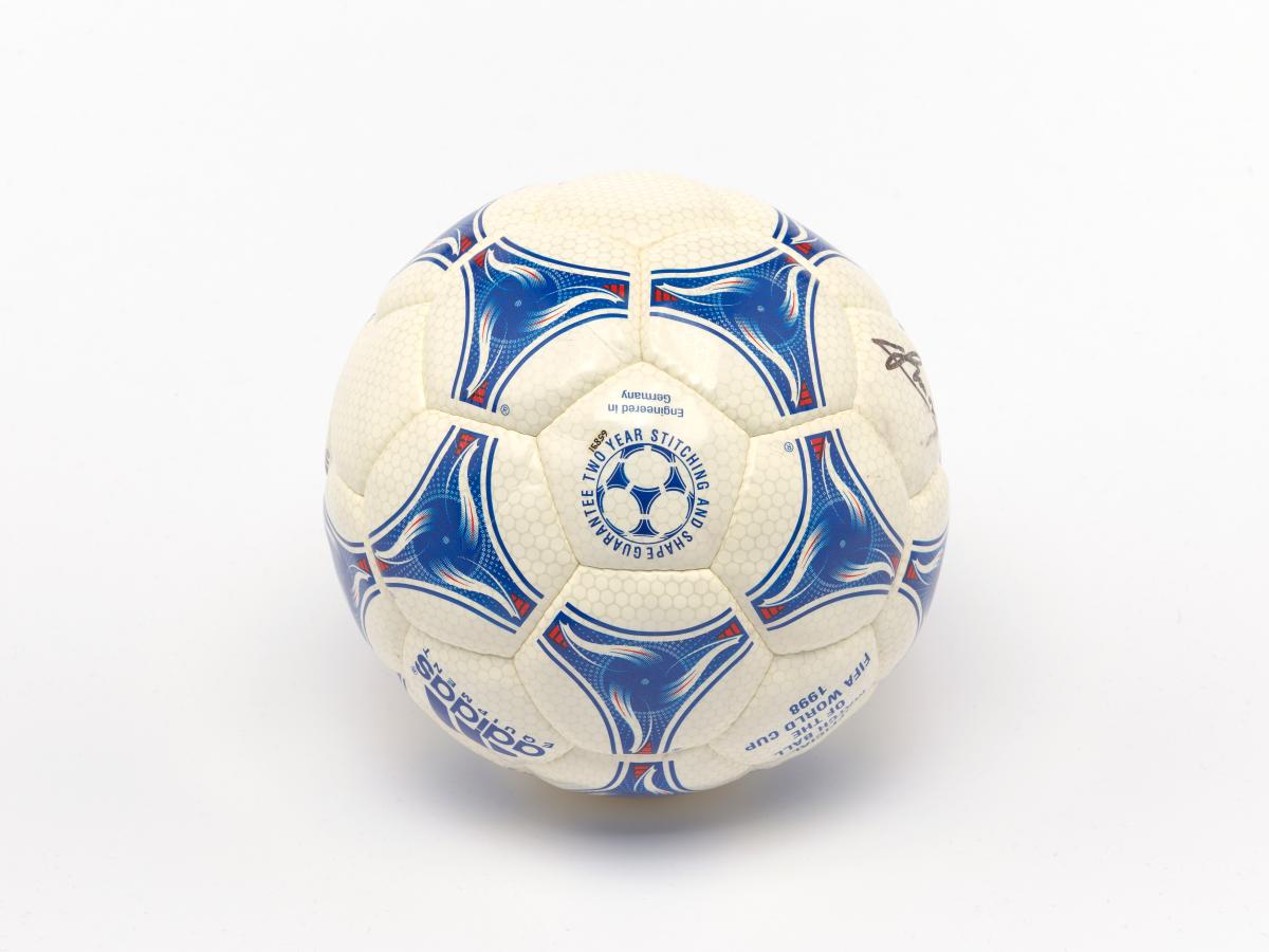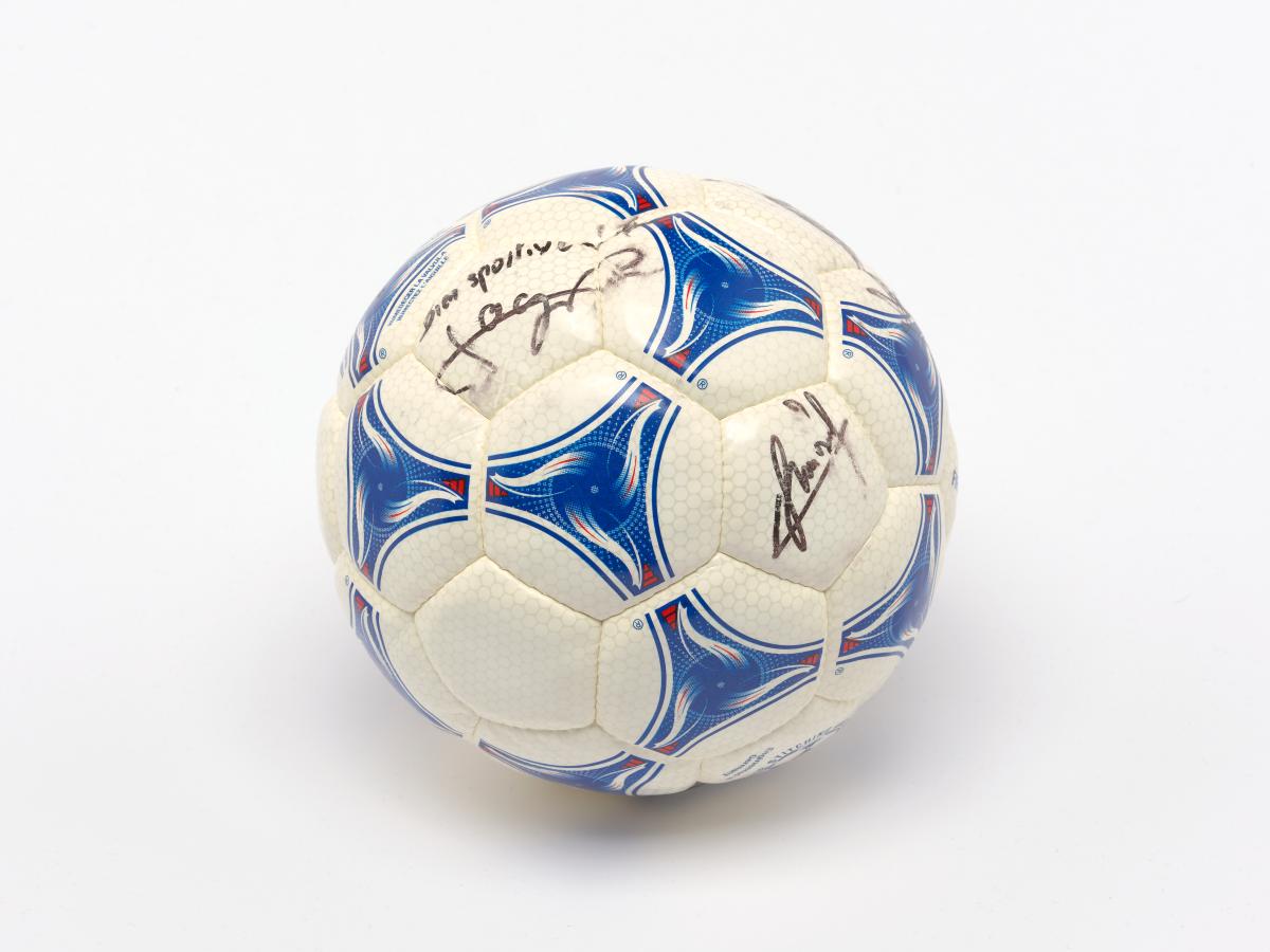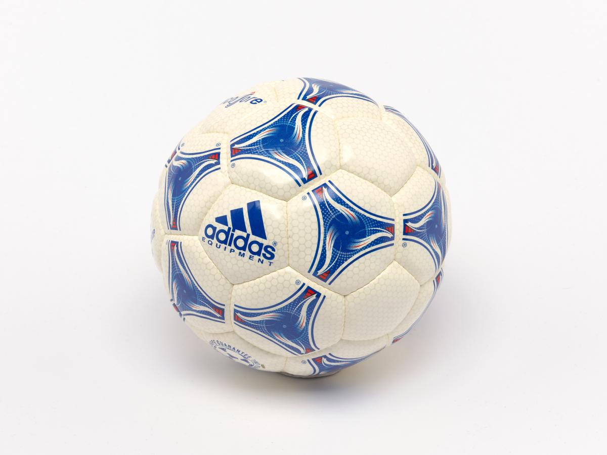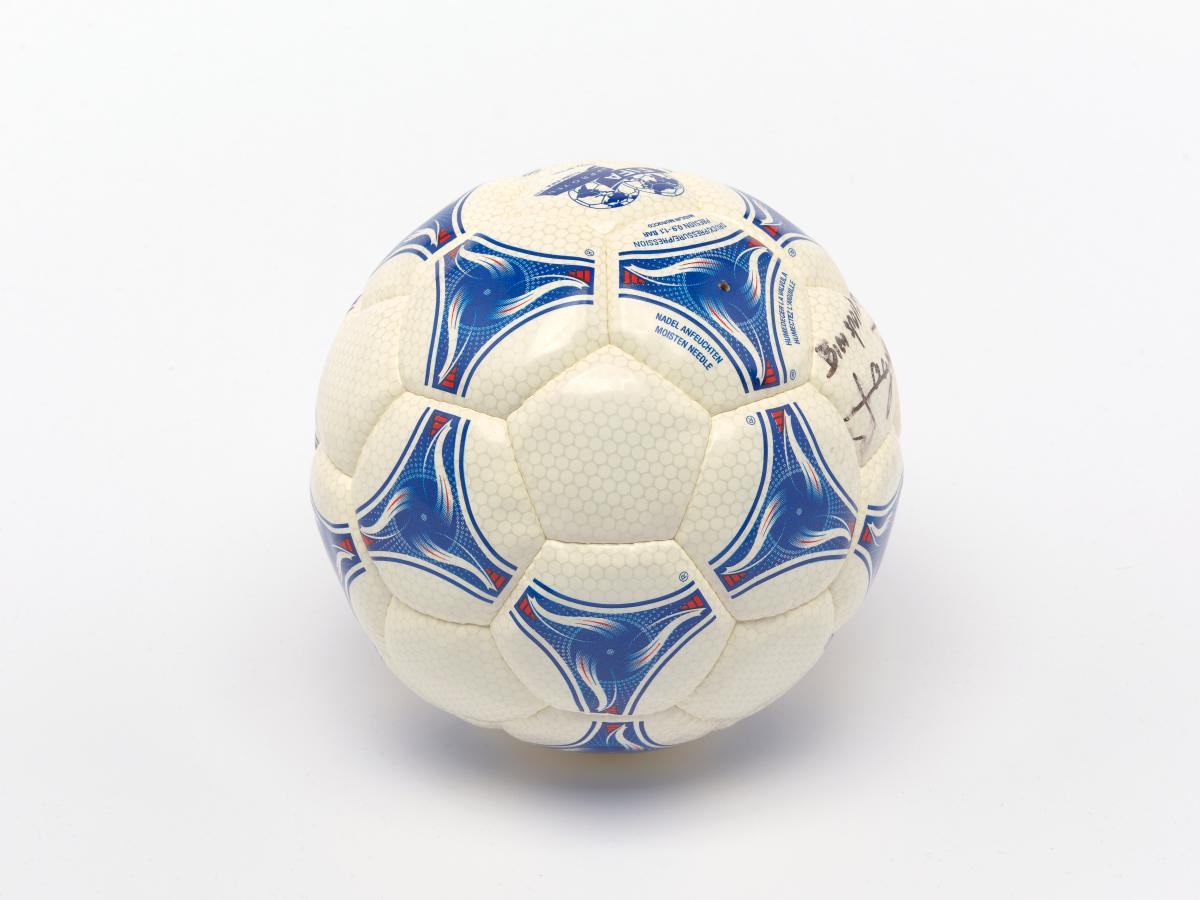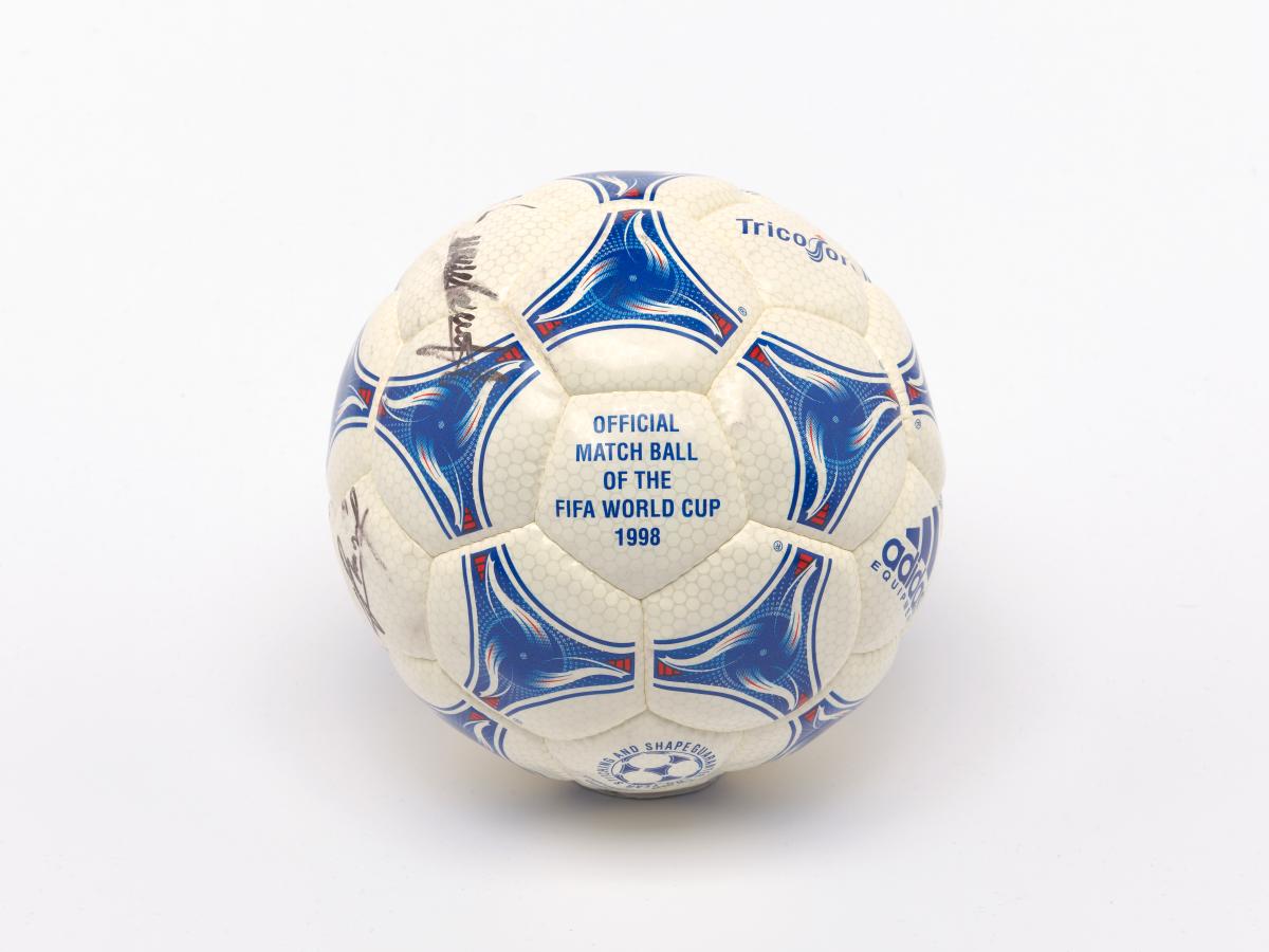 Modèle Tricolore, signé par Aimé Jacquet, entraîneur de l'équipe française de football pour la Coupe du Monde 1998 en France, Juan Antonio Samaranch, président du CIO, et Claude Simonet, président de la Fédération Française de Football. Modèle approuvé par la FIFA.