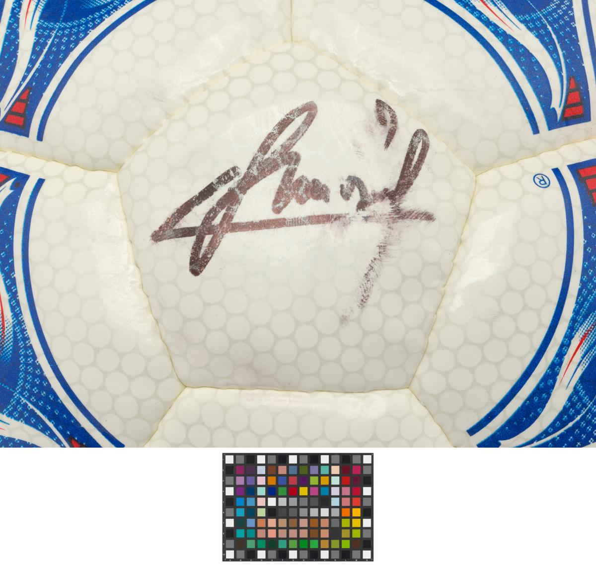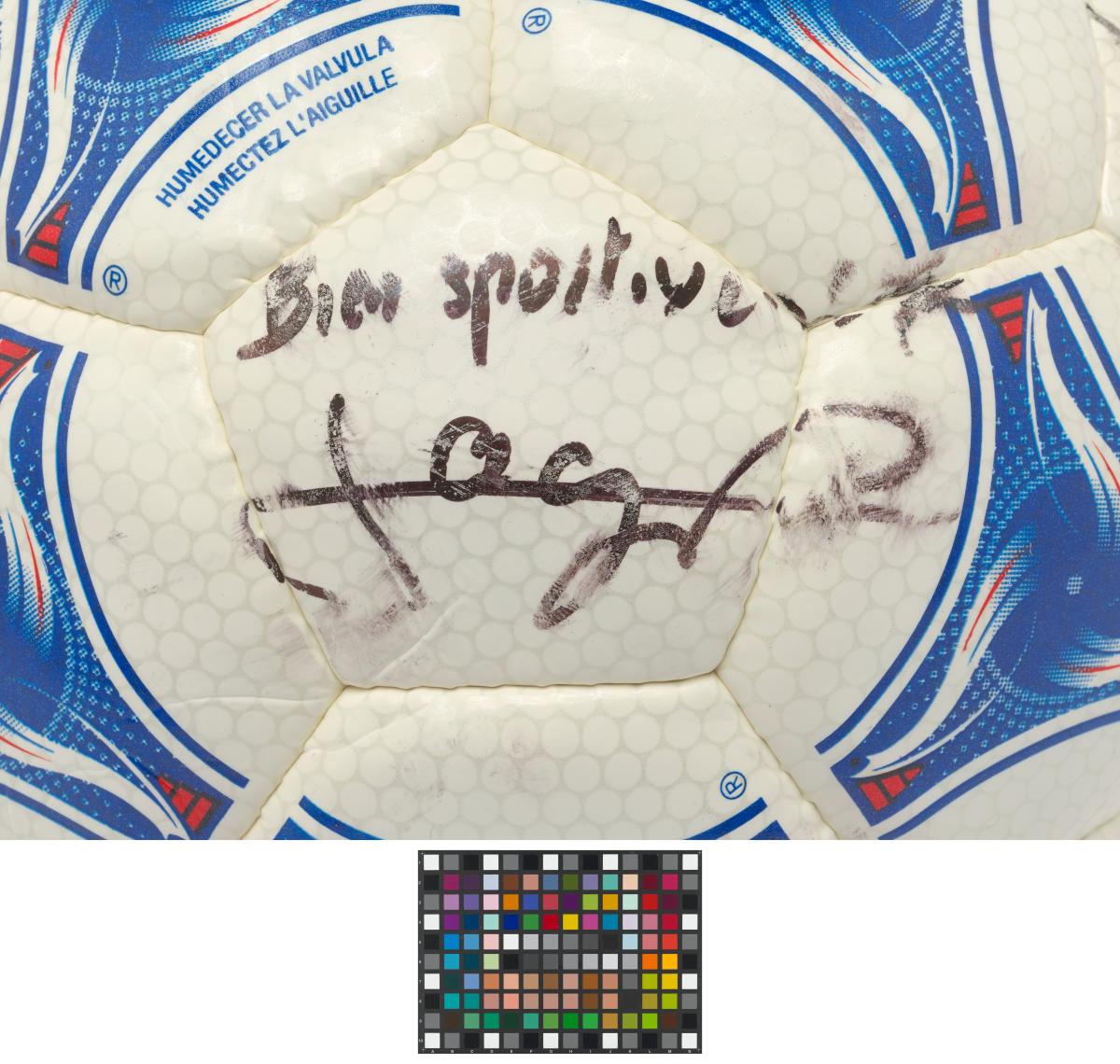 Ballon de football dédicacé par Aimé Jacquet, Juan Antonio Samaranch et Claude Simonet.