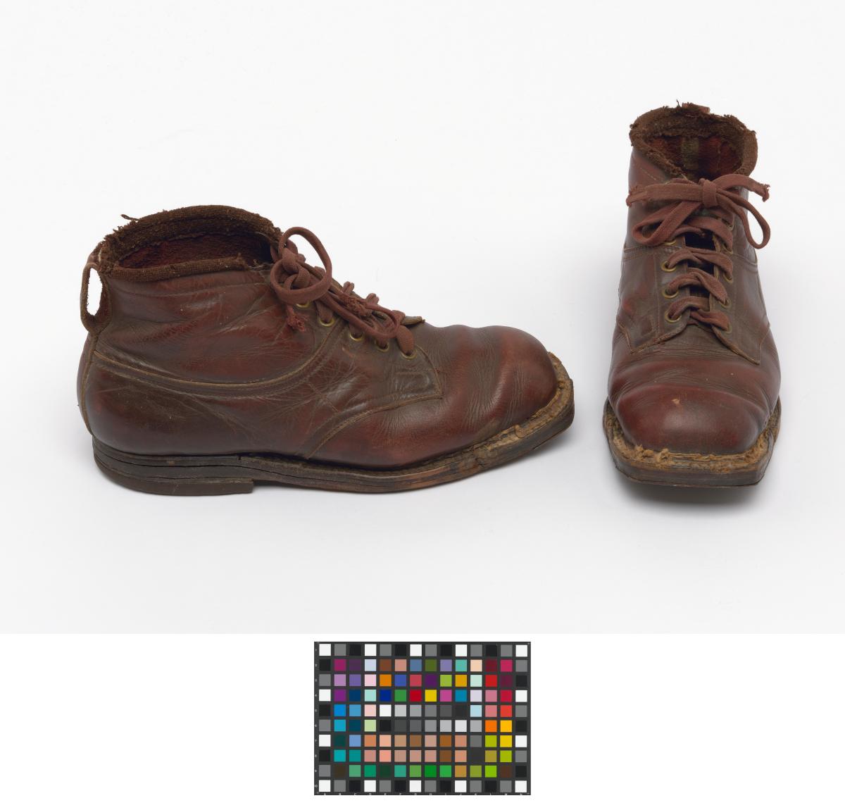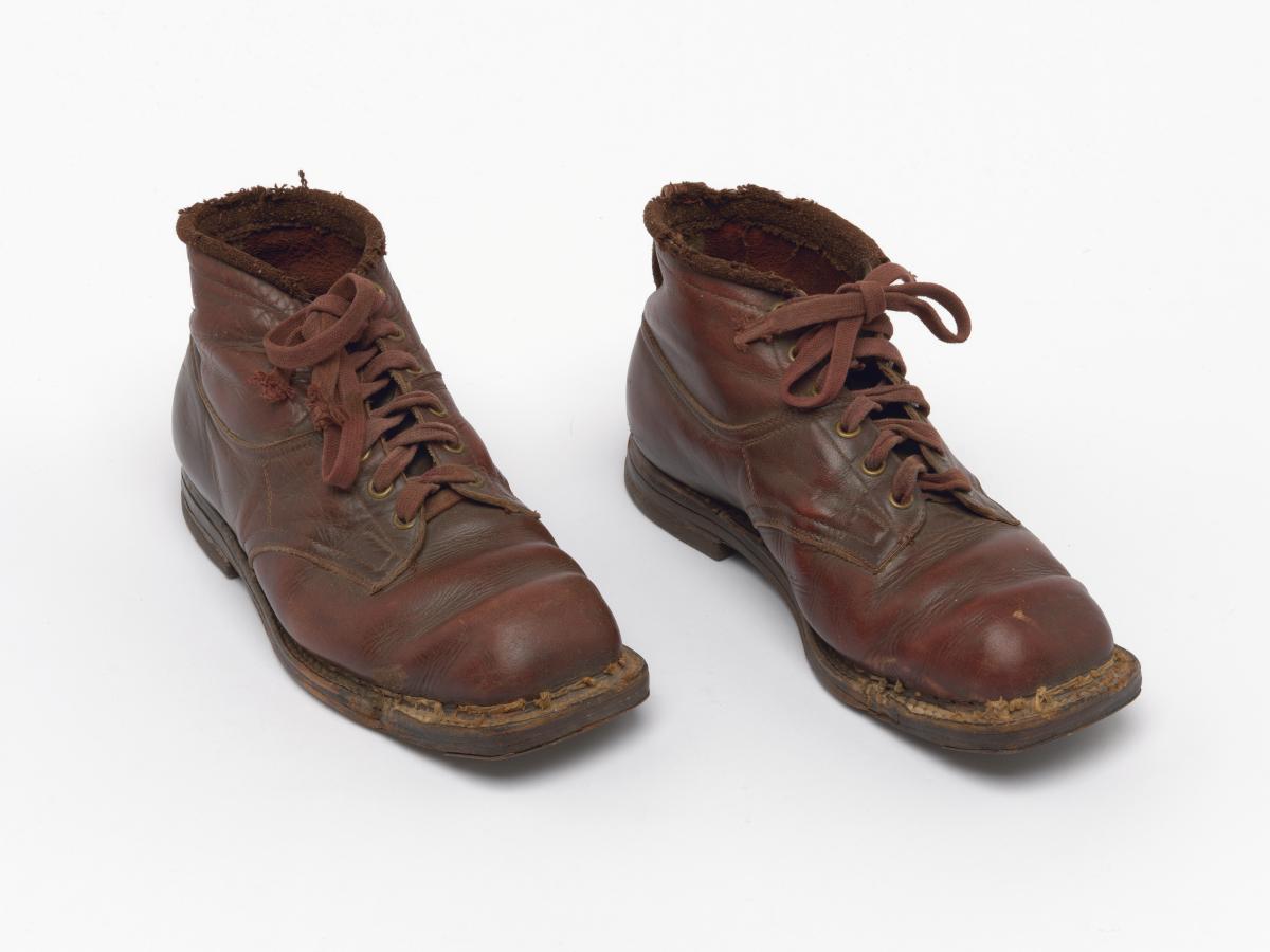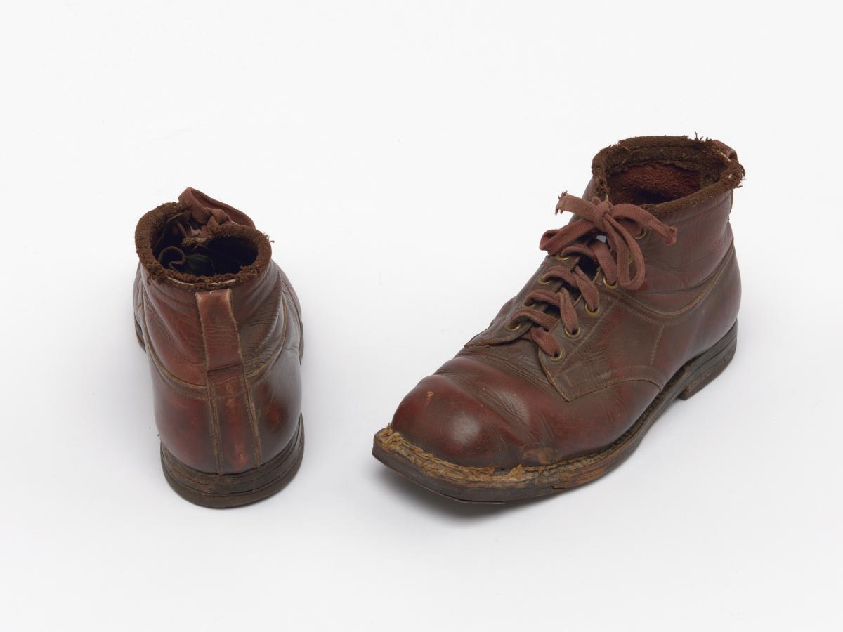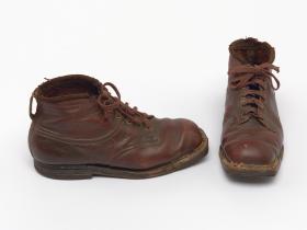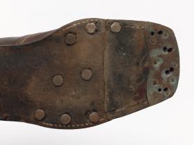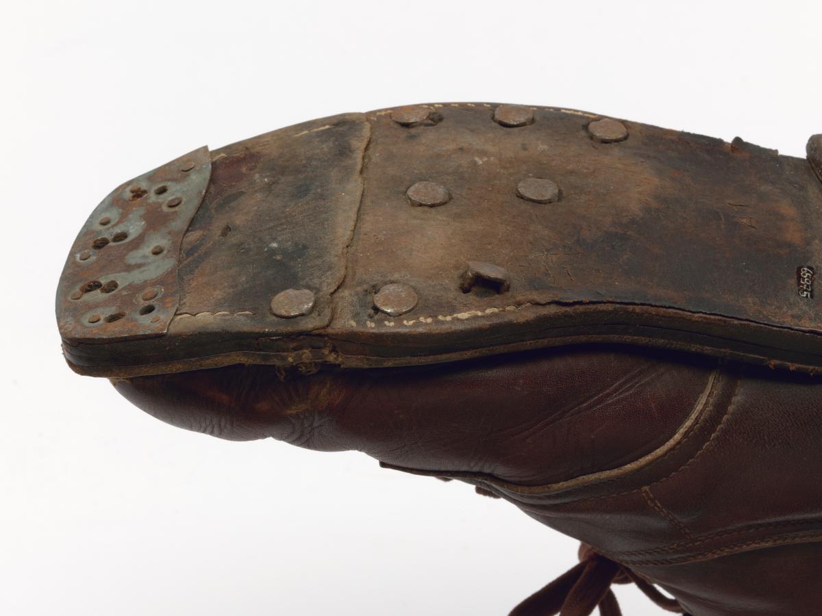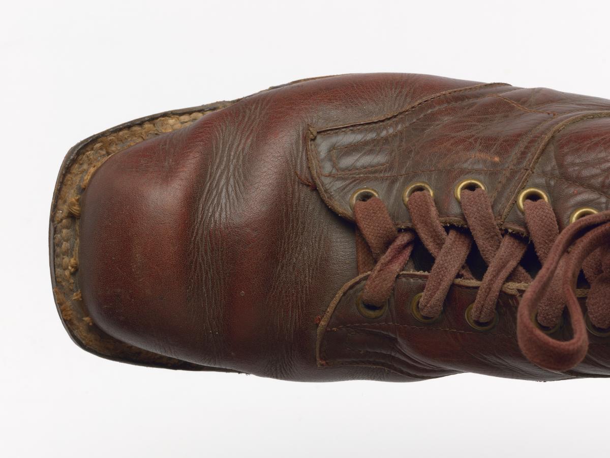 Paire de chaussures de ski nordique datant de la première moitié du 20e siècle.