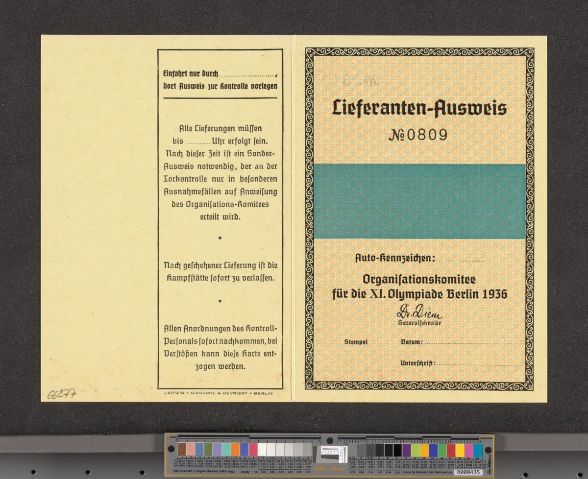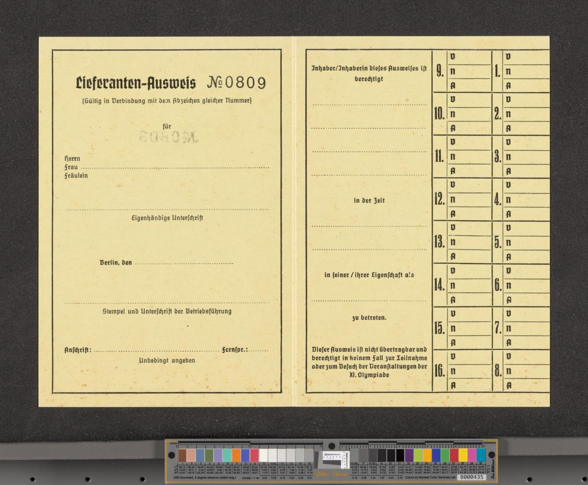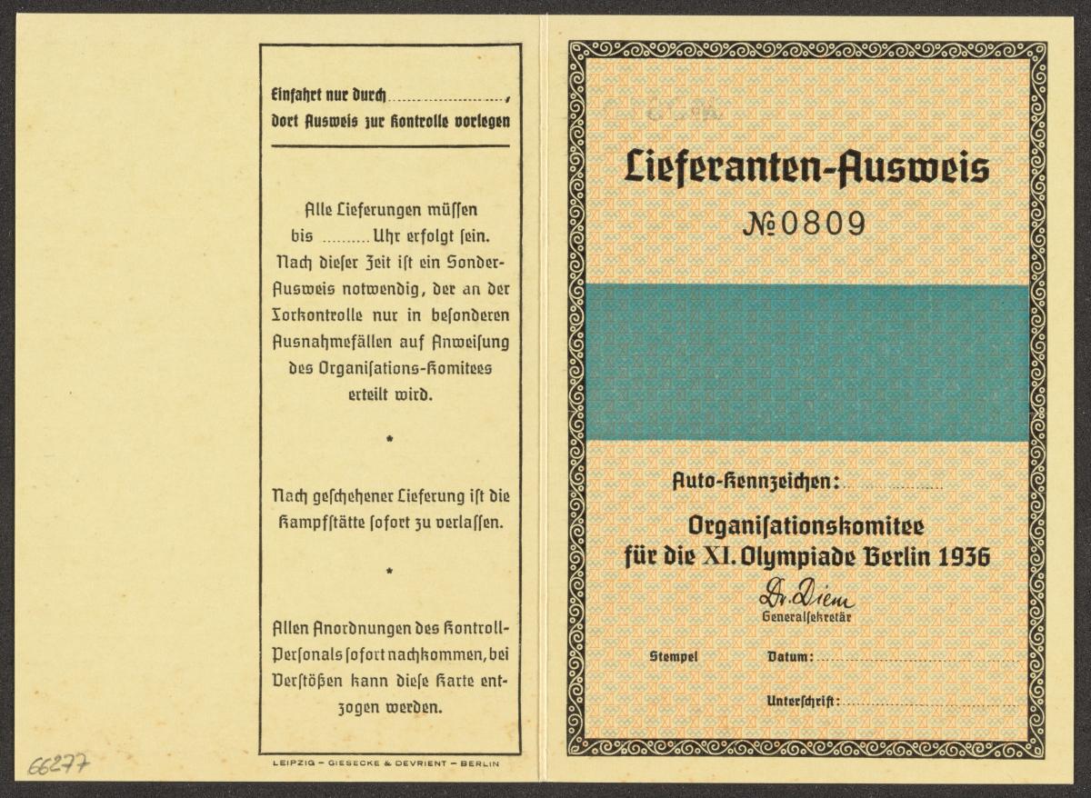 Berlin 1936, carte d'accréditation pour les fournisseurs.