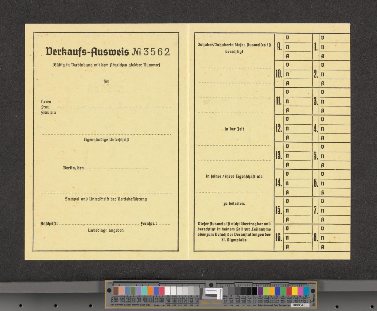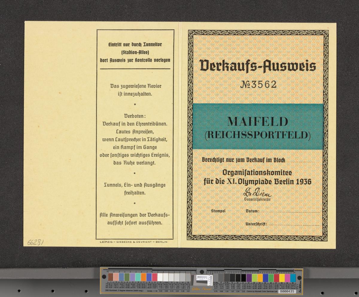 Carte d'accréditation vierge pour les vendeurs, texte: "Verkaufs-Ausweis / N° 3562 / MAIFELD / (REICHSSPORTFELD)".