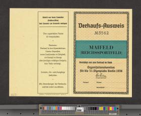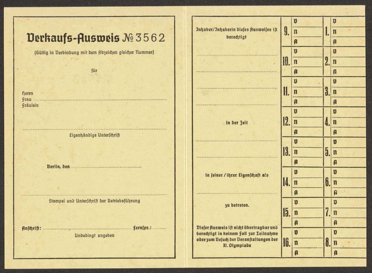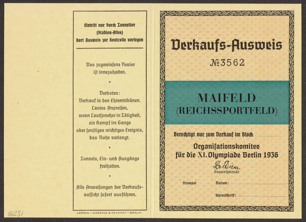 Berlin 1936, carte d'accréditation pour la vente sur le site de Maifeld.