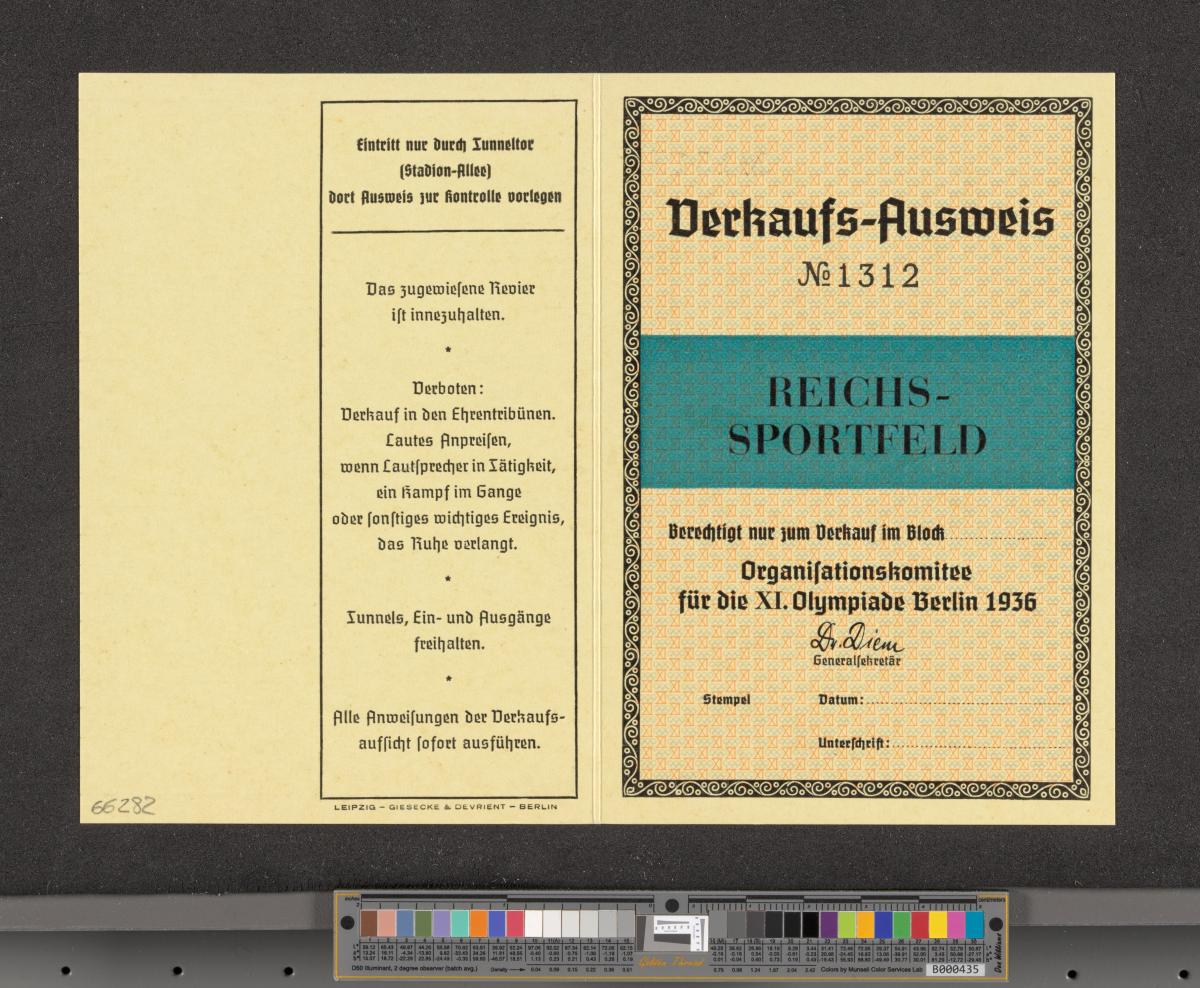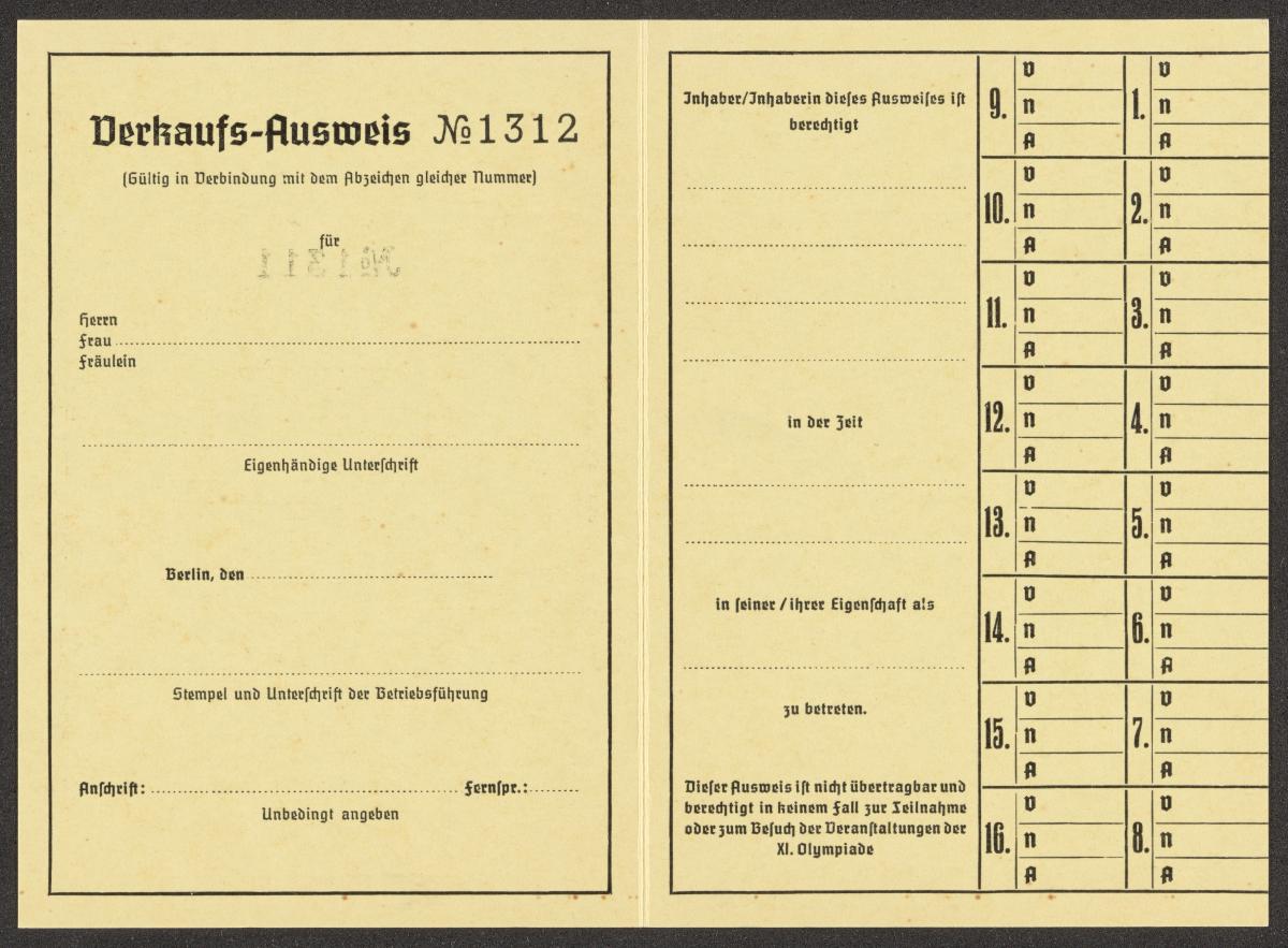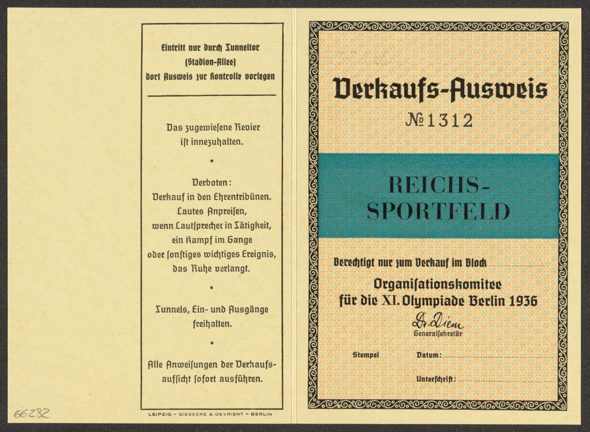 Berlin 1936, carte d'accréditation pour la vente au Reichssportfeld.