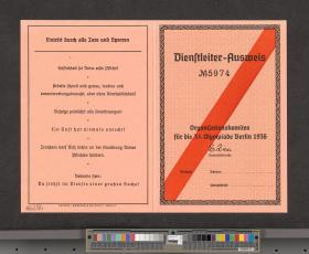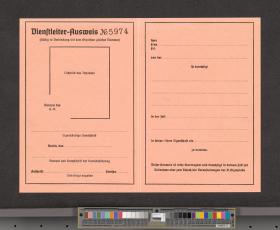 Carte d'accréditation vierge pour le personnel des services, texte: "Dienstleiter-Ausweis / N° 5974". Cette carte barrée d'un trait rouge était valable sur tous les sites.