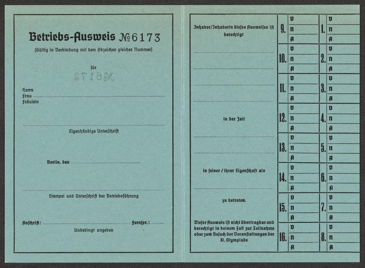 Berlin 1936, carte d'accréditation pour l'exploitation des gymnases.