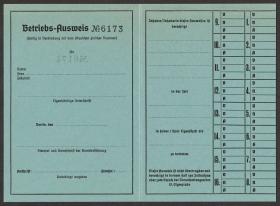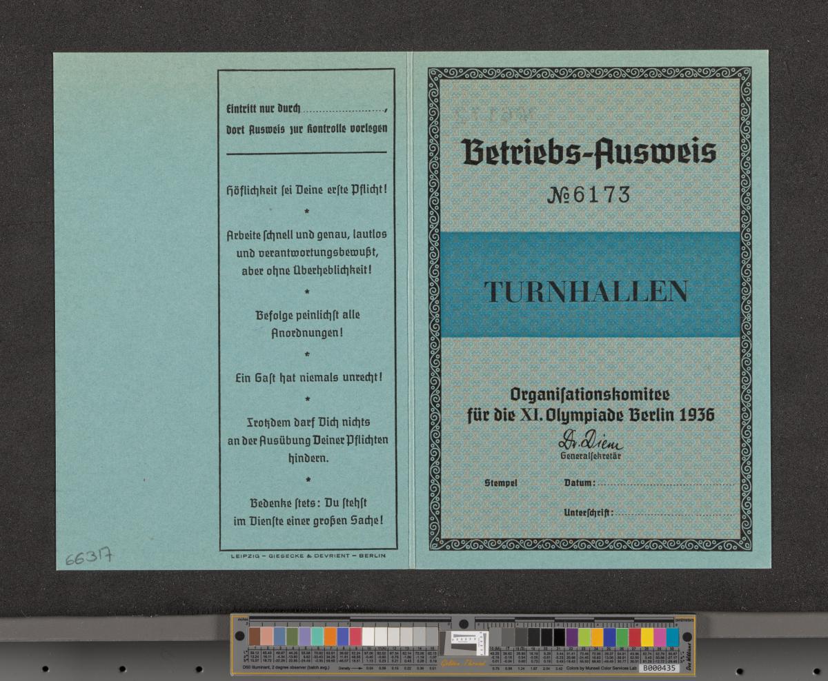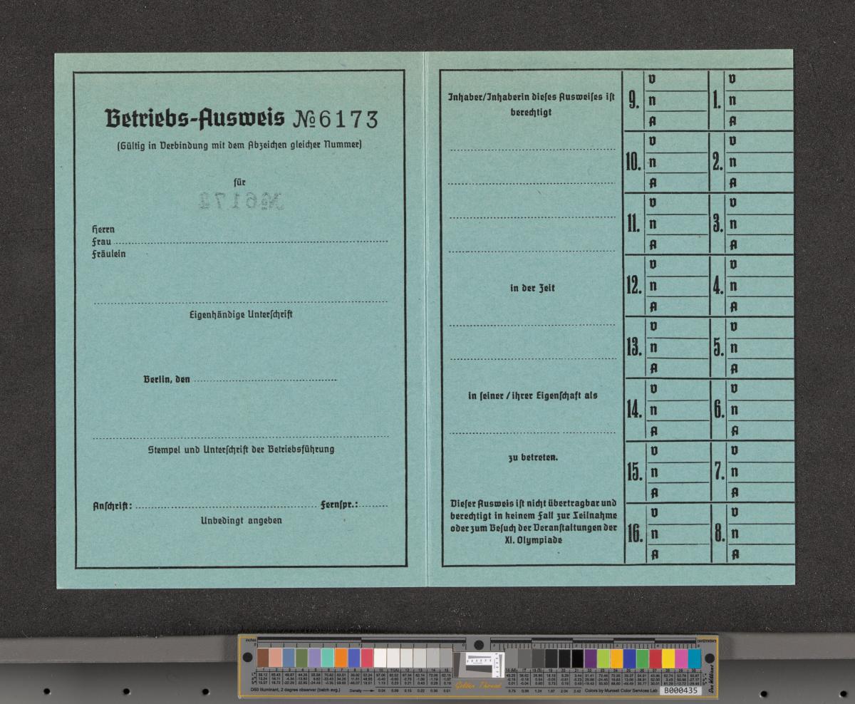 Carte d'accréditation vierge pour le personnel, texte: "Betriebs-Ausweis / N° 6173 / TURNHALLEN".