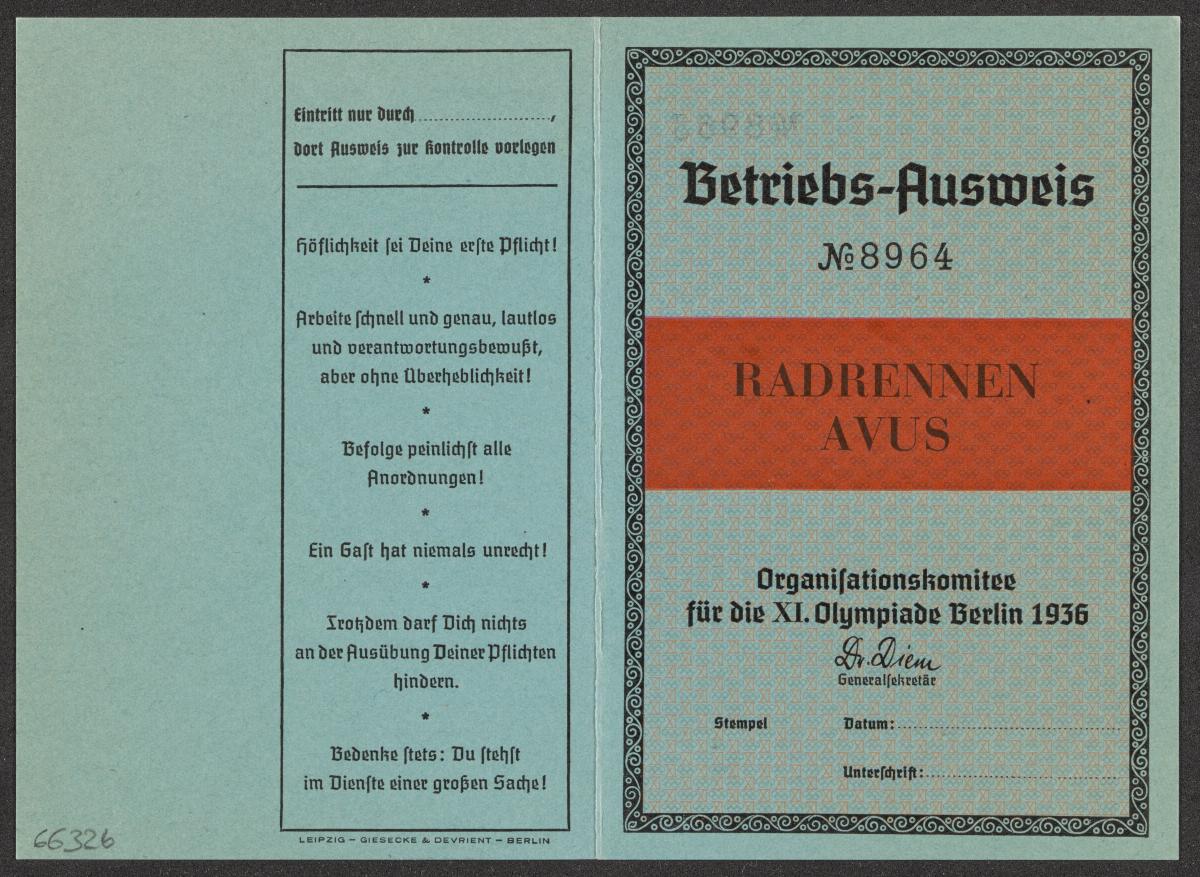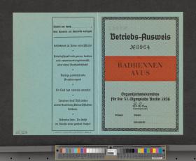 Berlin 1936, carte d'accréditation pour les opérations sur le circuit de l'AVUS.