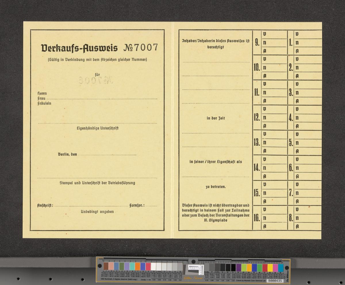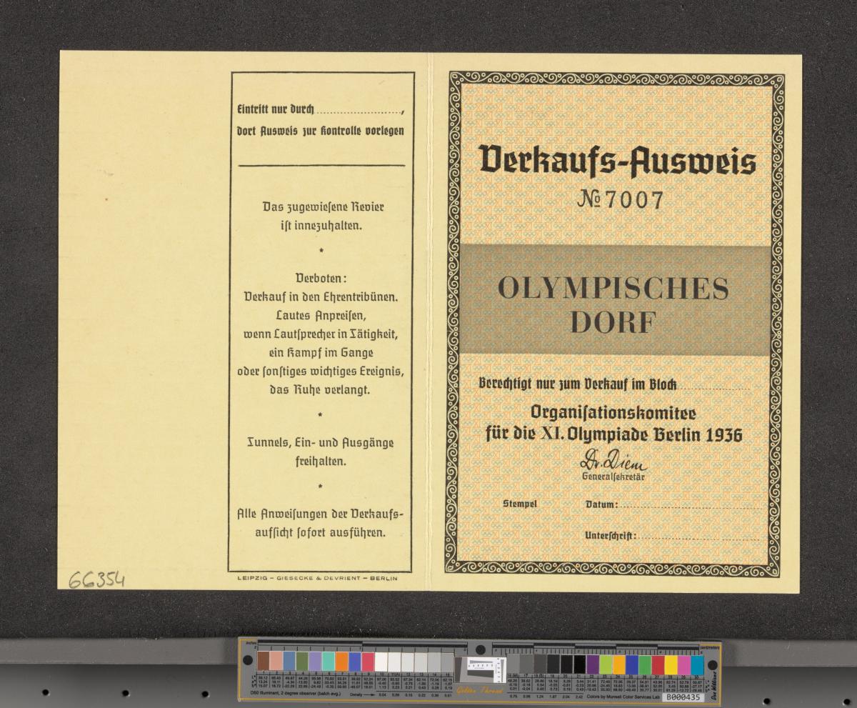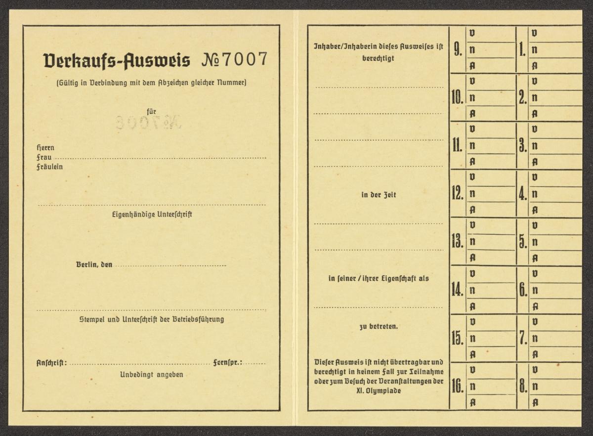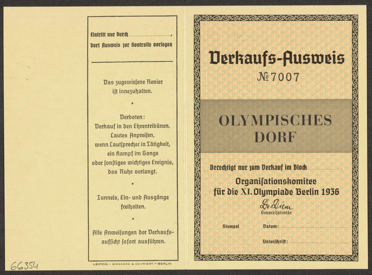 Berlin 1936, carte d'accréditation pour la vente au village olympique.