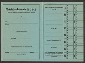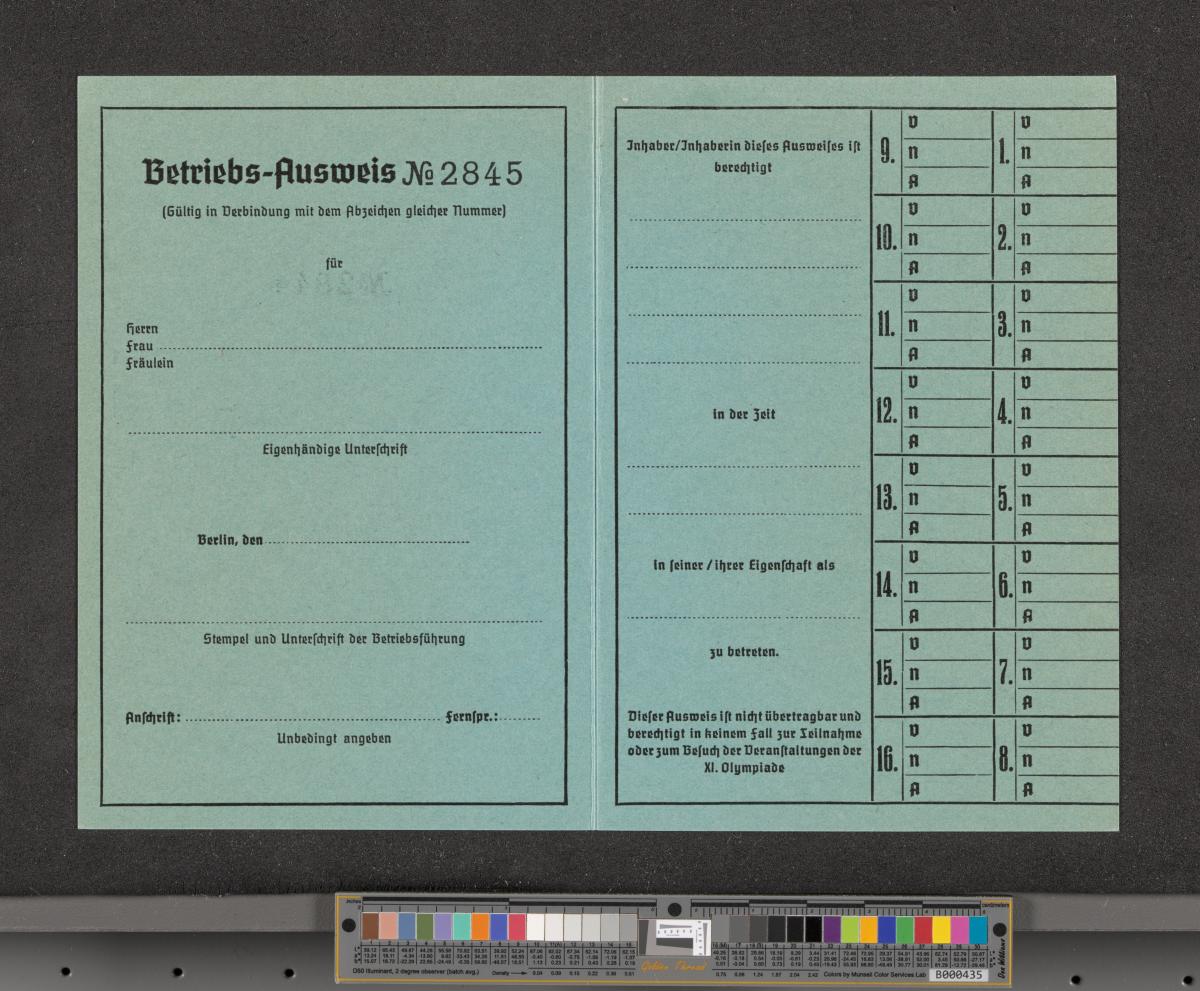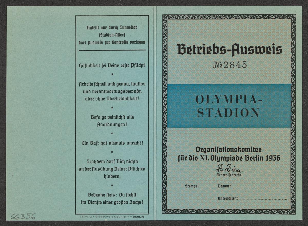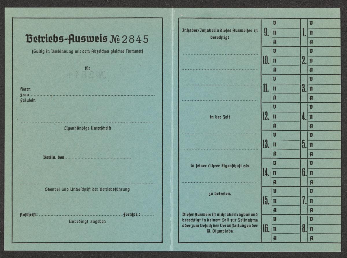 Carte d'accréditation vierge pour les chargés des opérations, texte: "Betriebs-Ausweis / N° 2845 / OLYMPIA- / STADION".