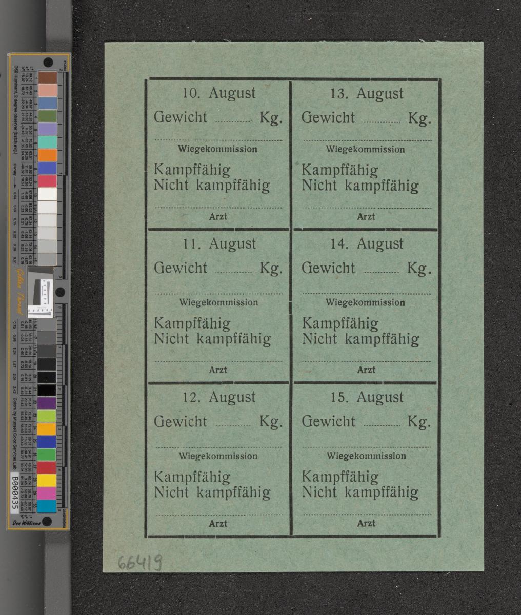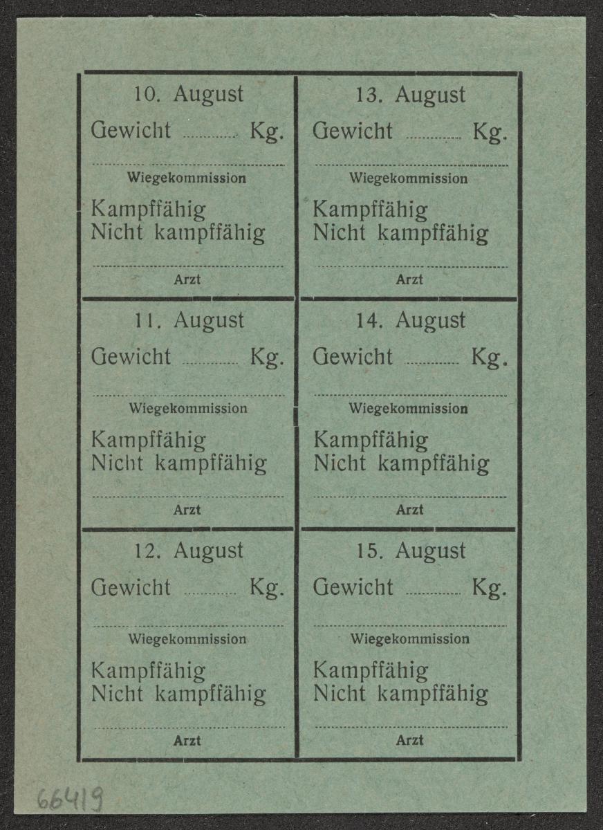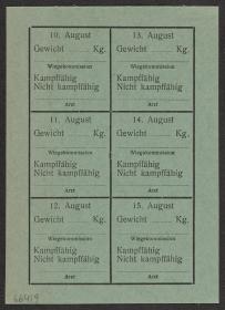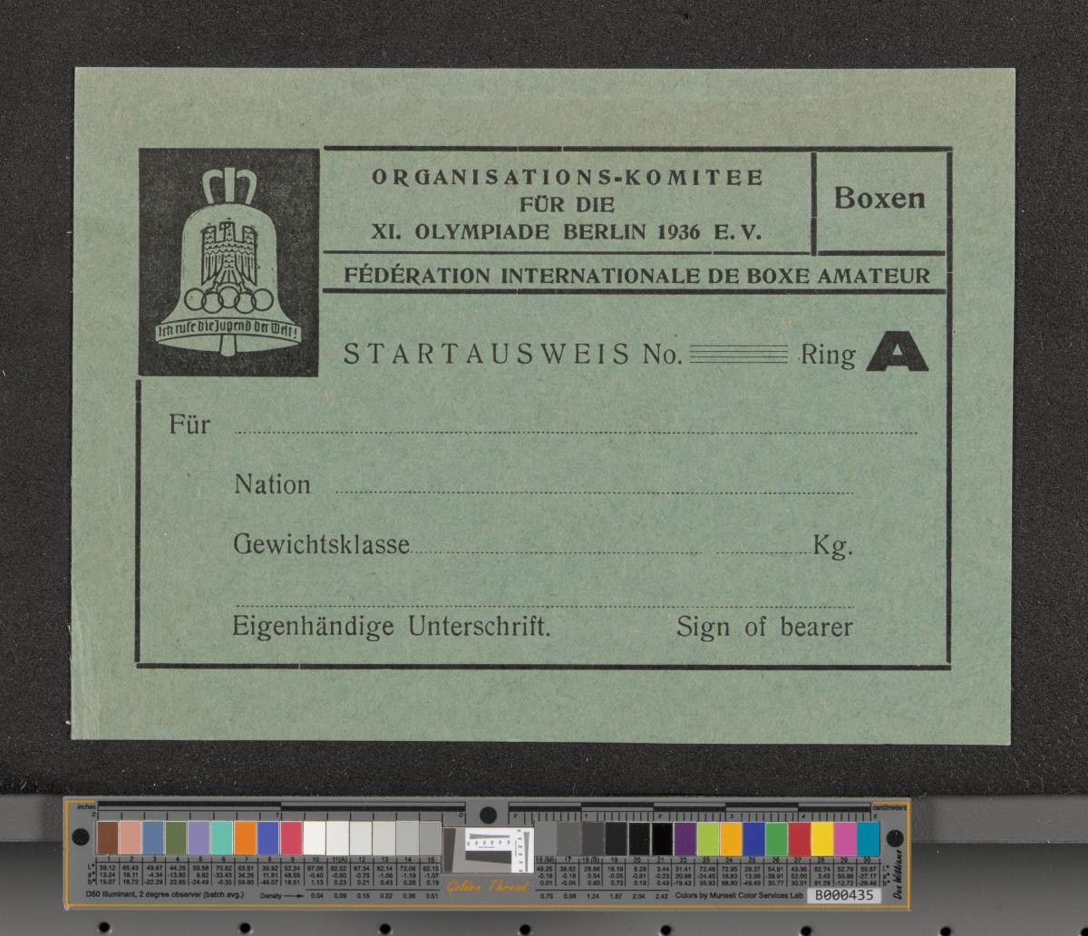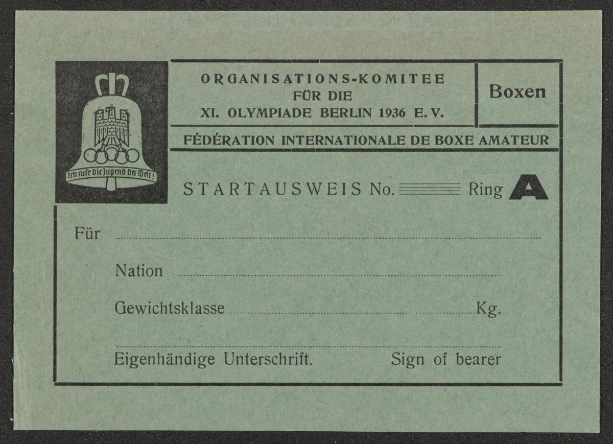 Carte d'accréditation vierge avec l'emblème des Jeux. Texte: "ORGANISATIONS-KOMITEE / FÜR DIE / XI. OLYMPIADE BERLIN 1936 E. V. / Boxen / FÉDÉRATION INTERNATIONALE DE BOXE AMATEUR / STARTAUSWEIS N° [...] Ring A".