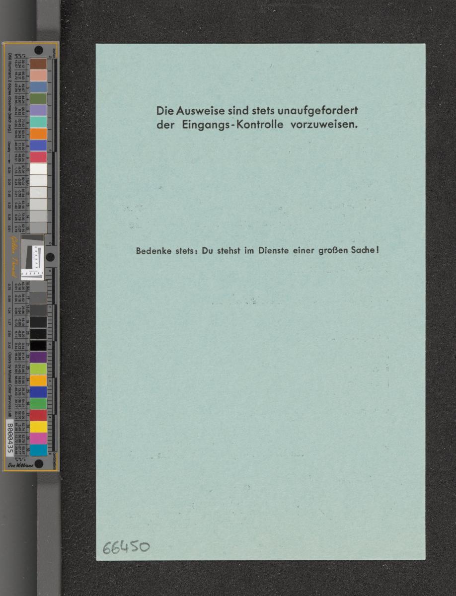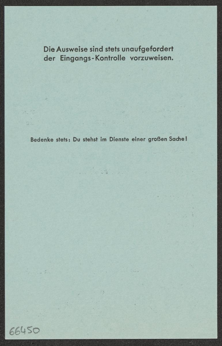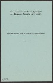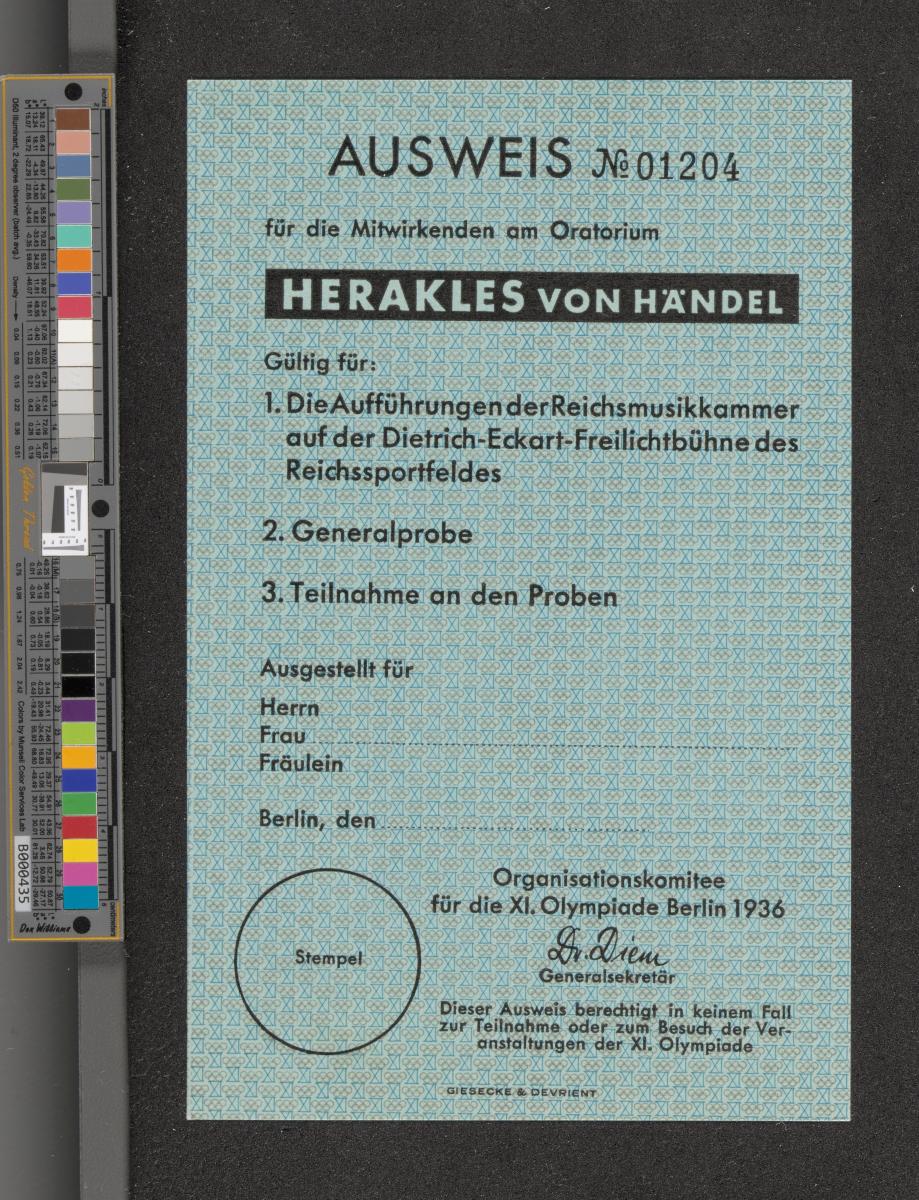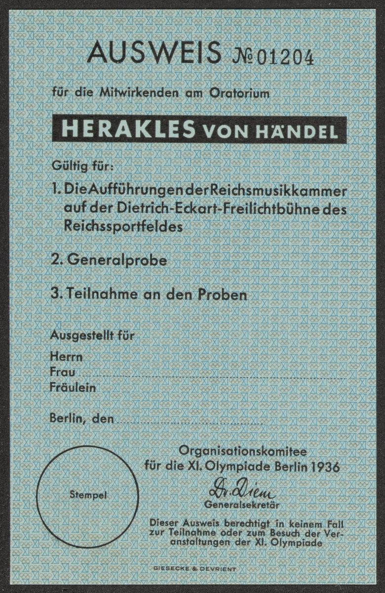 Berlin 1936, carte d'accréditation pour les musiciens du spectacle Herakles de Handel à l'Oratorium.