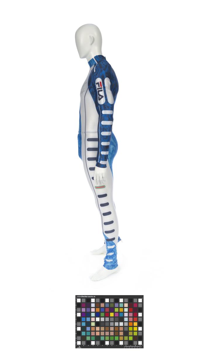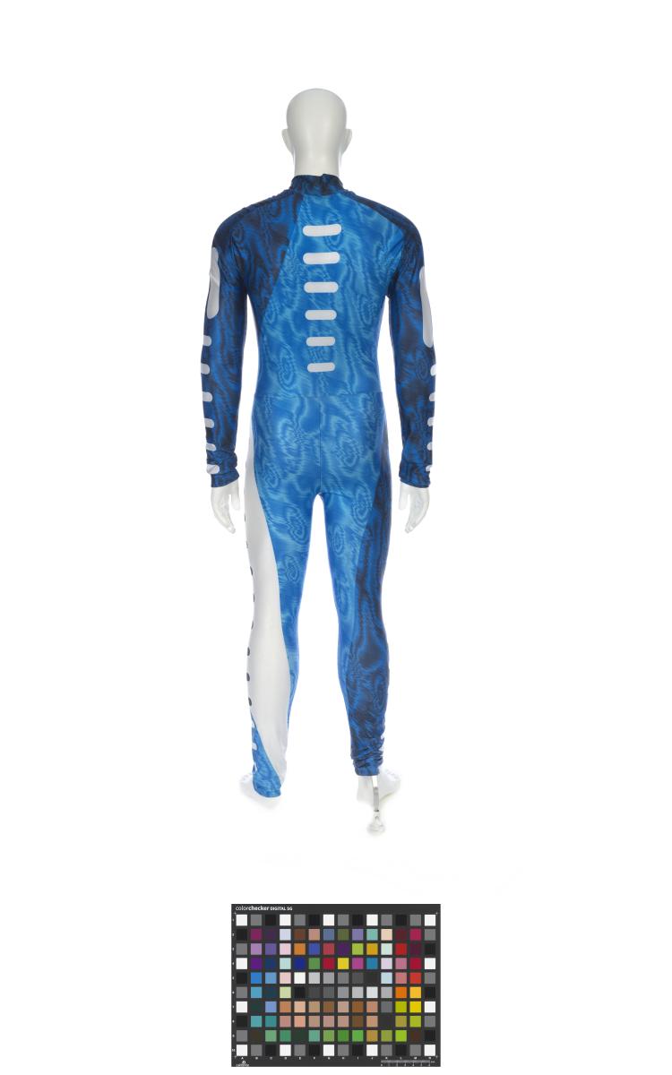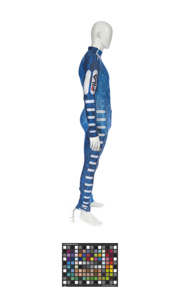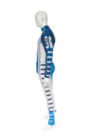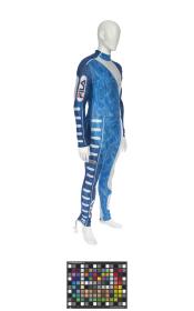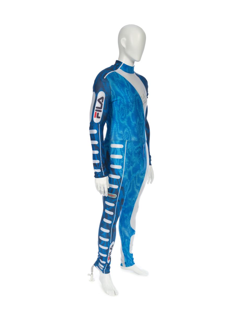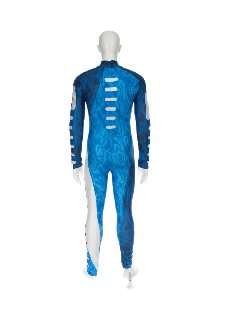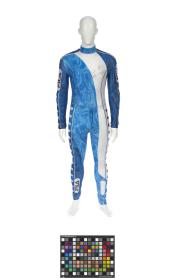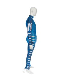 Combinaison bleue et blanche dédicacée sur la poitrine. Deux fermetures éclaire sur les épaules. Taille M (USA).