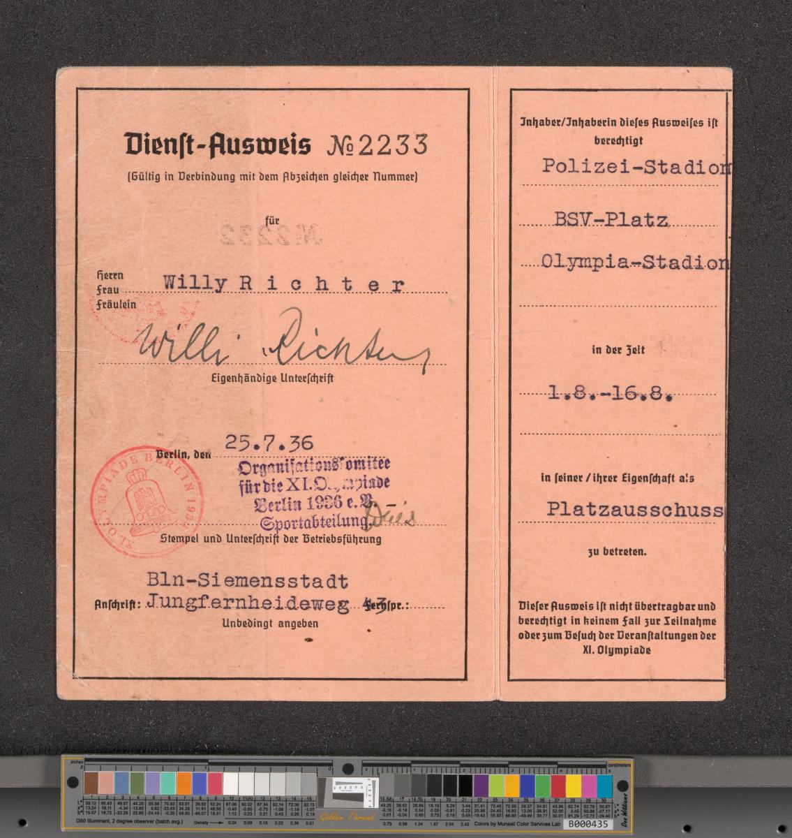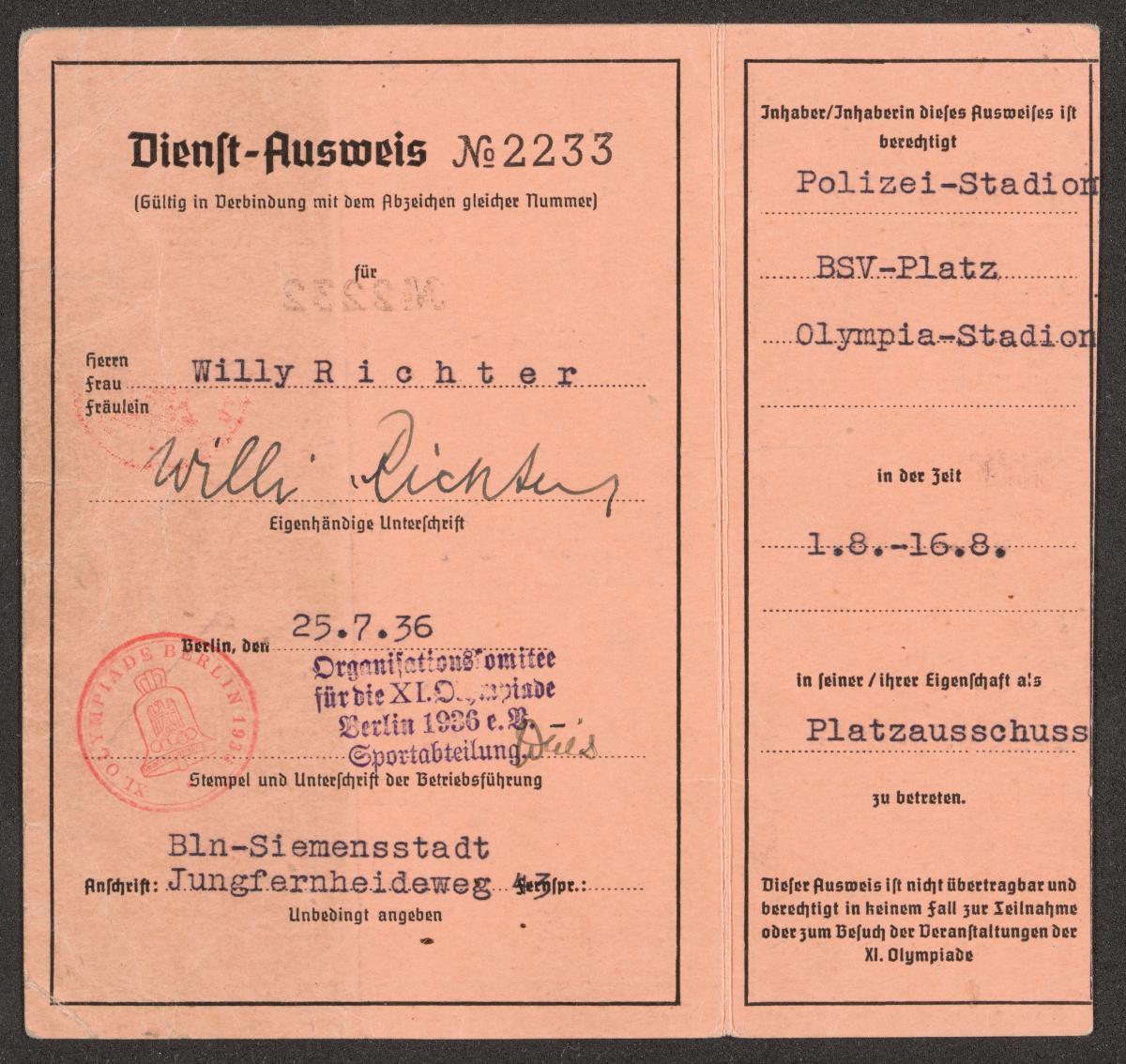 Carte d'accréditation au nom de Willy Richter pour les chargés des services, texte: "Dienst-Ausweis / N° 2233 / OLYMPIA- / STADION / Polizeistadion, BSV Platz".