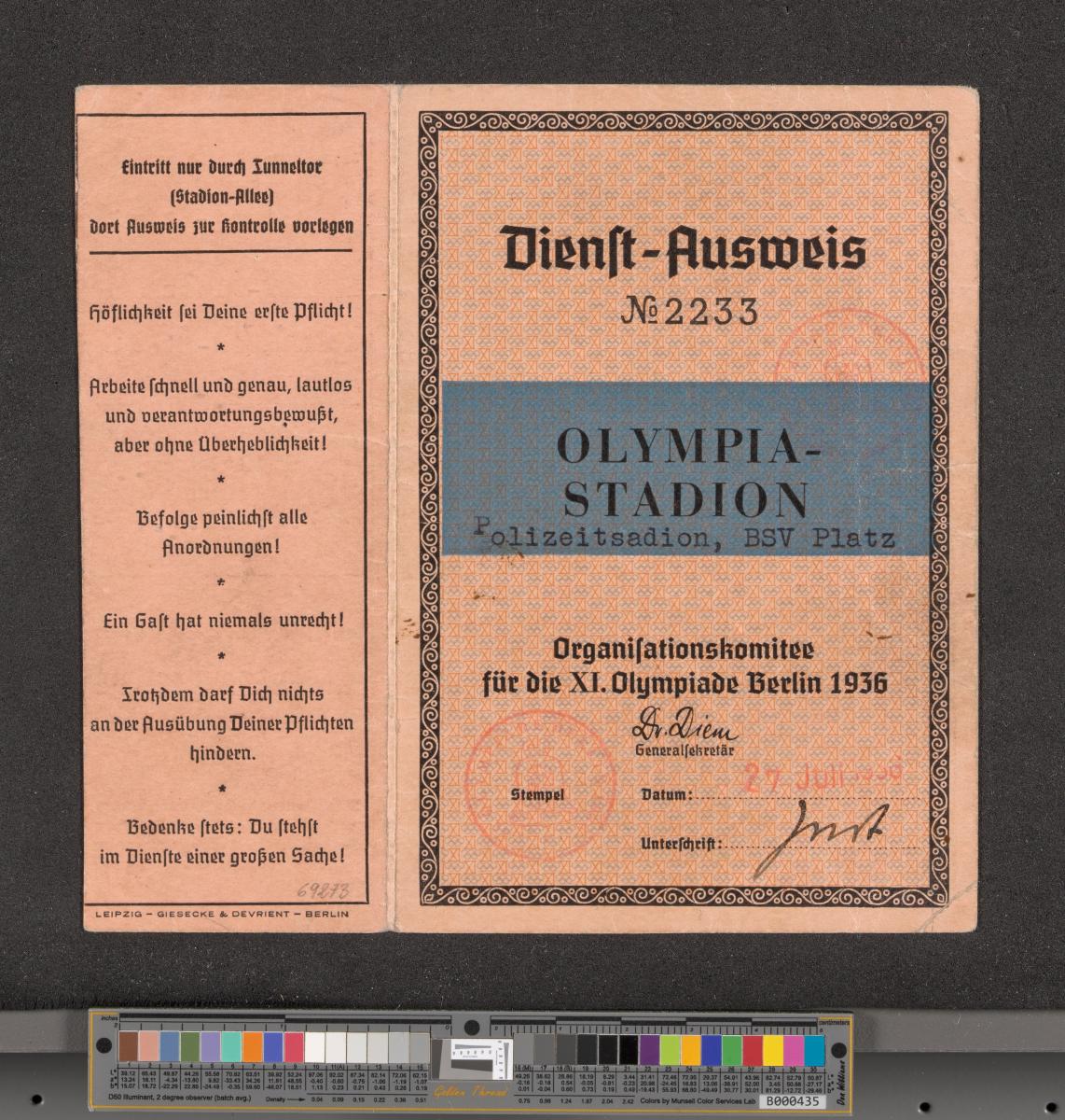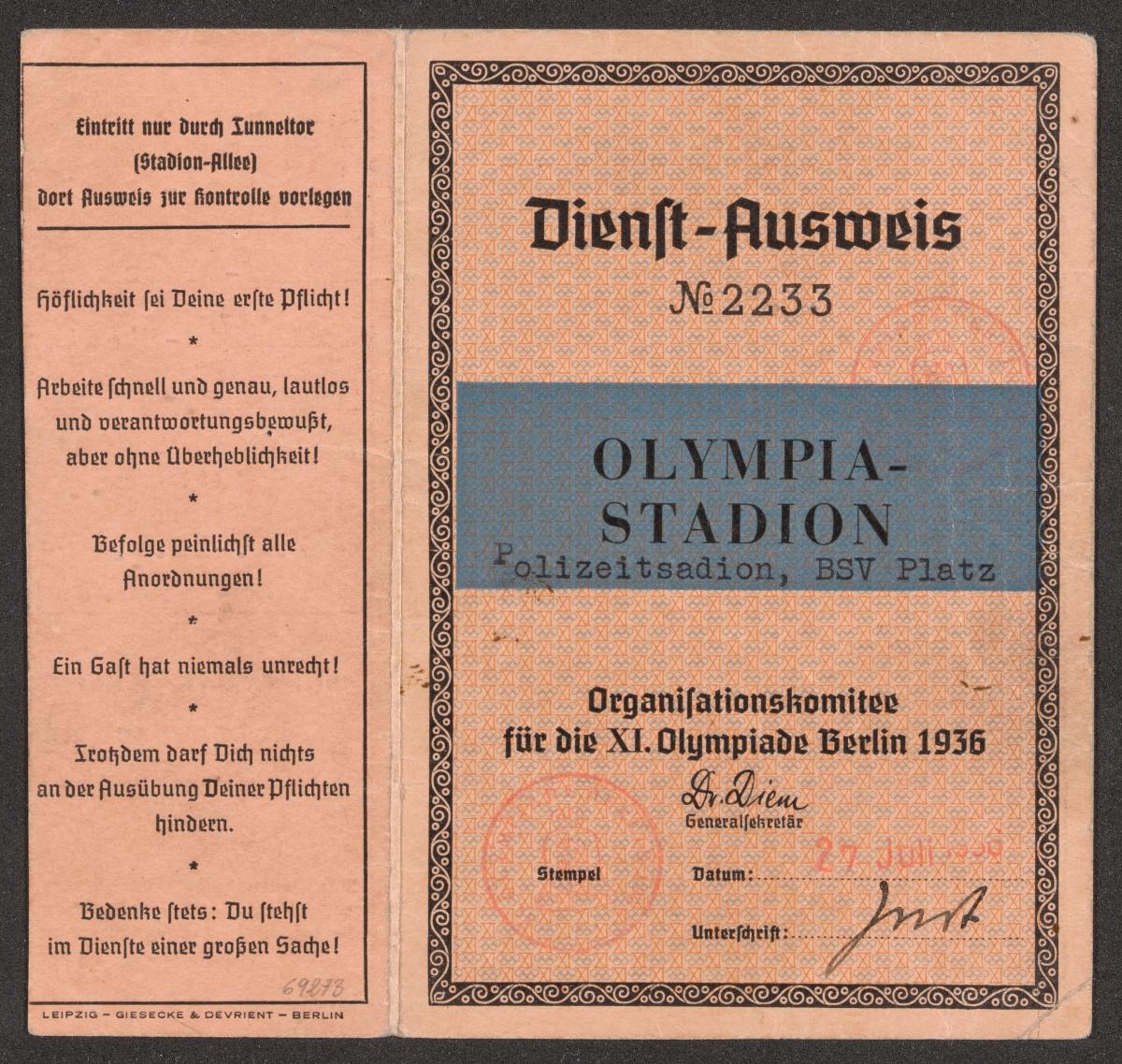 Berlin 1936, carte d'accréditation pour le service au stade olympique.