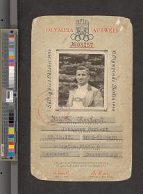 Texte en allemand "Olympia Ausweis". Photo, signature et adresse.