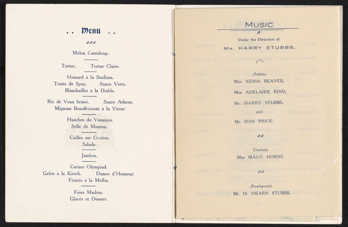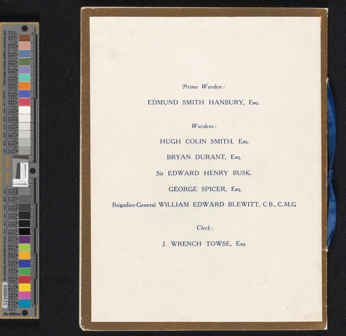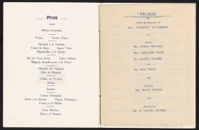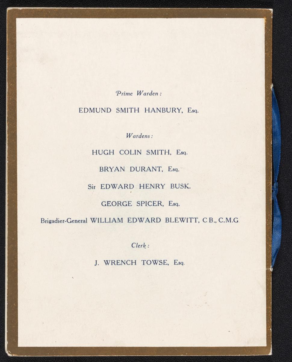 Programme sous la forme d'un livret d'un dîner au "Fishmonger's Hall" composé du menu, du programme musical ainsi que d'un répertoire de chansons. A la fin, le plan de la salle avec la disposition des invités.