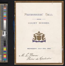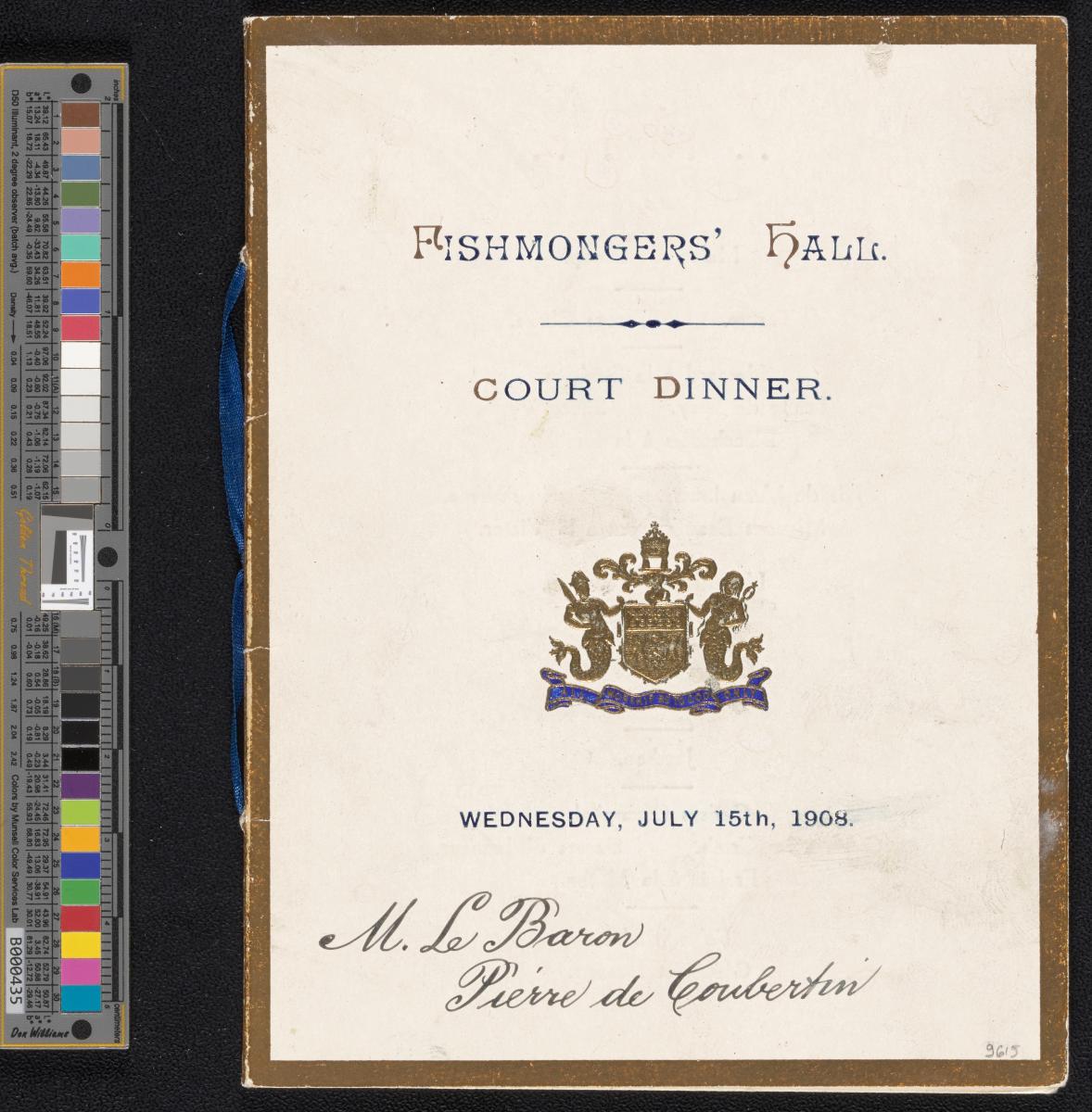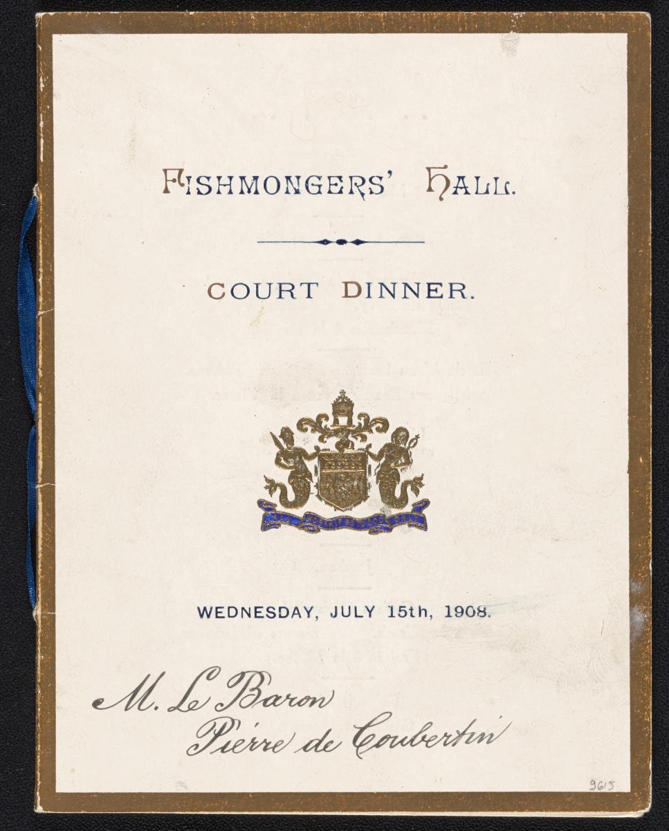 Londres 1908, invitation à un dîner au Fishmonger's Hall adressée au baron Pierre de Coubertin.