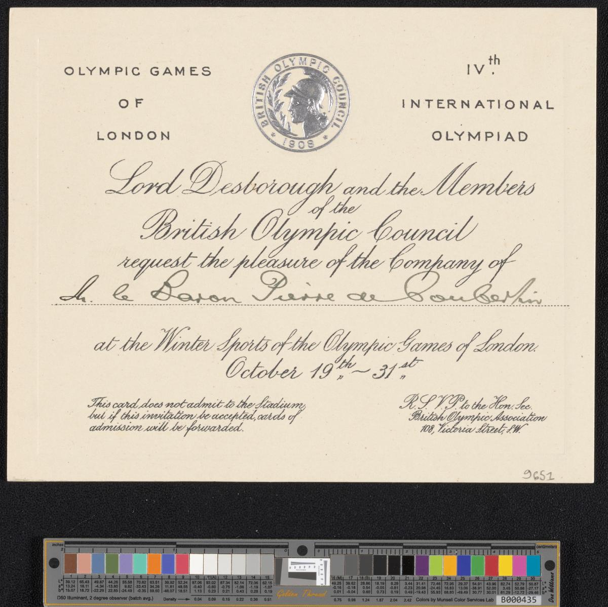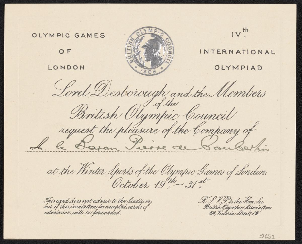 Invitation aux sports d'hiver des Jeux olympiques de Londres, du 19 au 31 octobre 1908, par Lord Desborough et les membres du British Olympic Council. Emblème des Jeux avec Athéna et une branche de laurier. Légende "Lord Desborough and the Members of the British Olympic Council request the pleasure of the Company of M. le Baron Pierre de Coubertin at the Winter Sports of the Olympic Games in Lonson, October 19th - 31st".