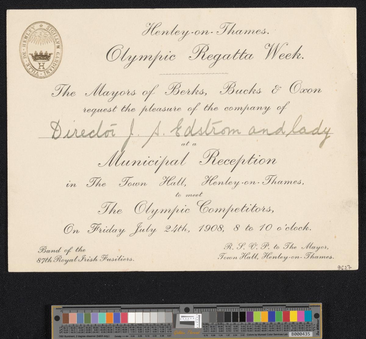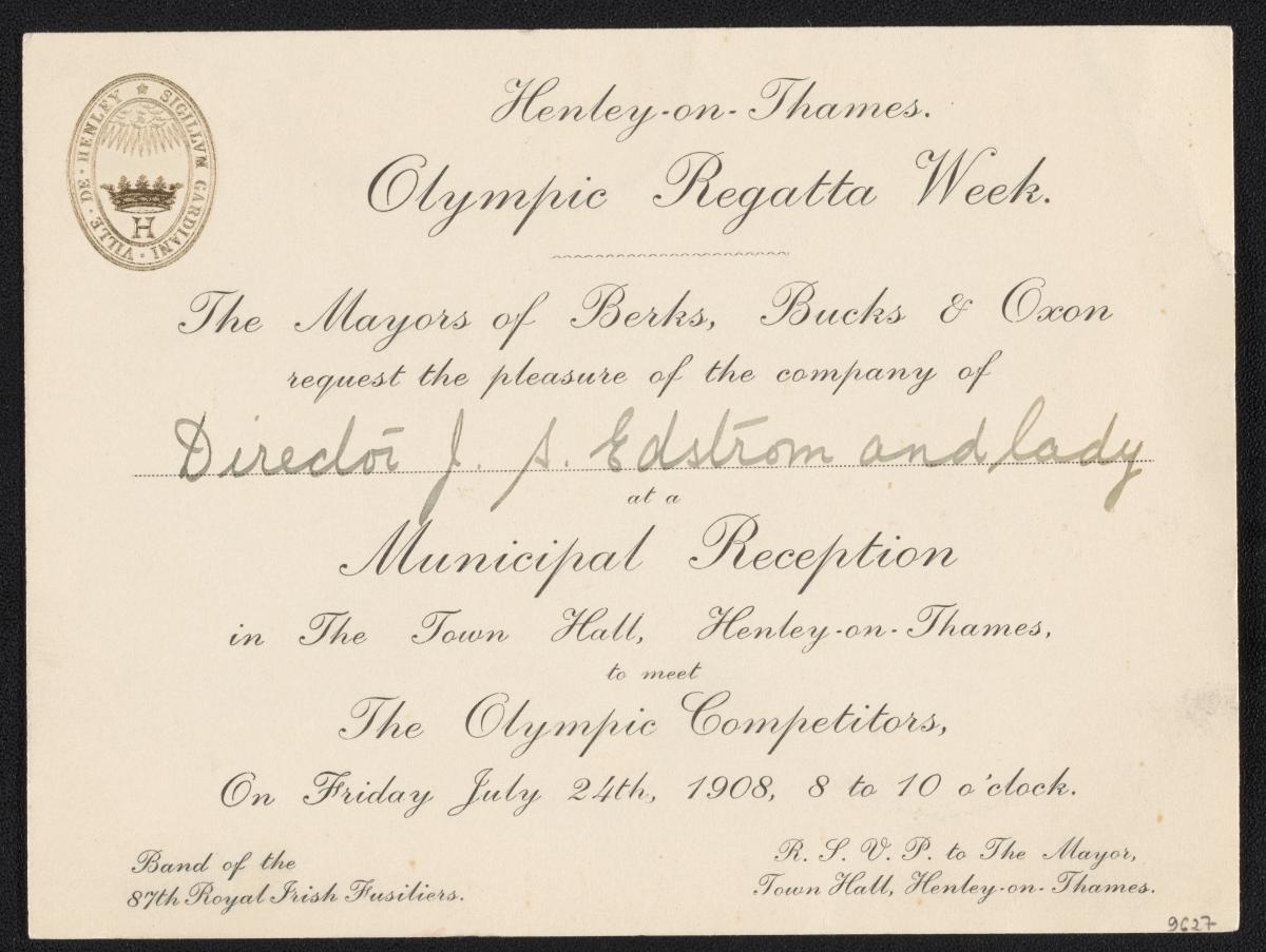 Invitation des maires de Berks, Bucks et Oxon destinée à rencontrer les participants aux Jeux. Armoiries de la ville en haut à gauche, texte: "Henley-on-Thames, / Olympic Regatta Week. / The Mayors of Berks, Bucks & Oxon / request the pleasure of the company of / Director J. S. Edstrom and lady / at a / Municipal Reception / in The Town Hall, Henley-on-Thames, / to meet / The Olympic Competitors, / On Friday July 24th, 1908, 8 to 10 o'clock.".