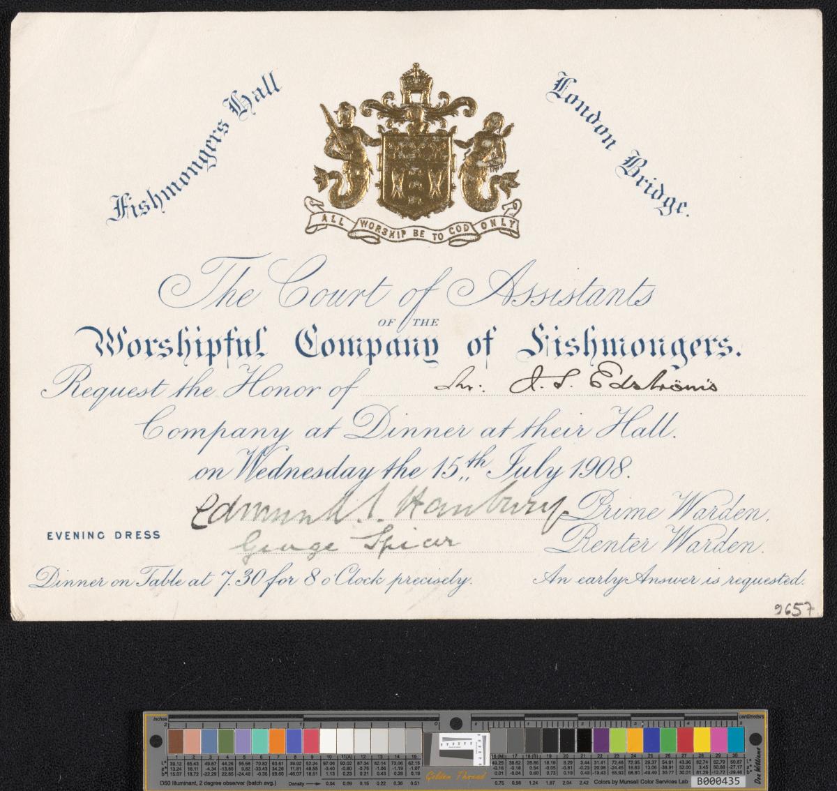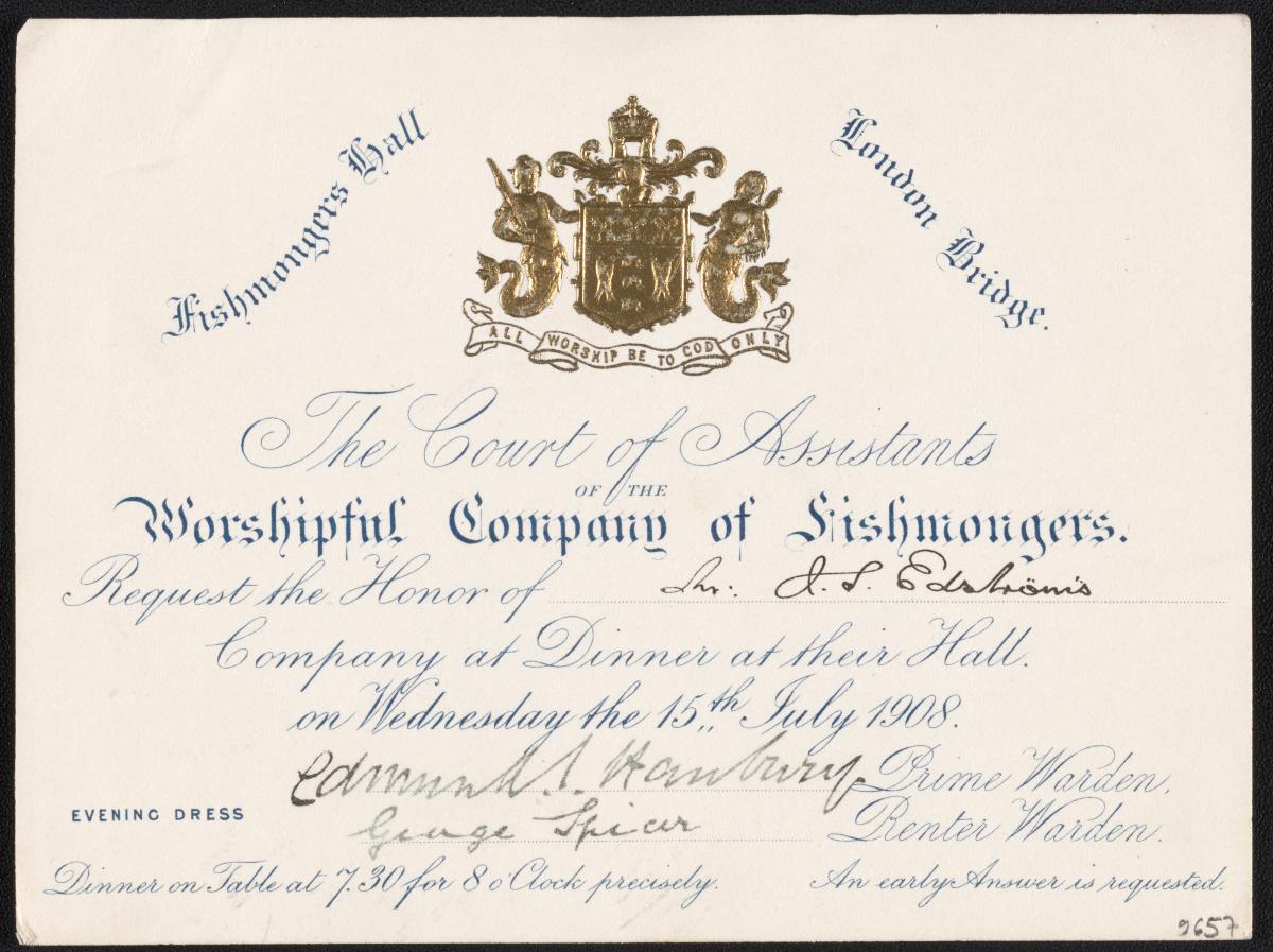 Londres 1908, invitation à un dîner au Fishmonger's Hall le 15 juillet 1908.