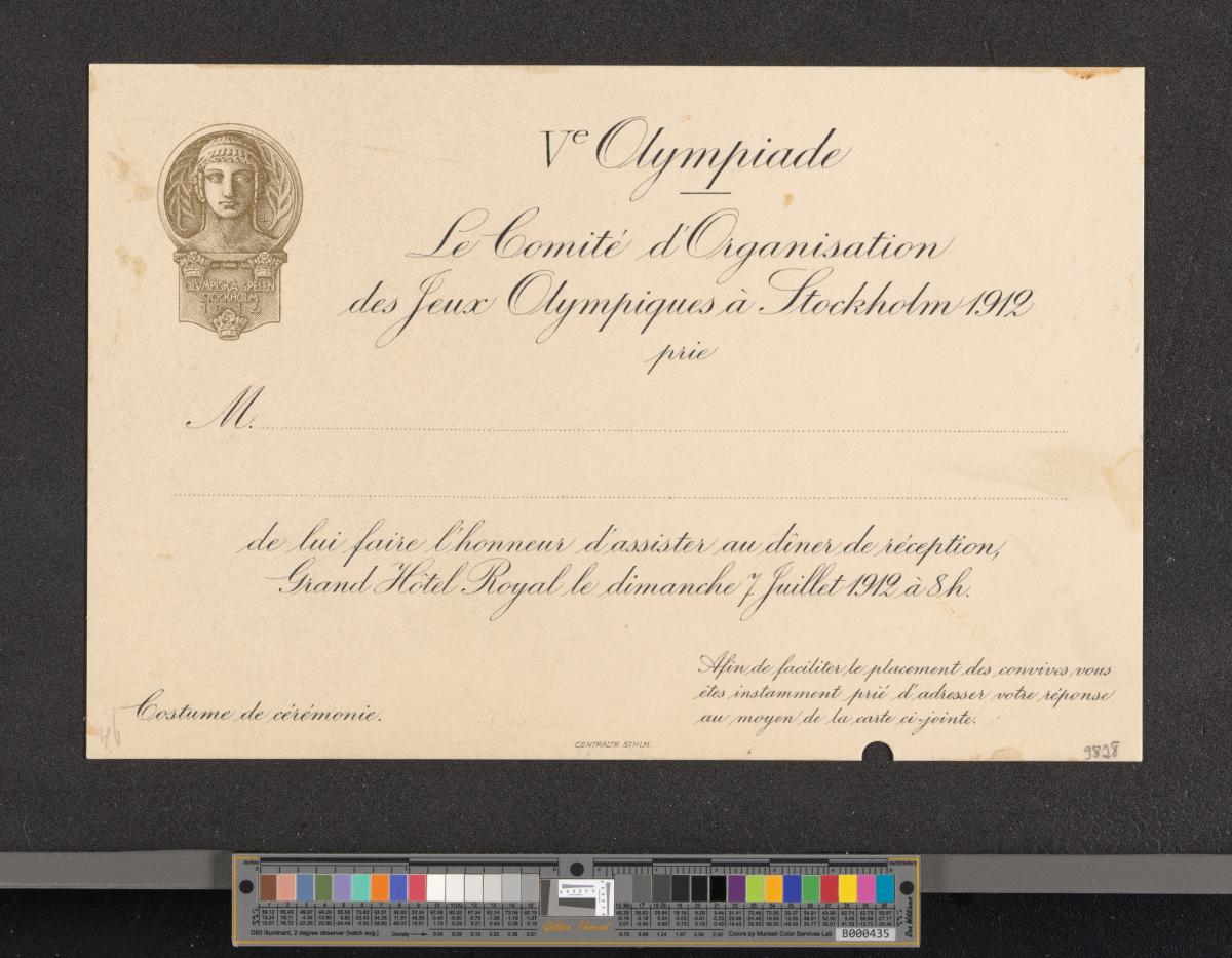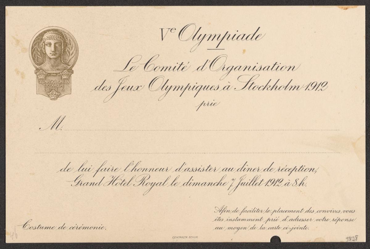 Carte d'invitation vierge avec en en-tête l'insigne de fonction réservé aux membres du Comité d'organisation. Texte: "Ve Olympiade / Le Comité d'Organisation / des Jeux Olympiques à Stockholm 1912 / prie / M. [...] / de lui faire l'honneur d'assister au dîner de réception, / Grand Hôtel Royal le dimanche 7 juillet 1912 à 8h.".