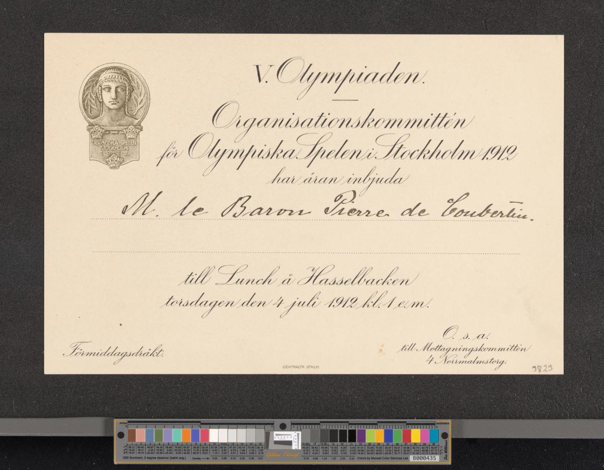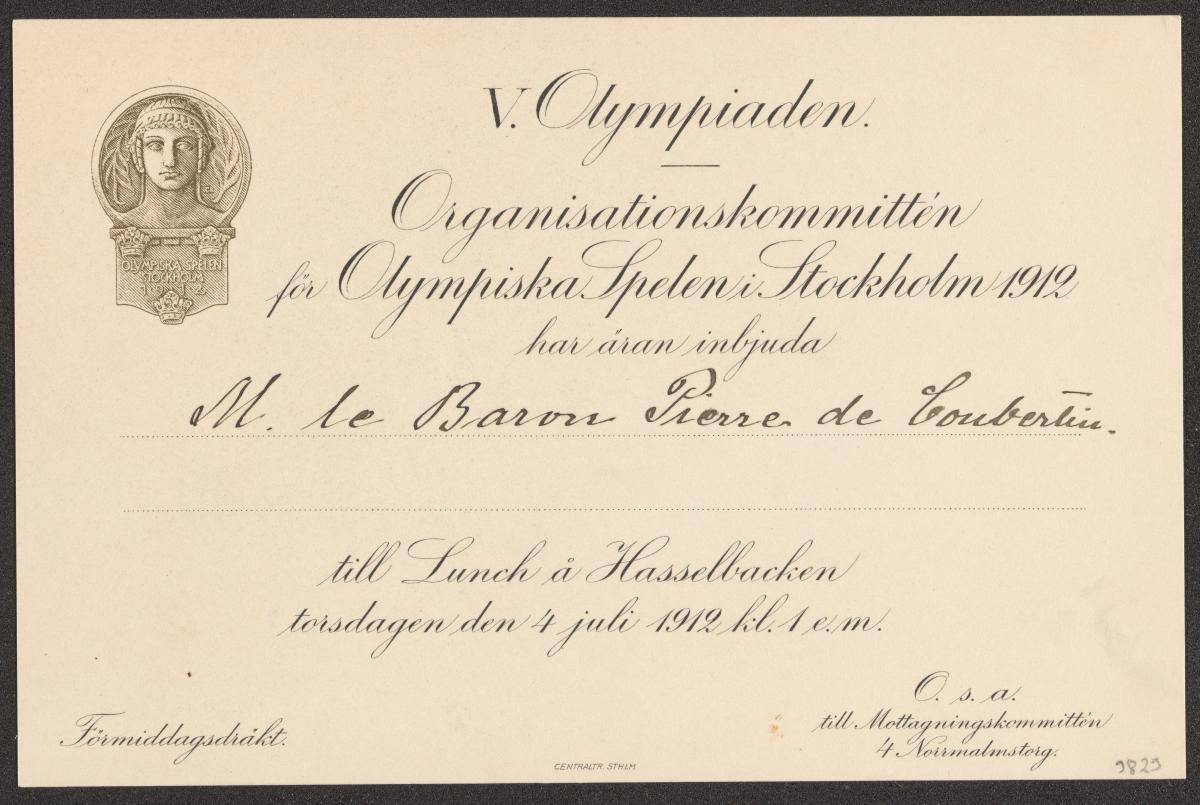 Carte d'invitation avec en en-tête l'insigne de fonction réservé aux membres du Comité d'organisation. Texte: "V. Olympiaden. / Organisationskommittén / för Olympiska Spelen i Stockholm 1912 / har äran inbjuda / M. le Baron Pierre de Coubertin / till Lunch a Hasselbacken / torsdagen den 4 juli 1912 kl. 1 e.m.".